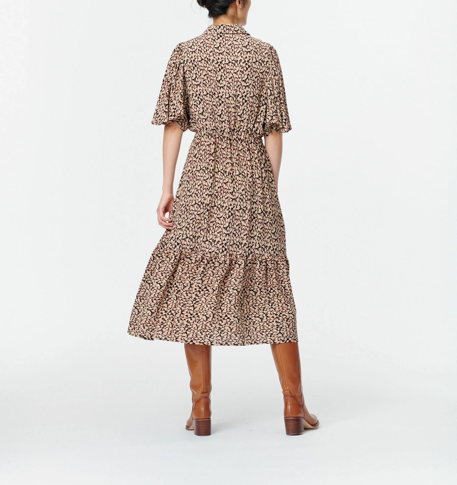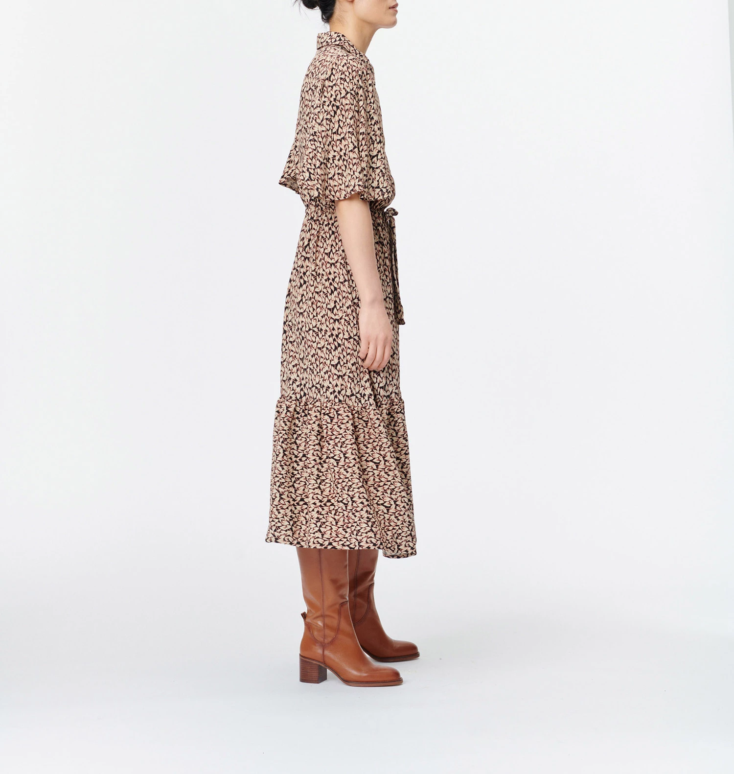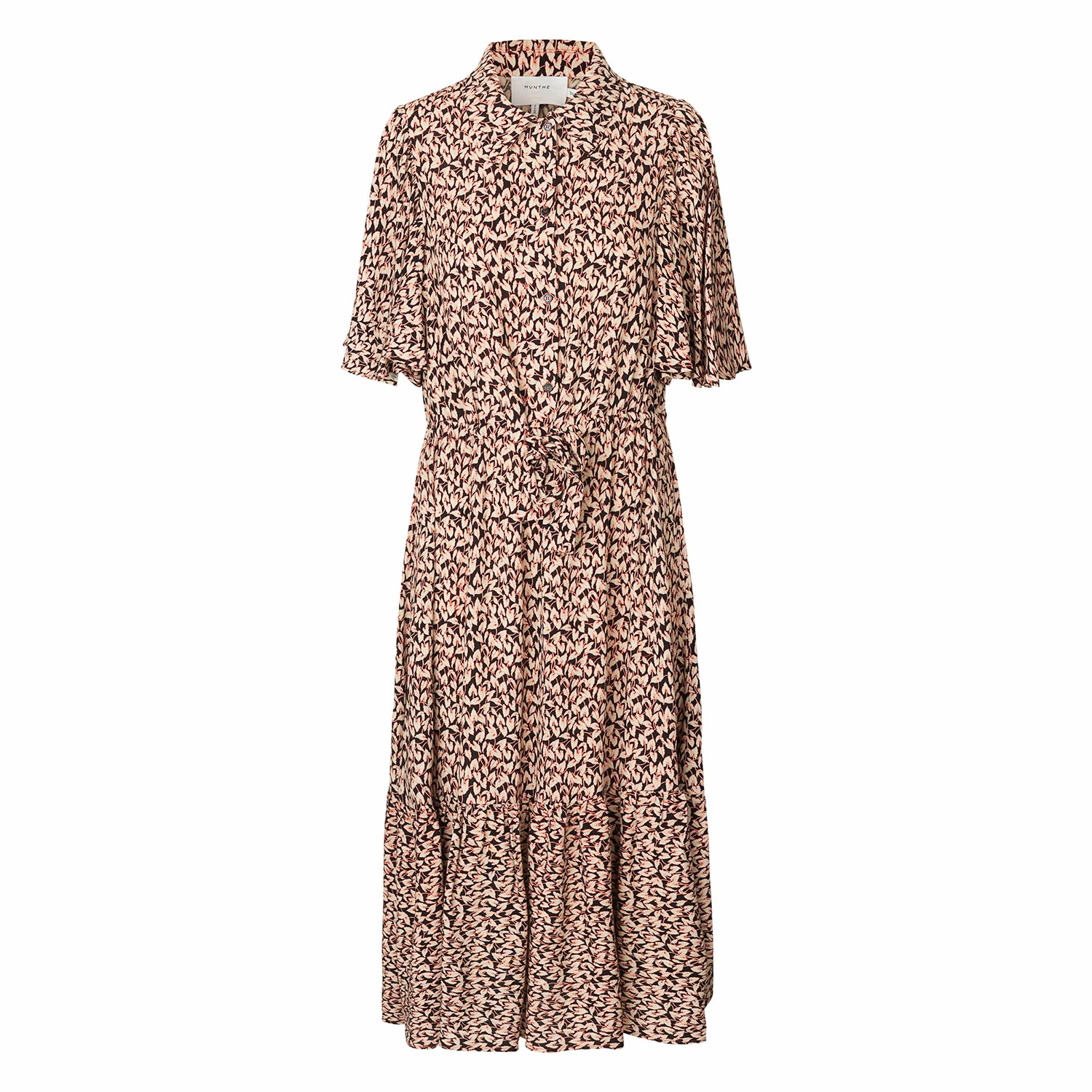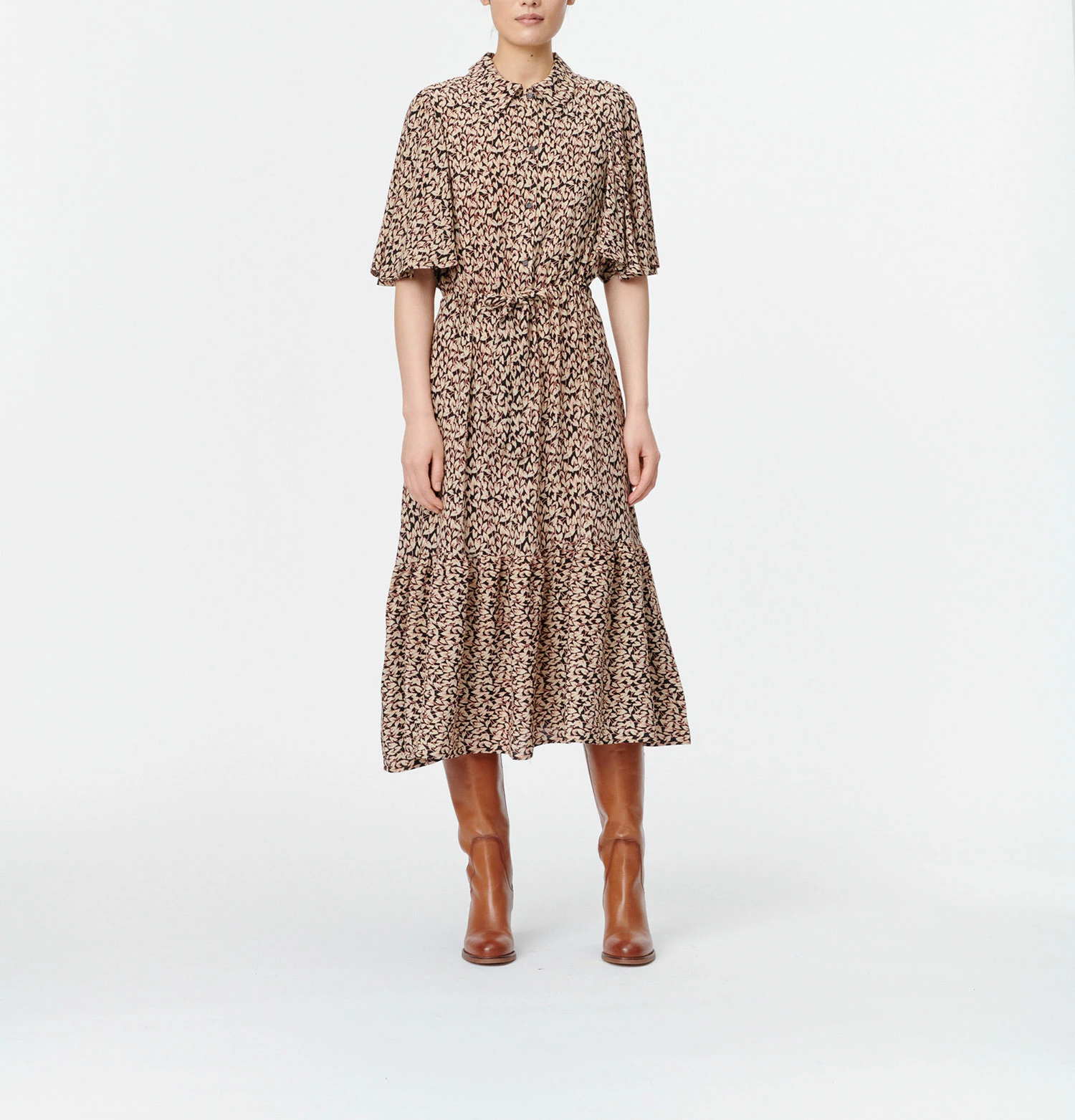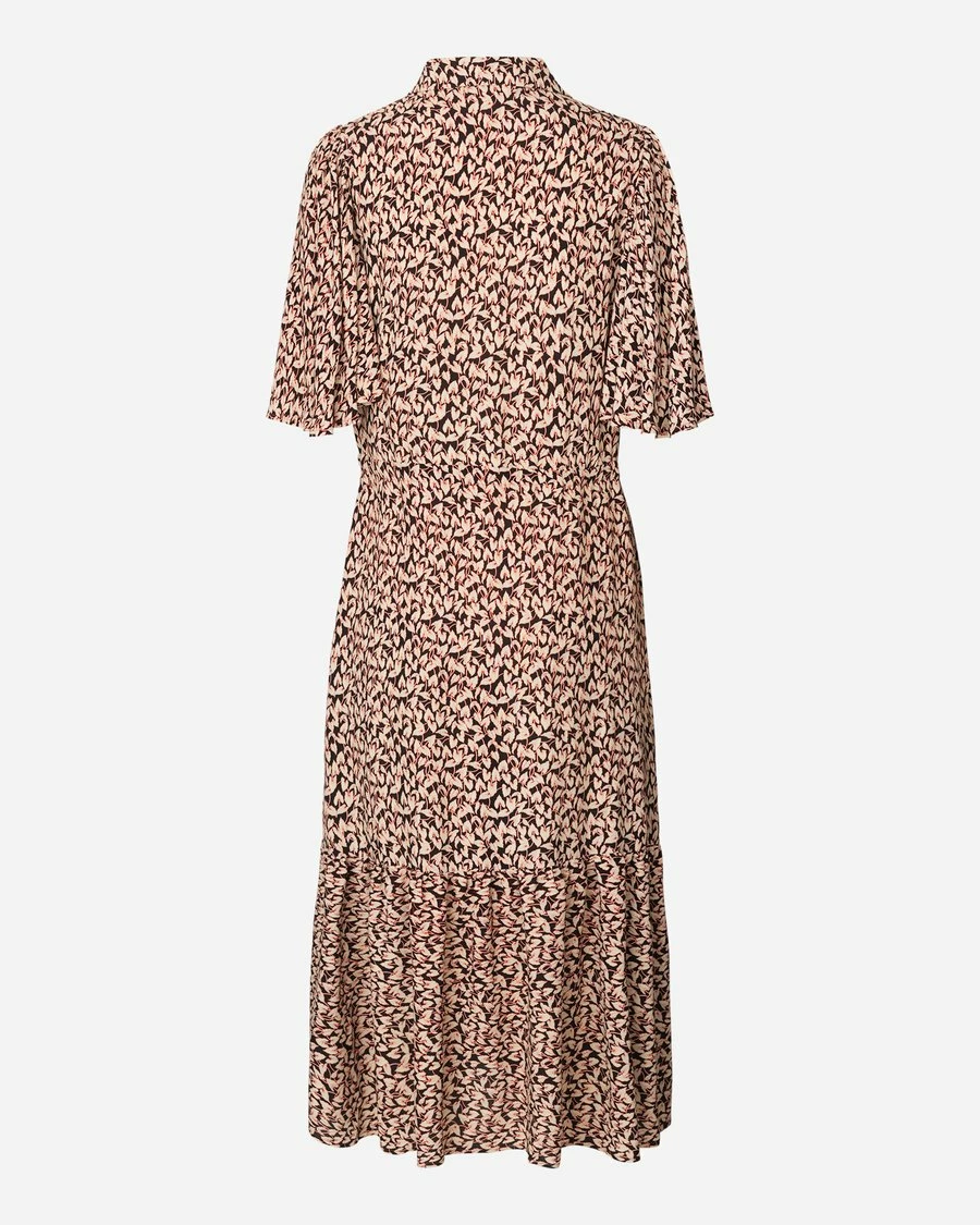Long dress in Ecovero viscose, which is a sustainable viscose that meets high ecofriendly standards throughout the production process and comes from sustainable wood and paper. The dress has a small collar, buttons in the front and short ruffle sleeves. It is shaped with a wrinkle waist and tied with a soft string. Flowy skirt with a cutting the bottom. Without lining.