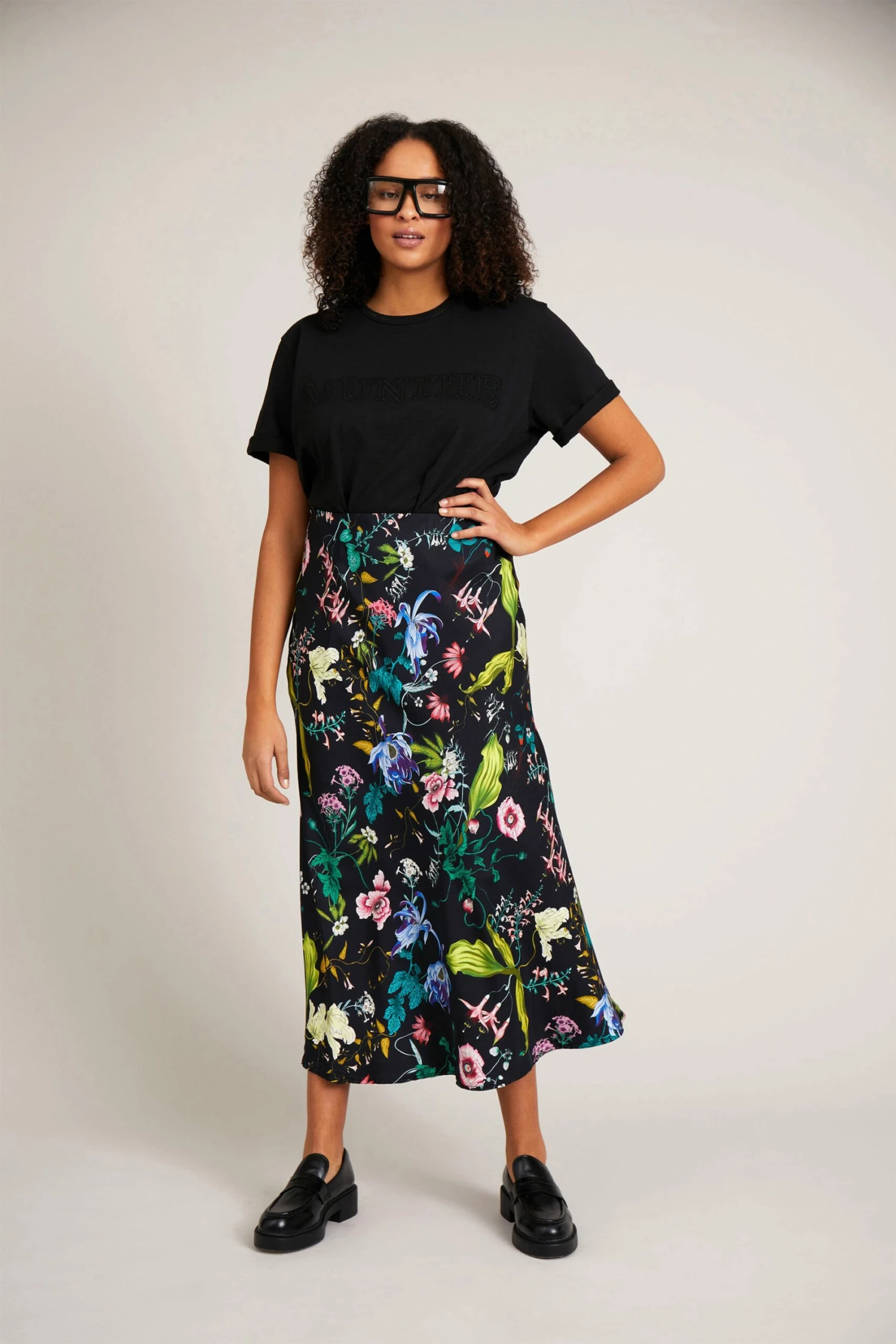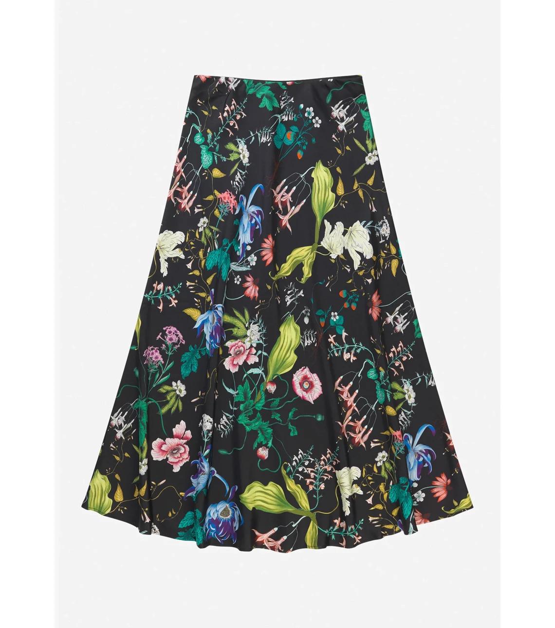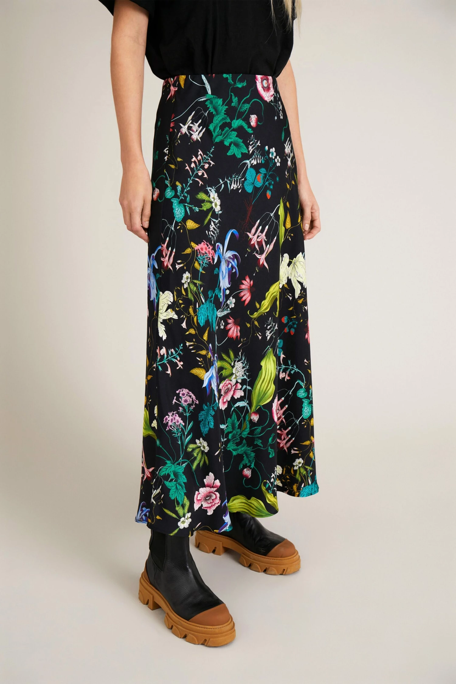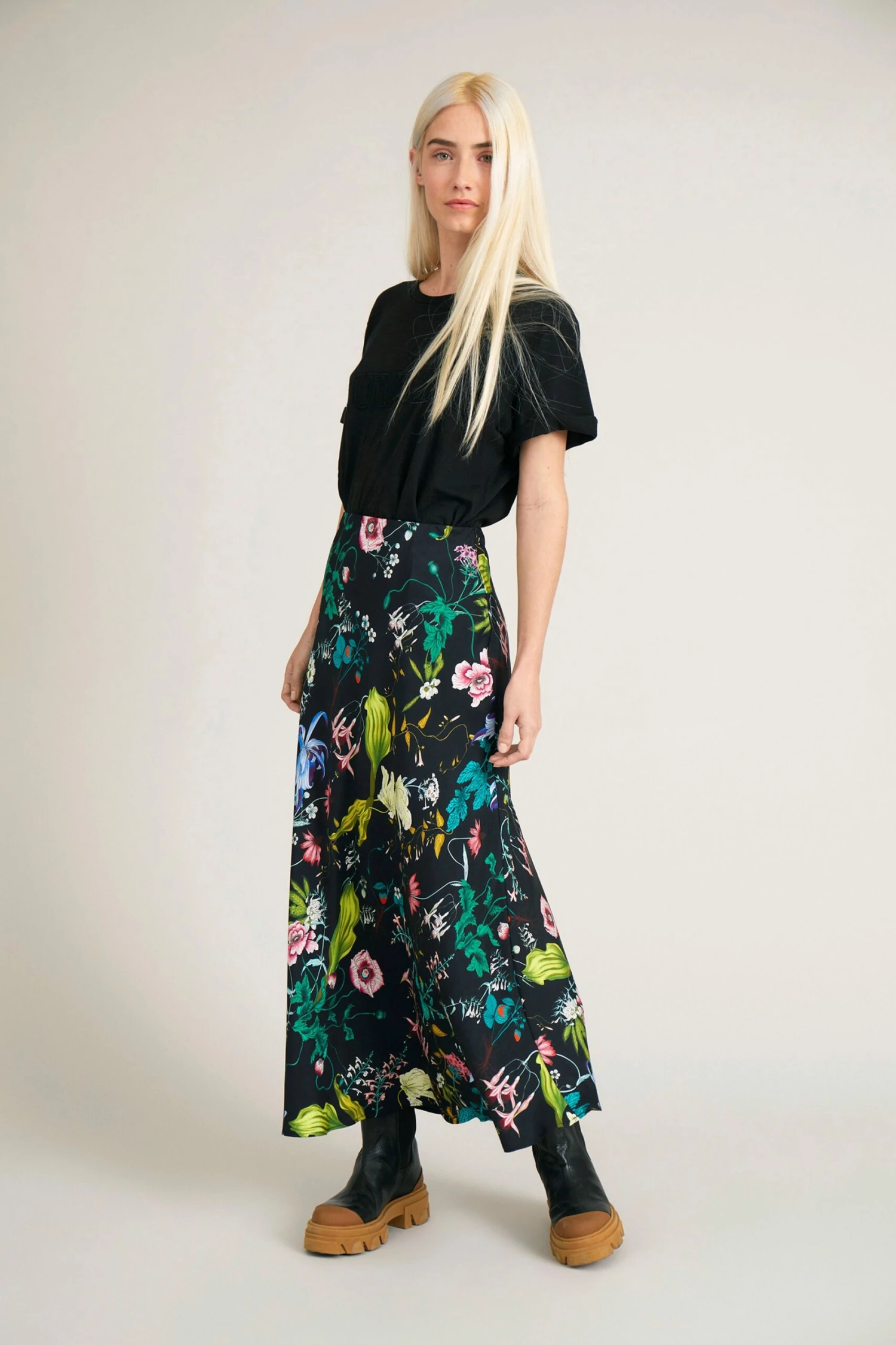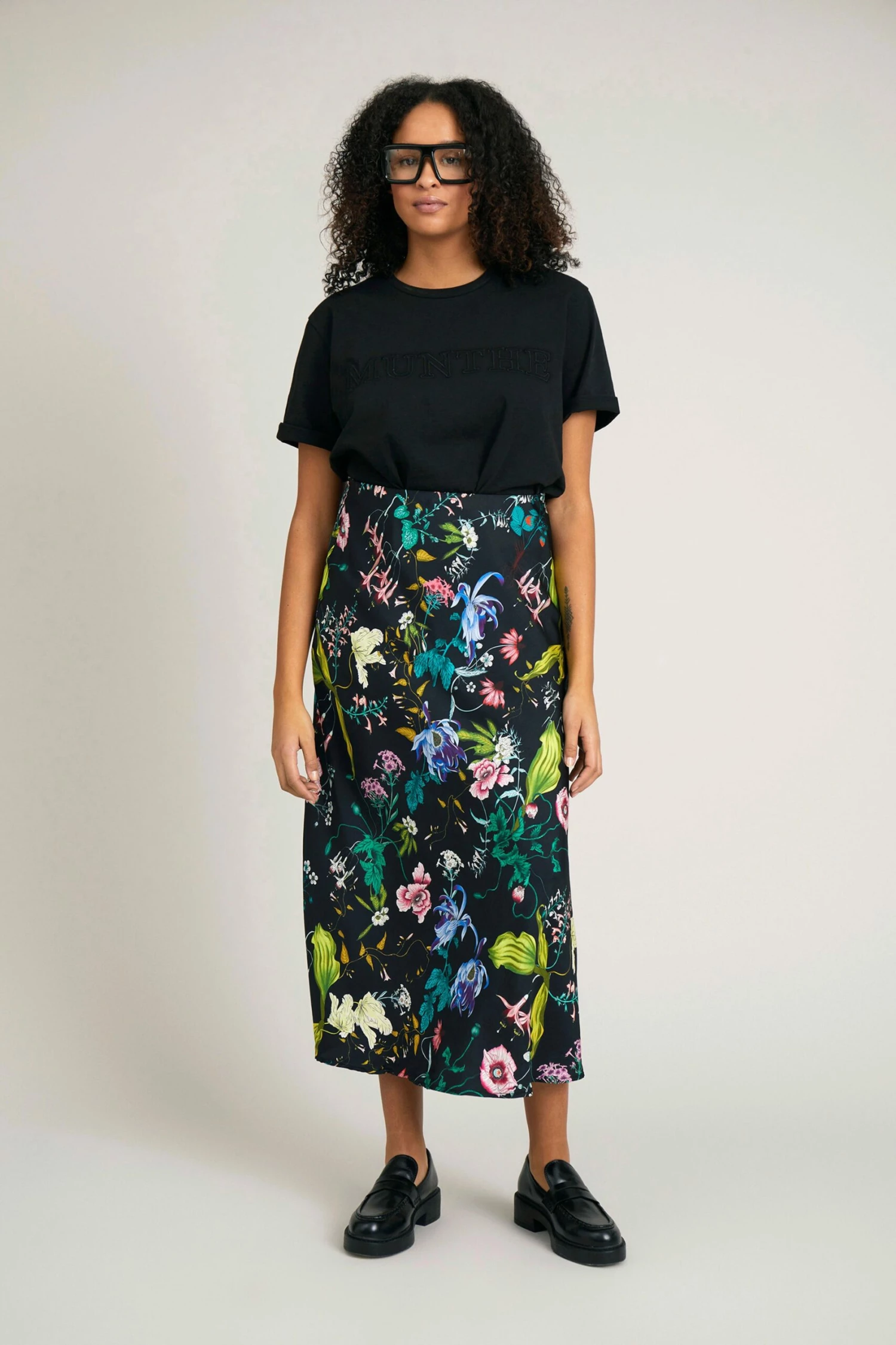 Carson skirt in black by munthe. Elegant skirt made from 100% silk. The skirt is long and has an invisible elastic waist for a flattering silhouette. Features: composition: 100% silk. Length: long. Elastic waist. Floral print throughout. Flattering cut.