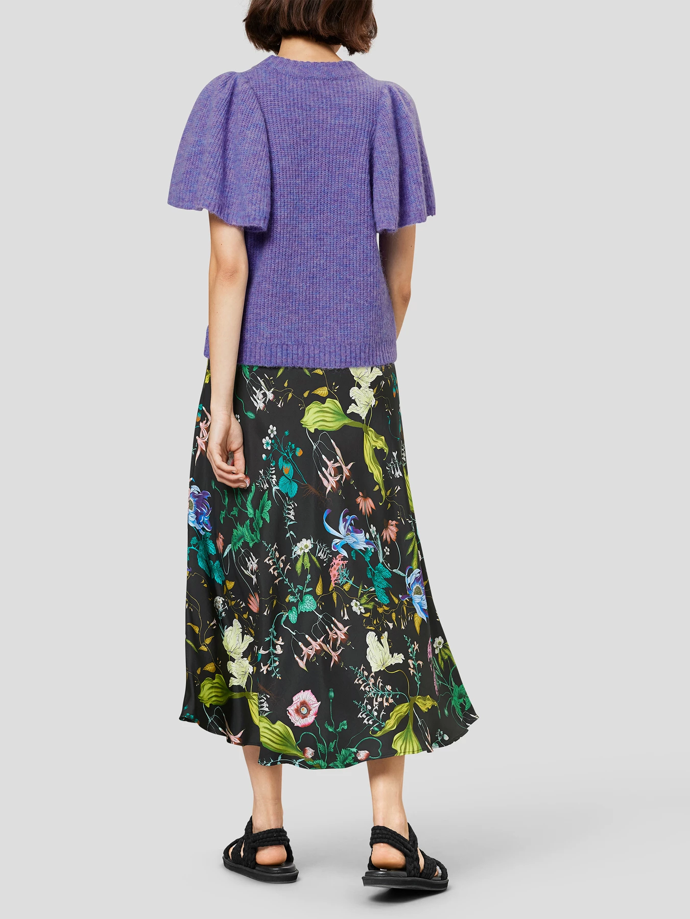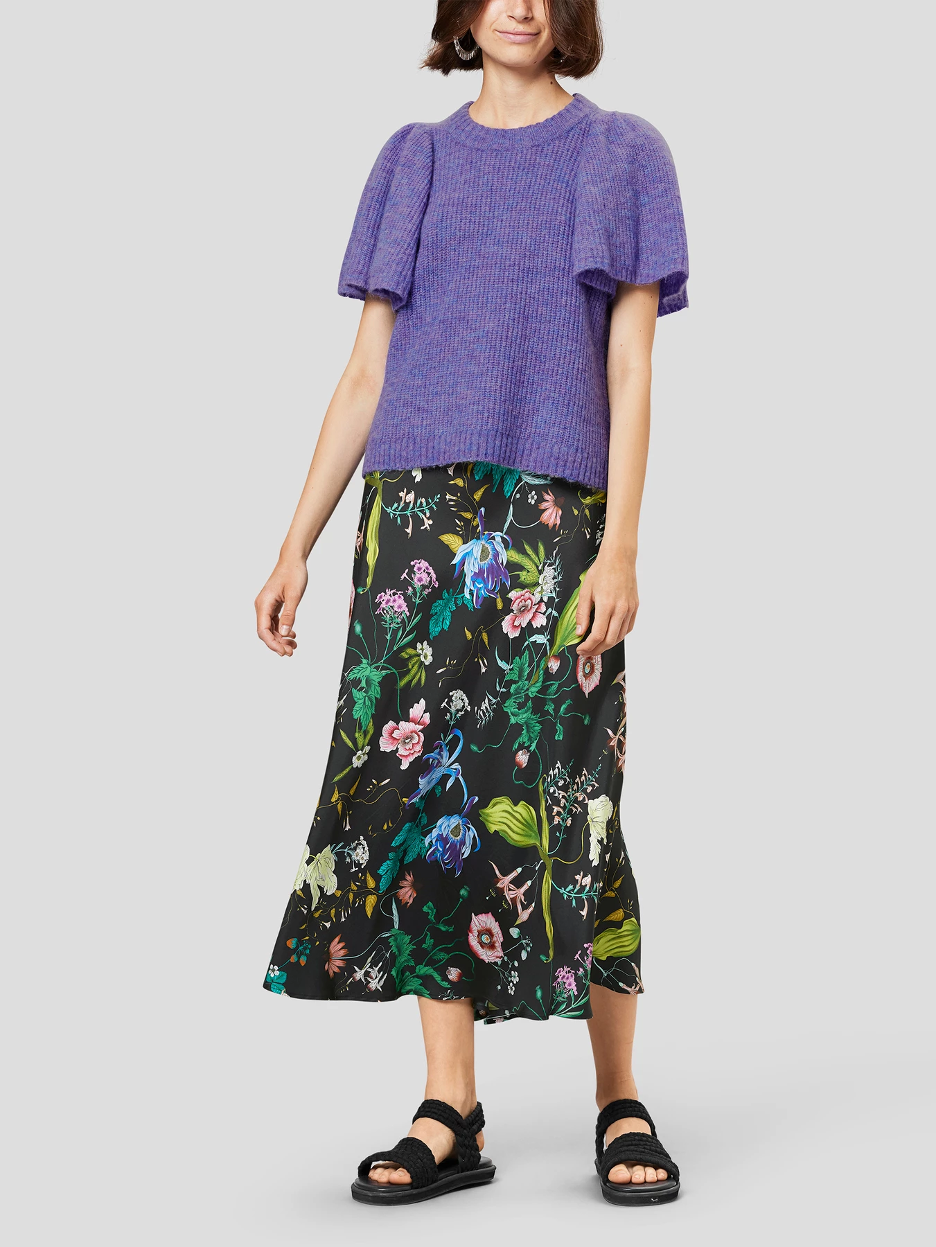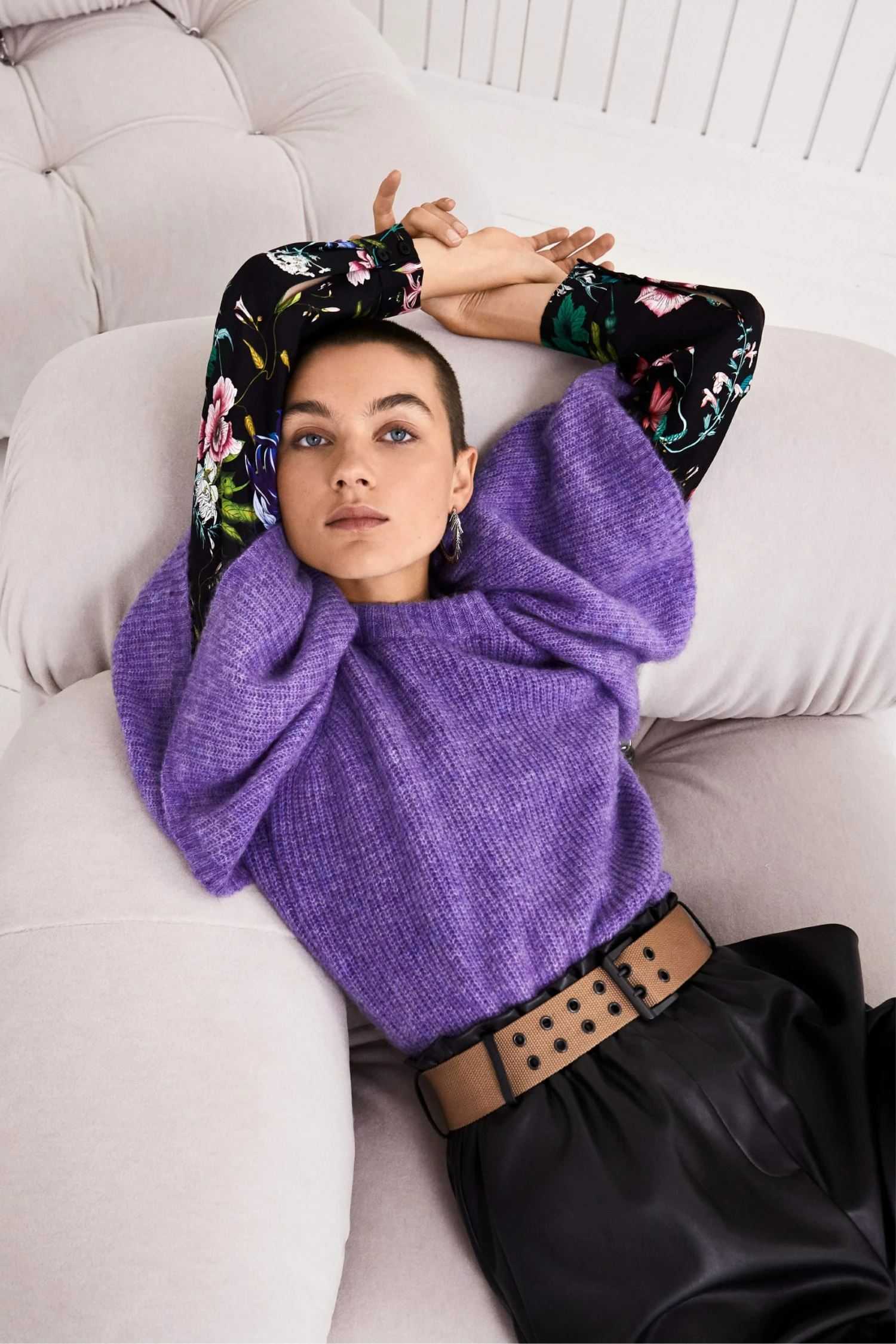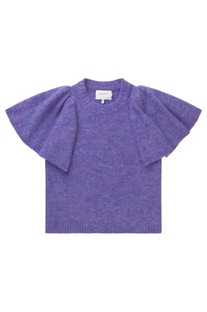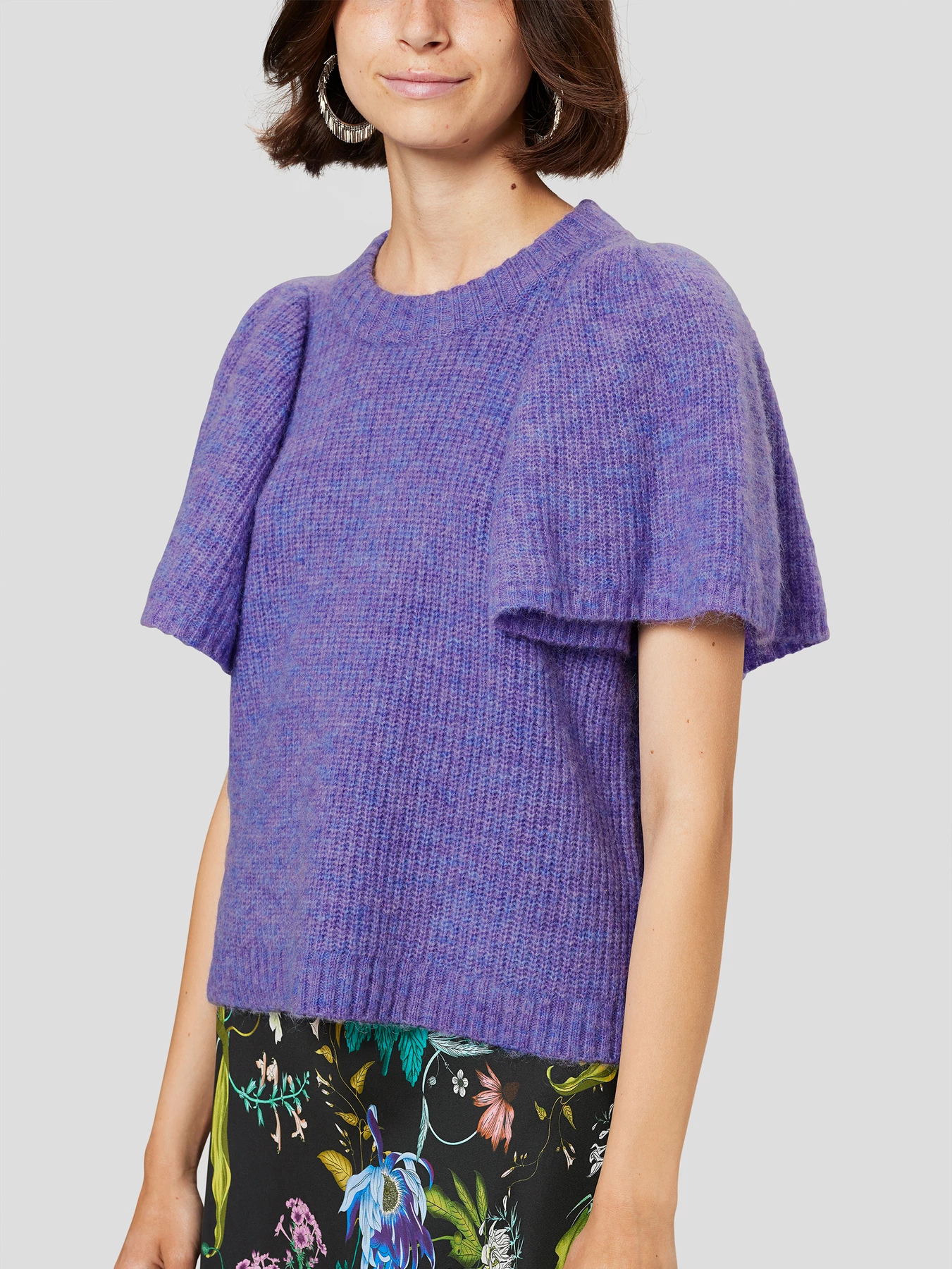 Beautiful knit in a nice wool and recycled polyester blend. The knit has short puff sleeves and rib along the round neckline and at the bottom. Available in lavender.