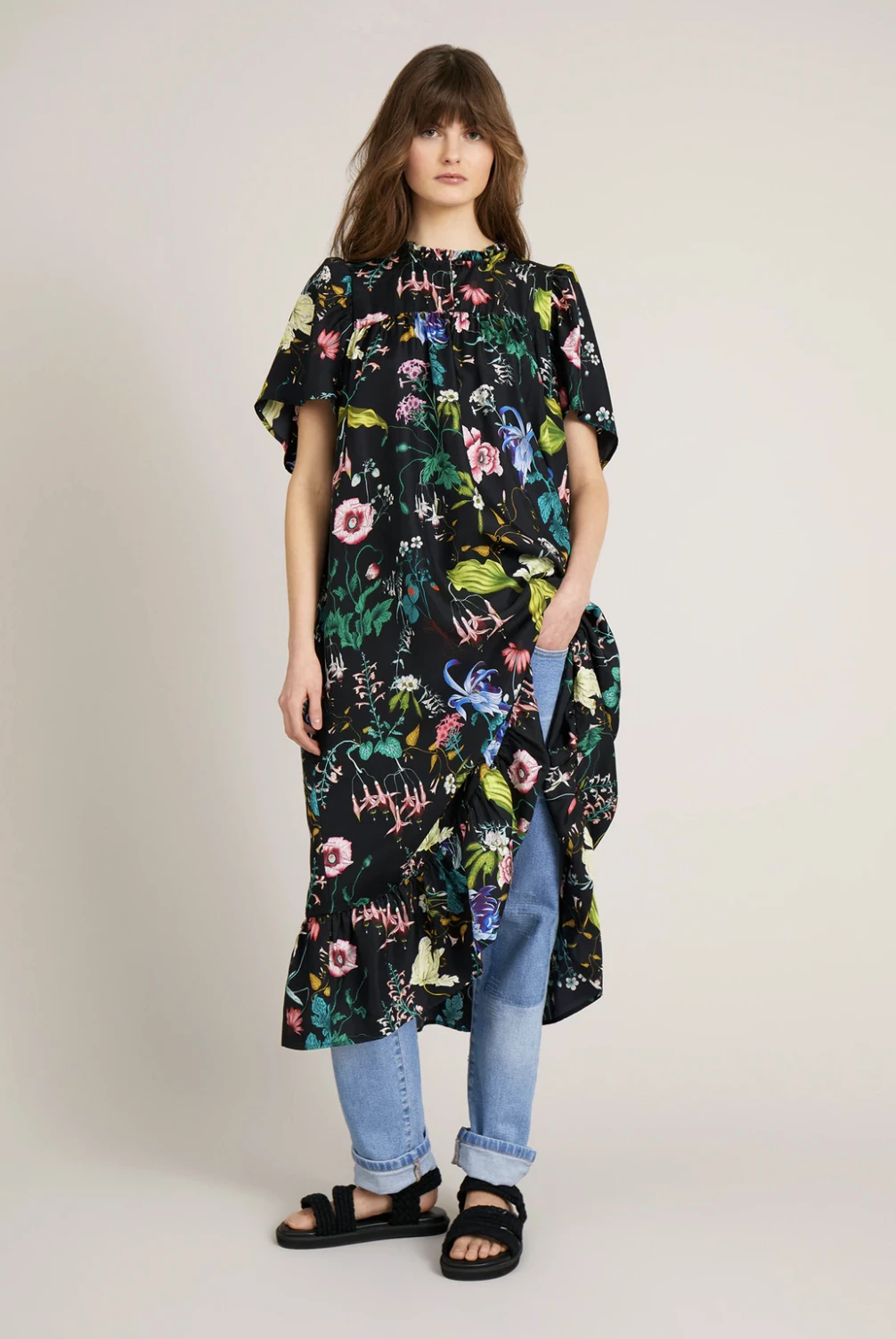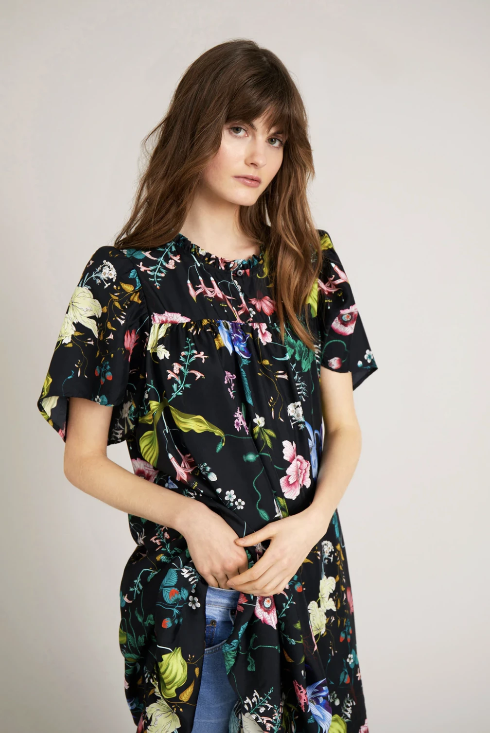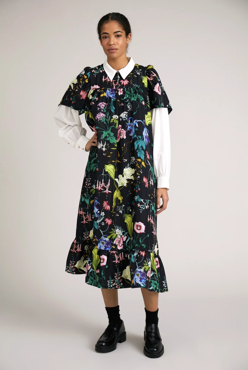 Loose, midi-length dress made from 100% silk. The dress has short puff sleeves, a small slit with button closure at the front and frill details along the round neck and at the bottom. Available in black and white with a beautiful floral print.