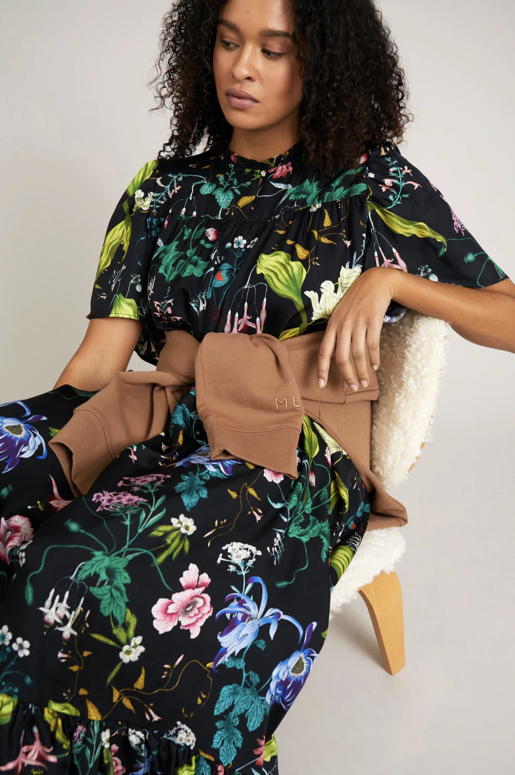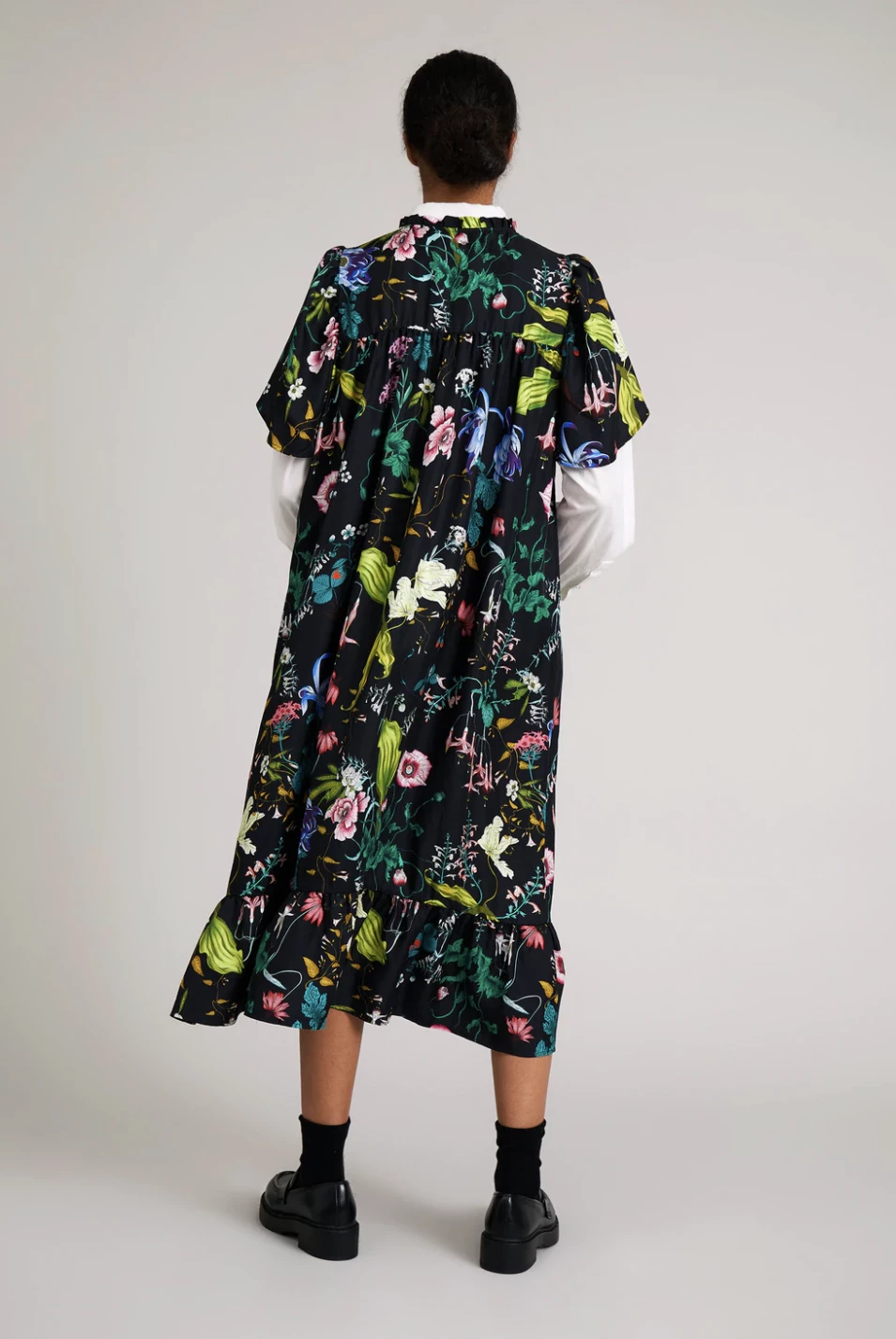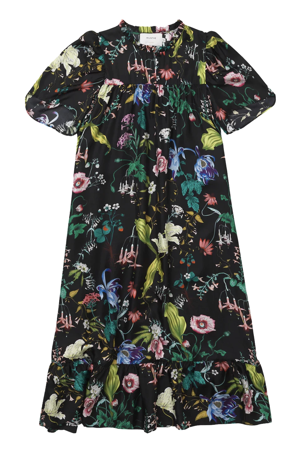 Loose, midi-length dress made from 100% silk. The dress has short puff sleeves, a small slit with button closure at the front and frill details along the round neck and at the bottom. Available in black and white with a beautiful floral print.
