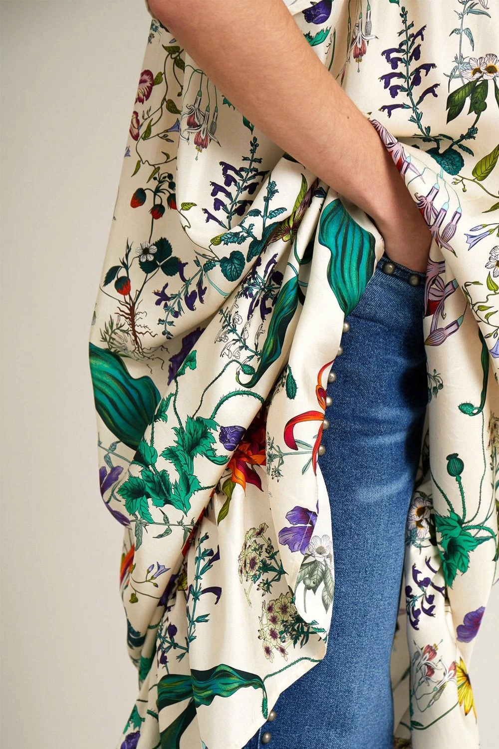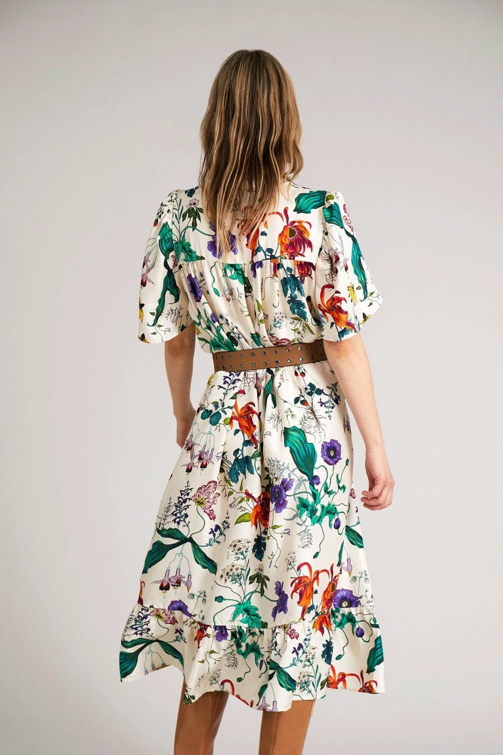 Ivory Mid Length Dress Puff Sleeve Small Split Button Closure Round Neck Frill Detail Floral Print 100% Silk 43477