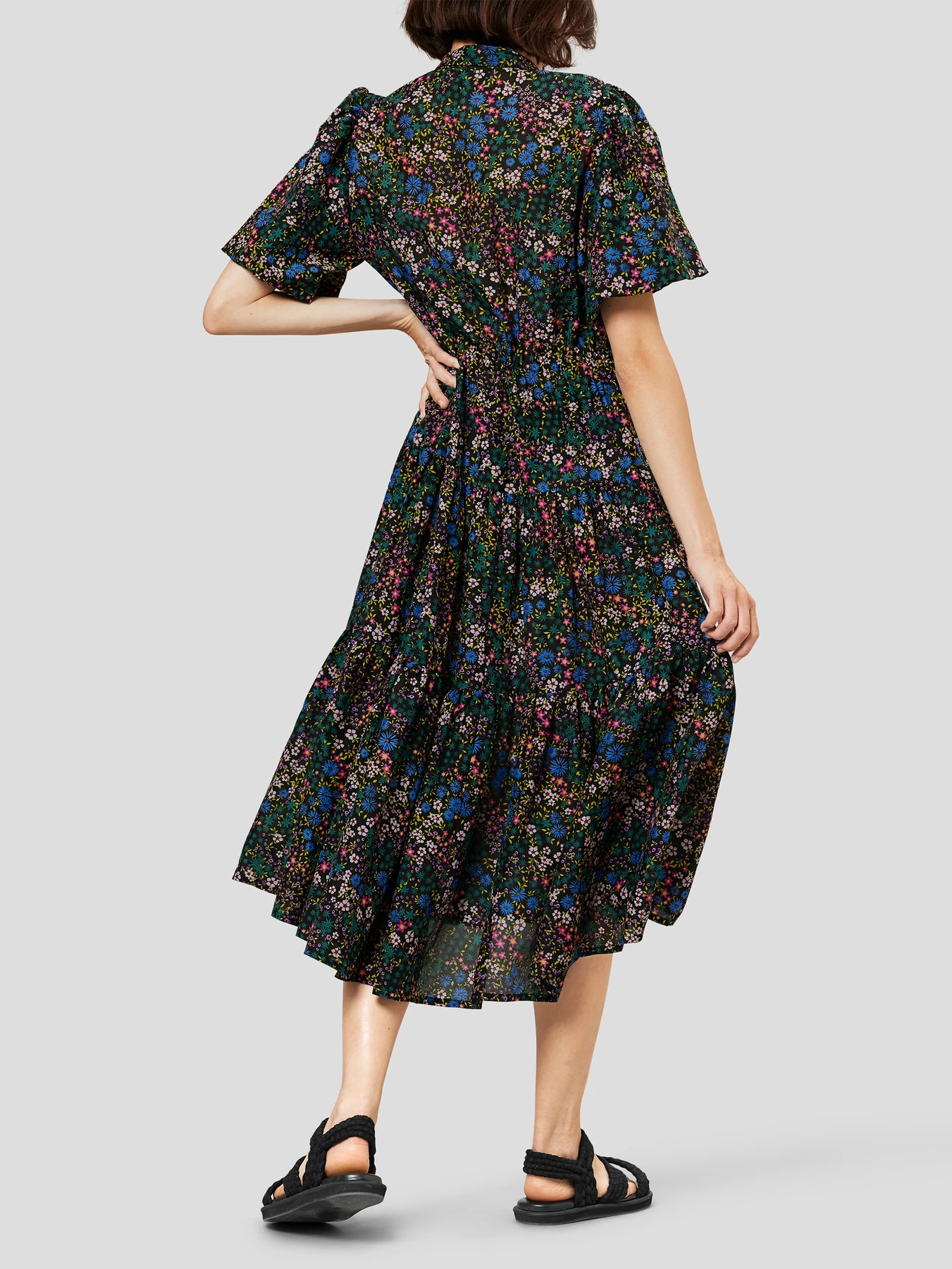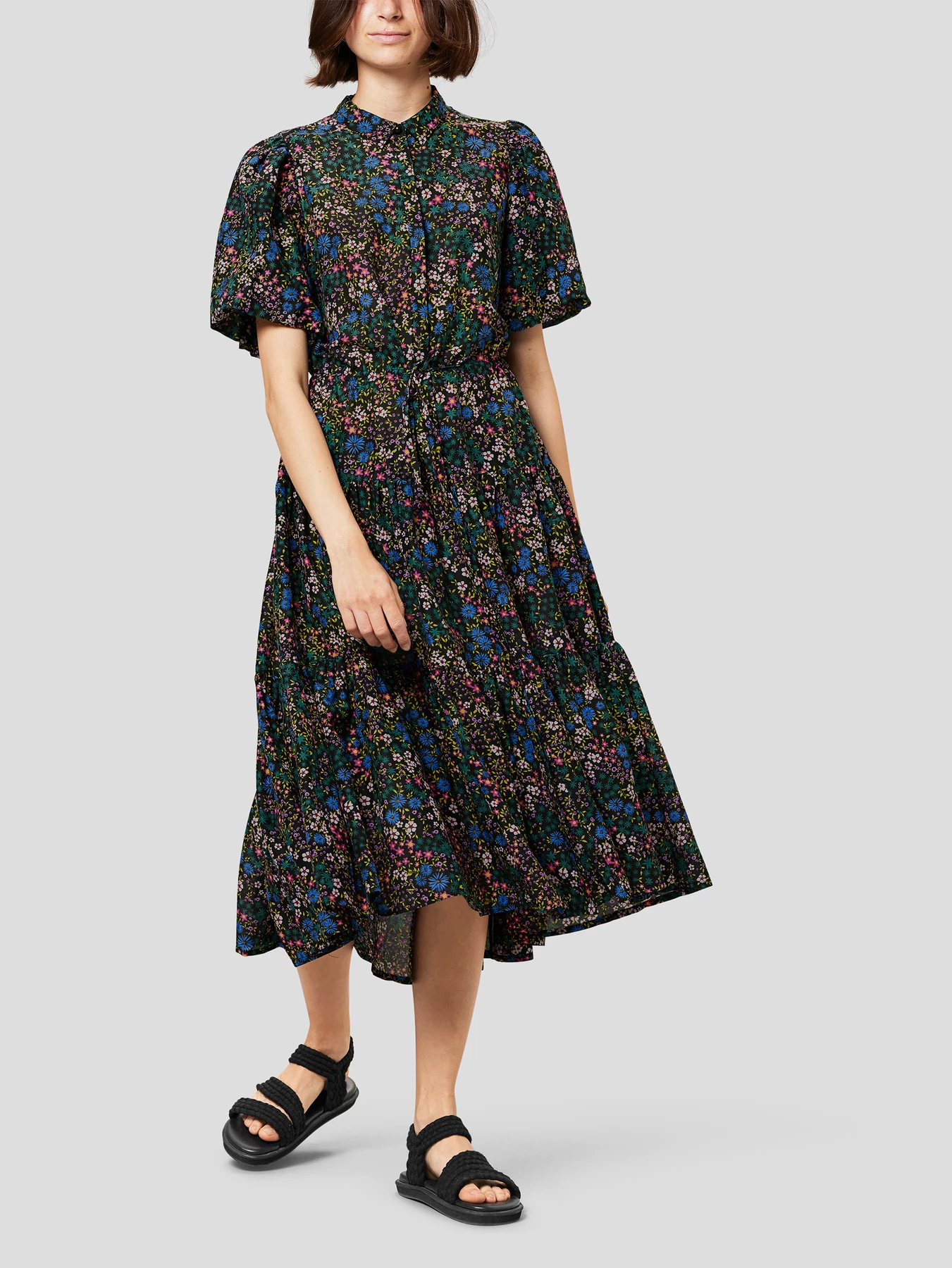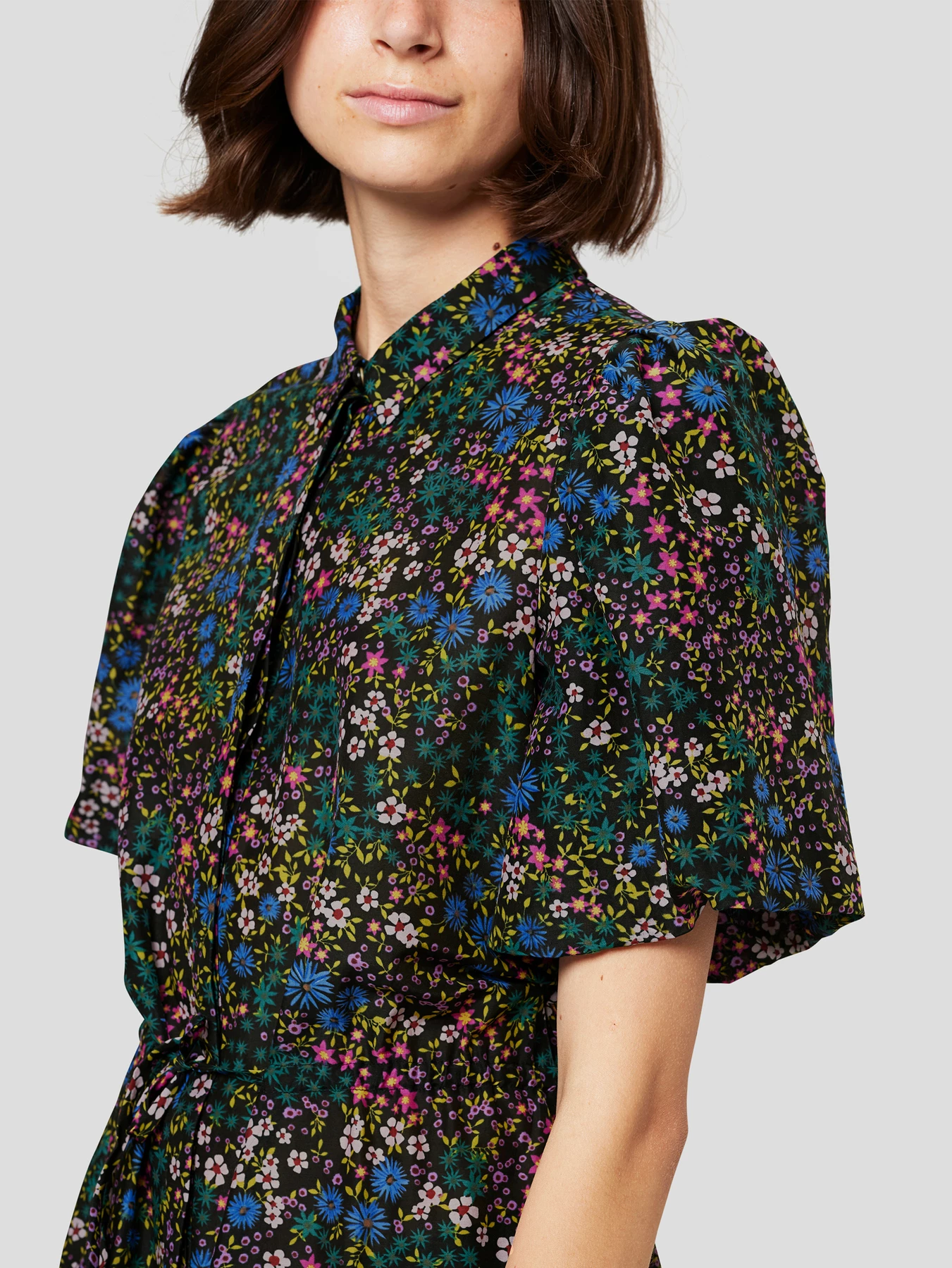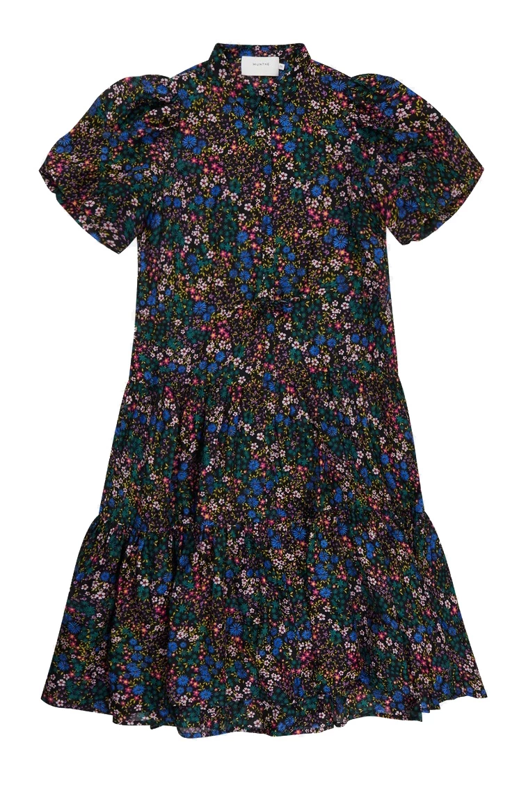 Beautiful, midi-length dress made from an organic cotton and silk blend. The dress has short puff sleeves, small collar and hidden buttons along the front. Tie at the waist and regular fit with more width at the bottom. Available in black and ivory with the most beautiful floral print.