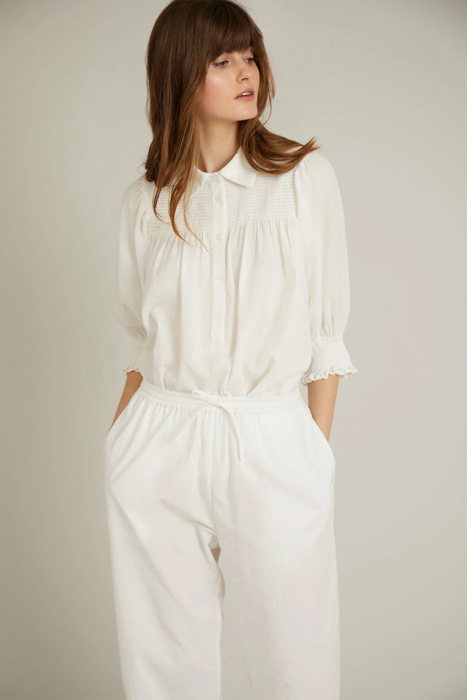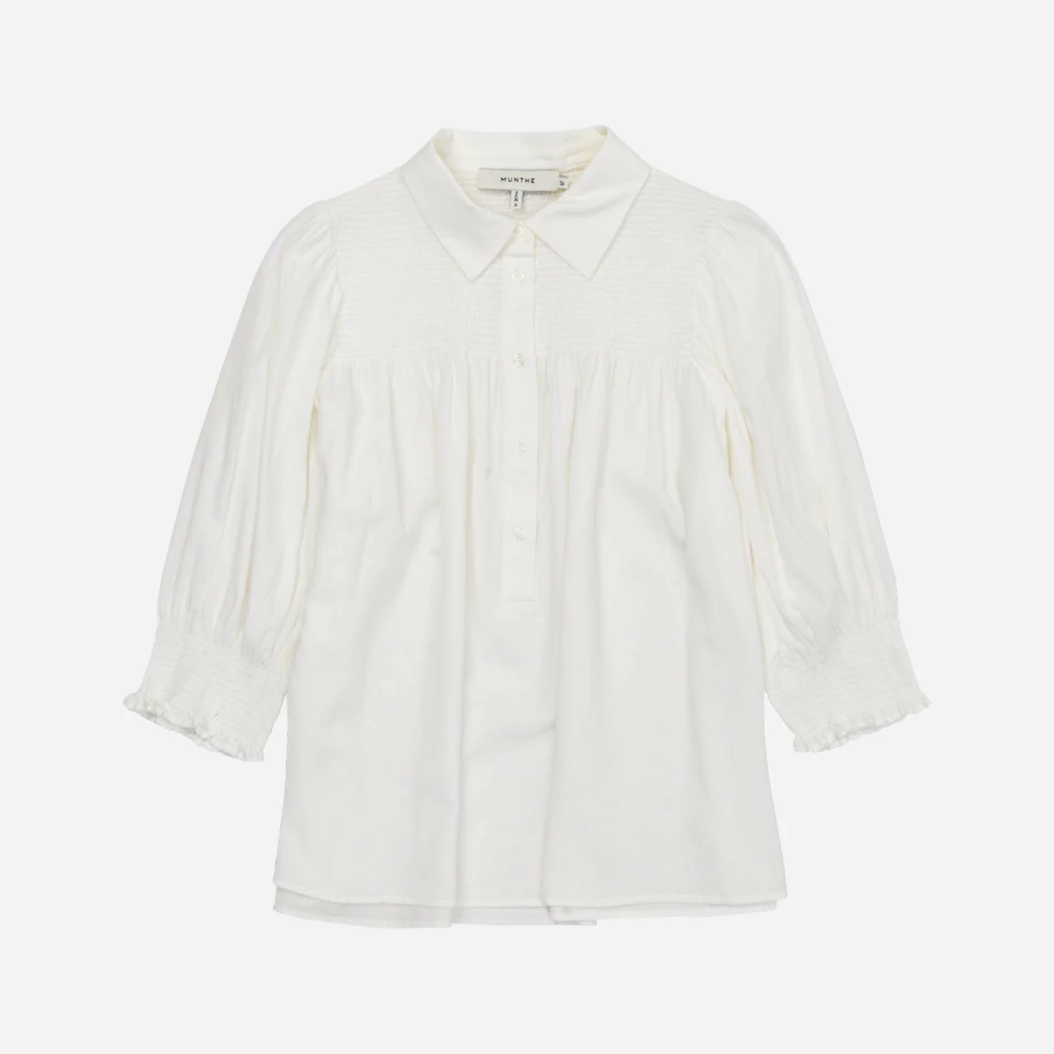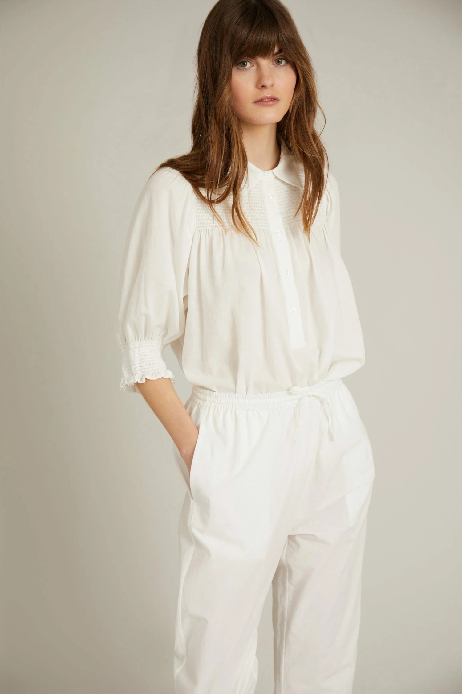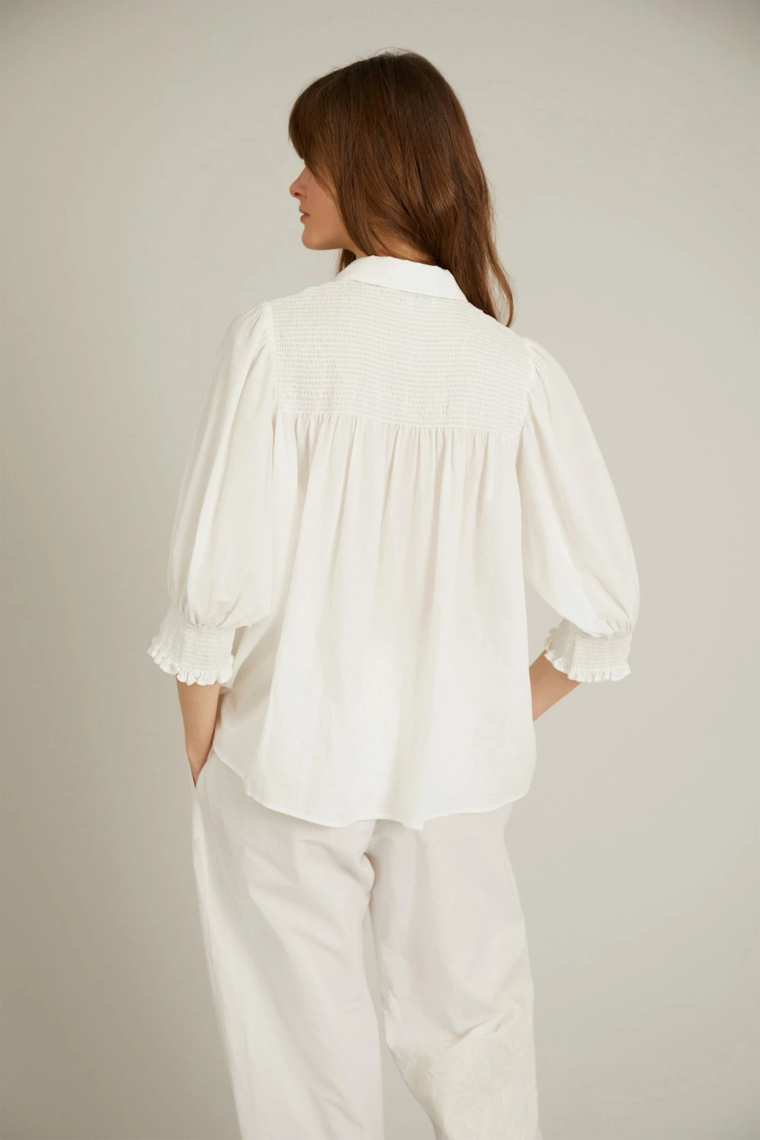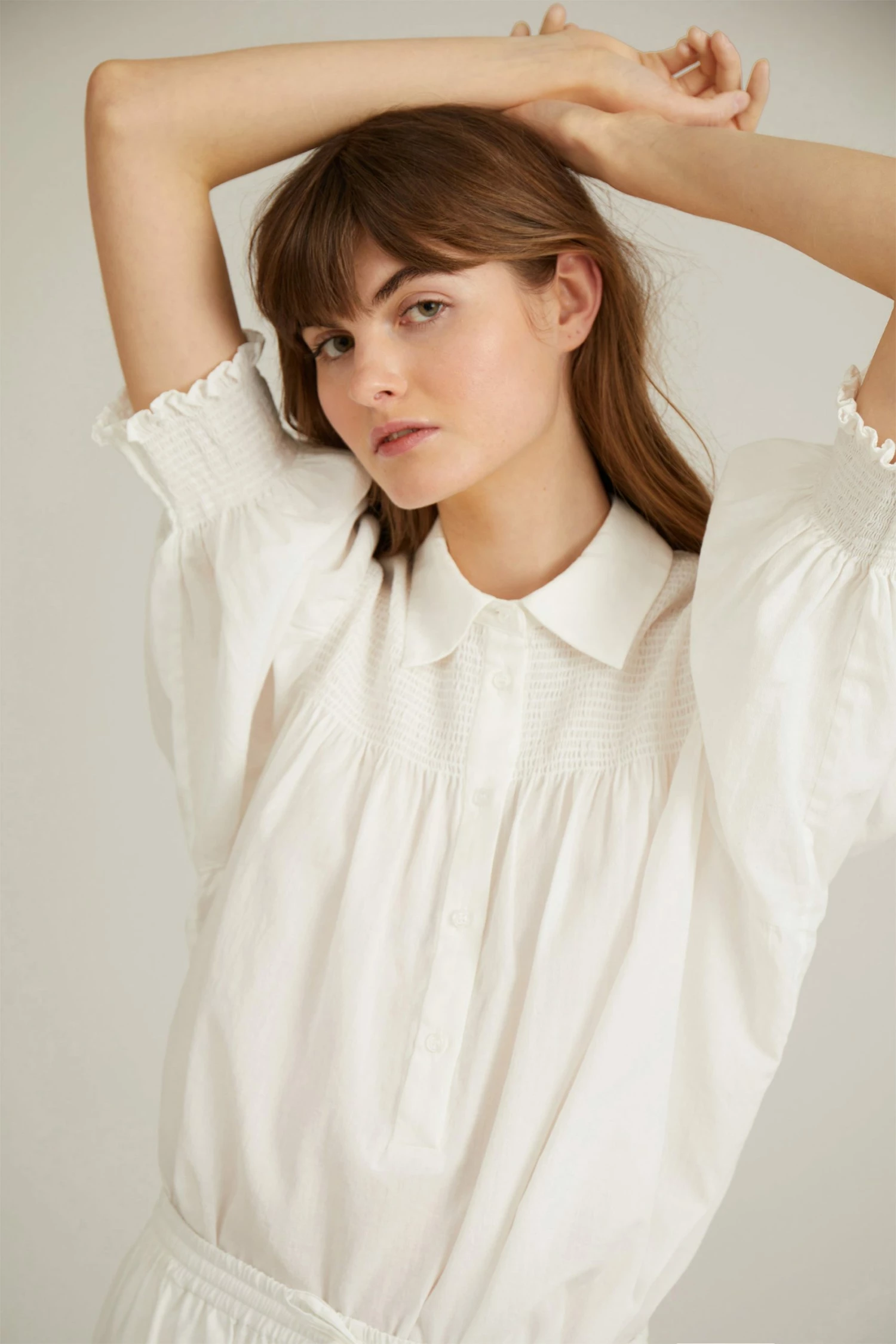The Chapter Top is a feminine top in 100% organic cotton. The top has smock details at the front and back yoke and at the end of the three-quarter length puff sleeves. Small collar and button closure at the front. Regular fit. Available in white and camel.