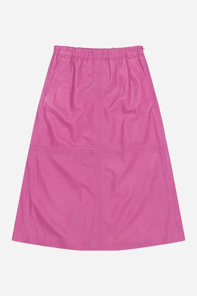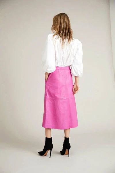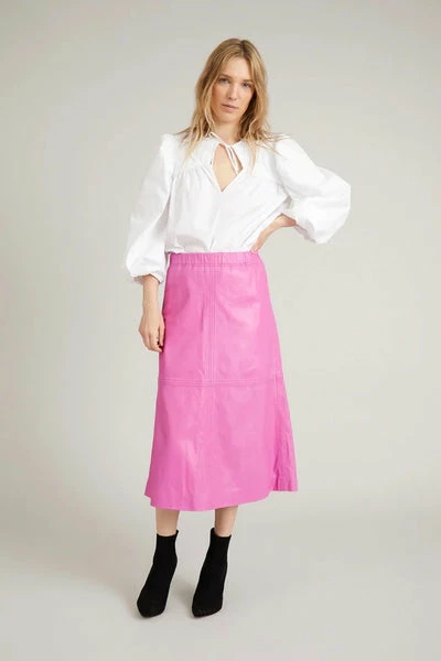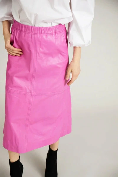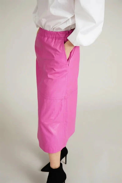 Cooler, mittellanger Rock aus weichstem Lammleder. Er ist in klassischer A-Form gestaltet und hat Ziernähte an Vorder- und Rückenteil, einen elastischen Bund, Taschen und einen unsichtbaren seitlichen Reißverschluss. Das Model ist 176 cm groß und trägt Größe 36. Material: 100 % Lammleder