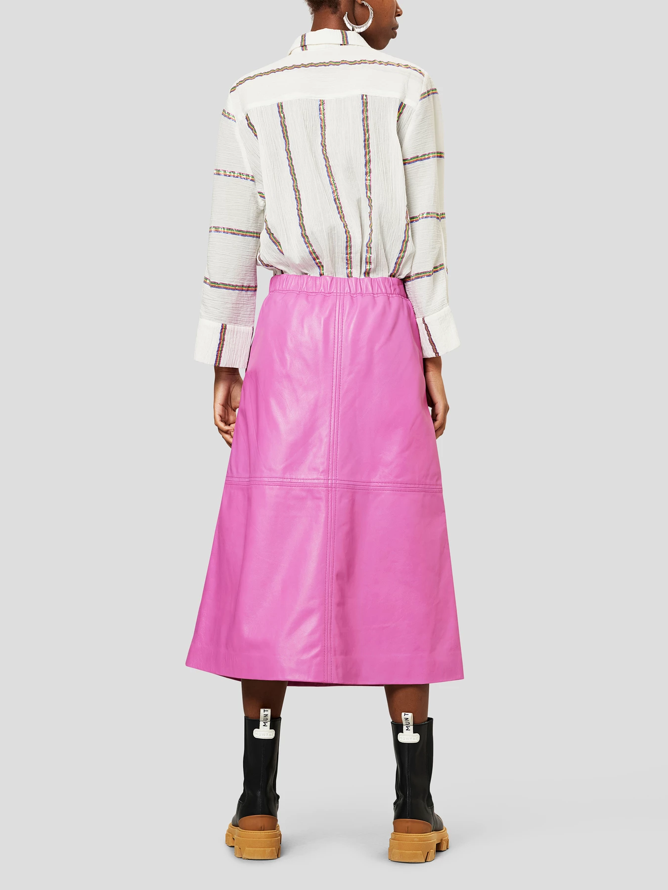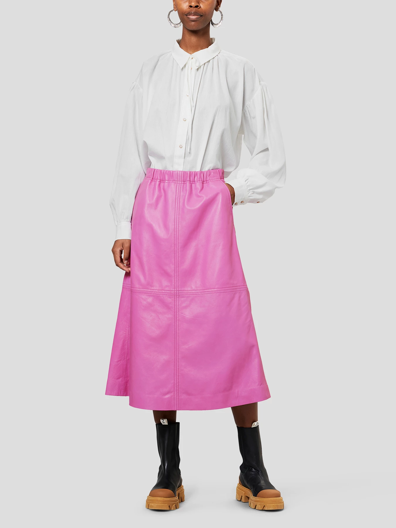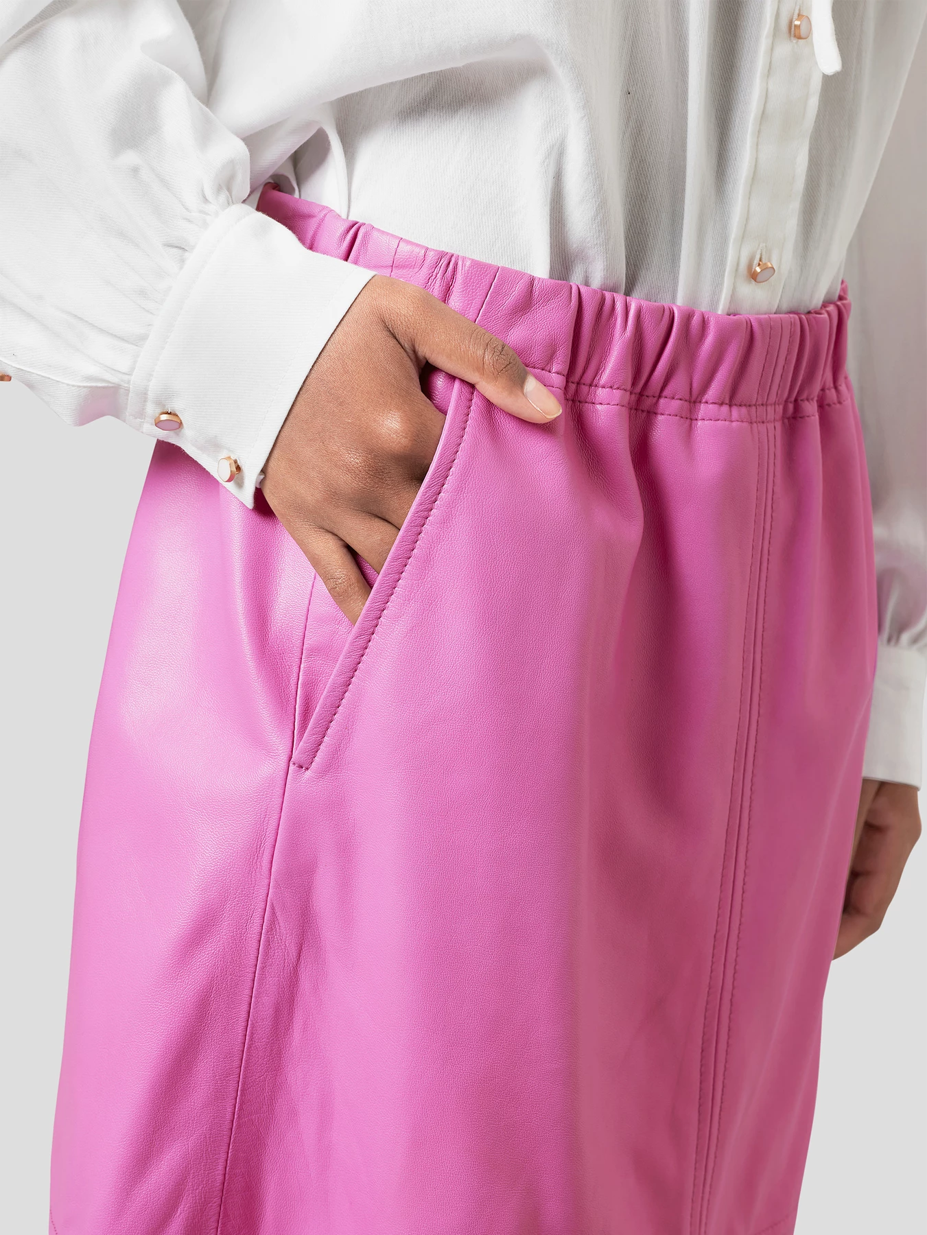 Beautiful, midi-length skirt in the softest lambskin. The skirt is designed in a classic A-shape and has decorative stitches at the front and back piece, elastic waist, pockets and an invisible side zipper. Available in pink.
