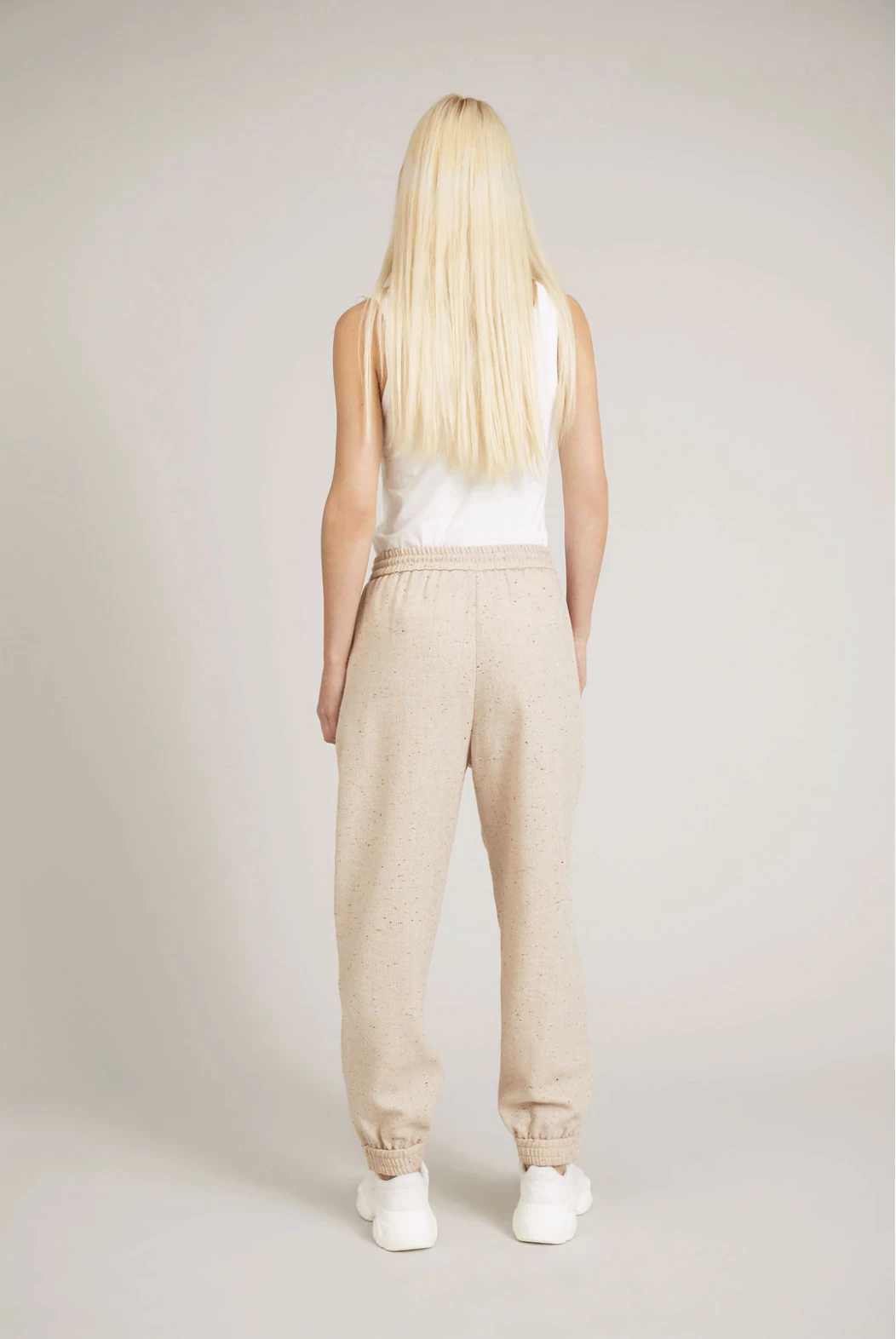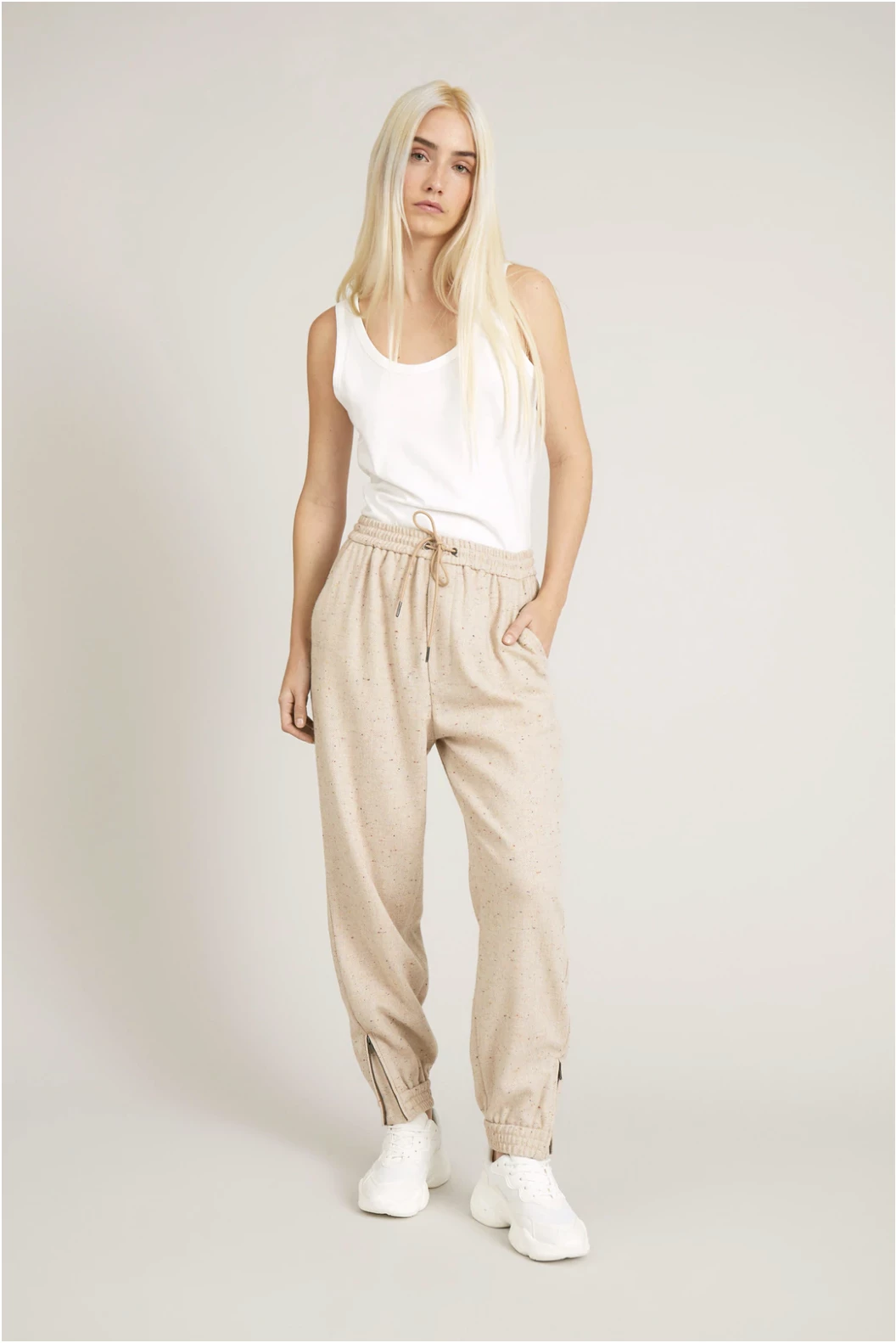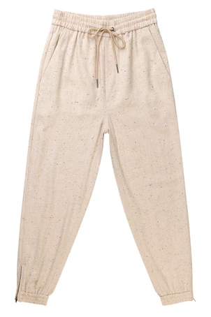 Cool, loose pants with an elastic waist with ties. The pants have side pockets and elastic at the bottom with a zipper at the side seam.