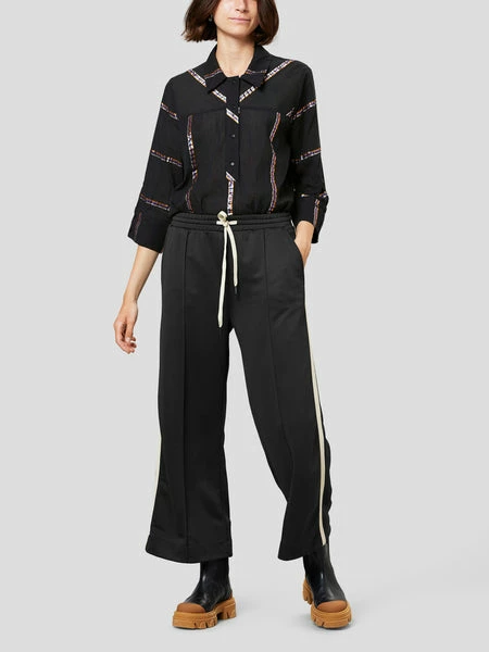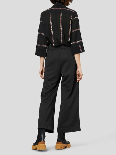 Munthe Cloud Black Track Pant, cool jersey pull on track pant style trouser. Wide leg styling with elasticated waist and cream drawstring detail, with cream contrast side band, side slip pockets. Team with trainers and a silk shirt or wear more casually. Cropped style 25″ inseam 100% polyester Wash at 30 degrees