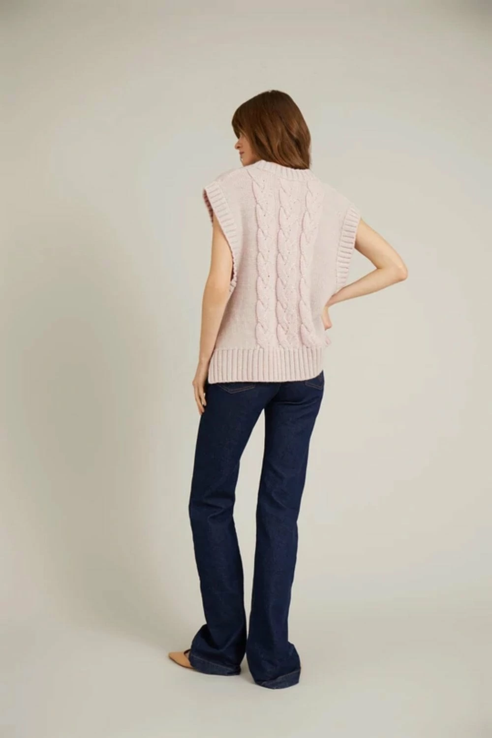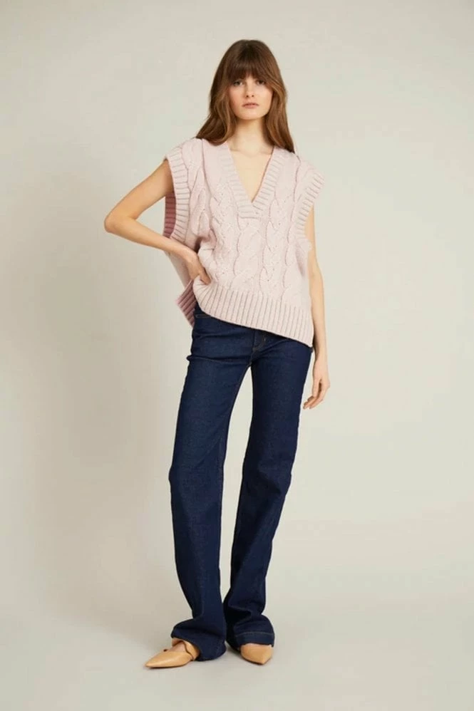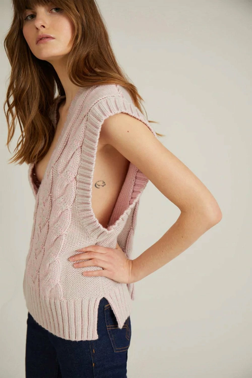 Rose Cable Knit Top Deep Armholes Loose Fit Deep V Neck Side Slit Rib along hem, arm holes, bottom Varies in colour and pattern 50% Wool 50% Polyamide 43204