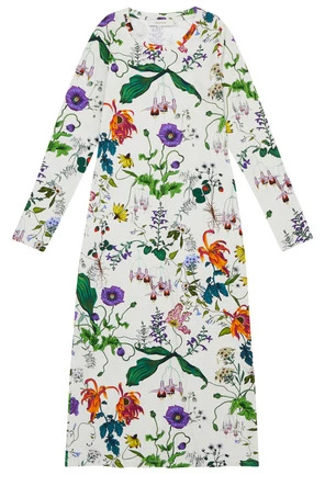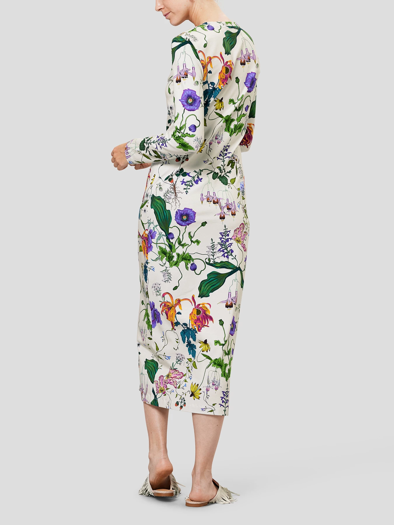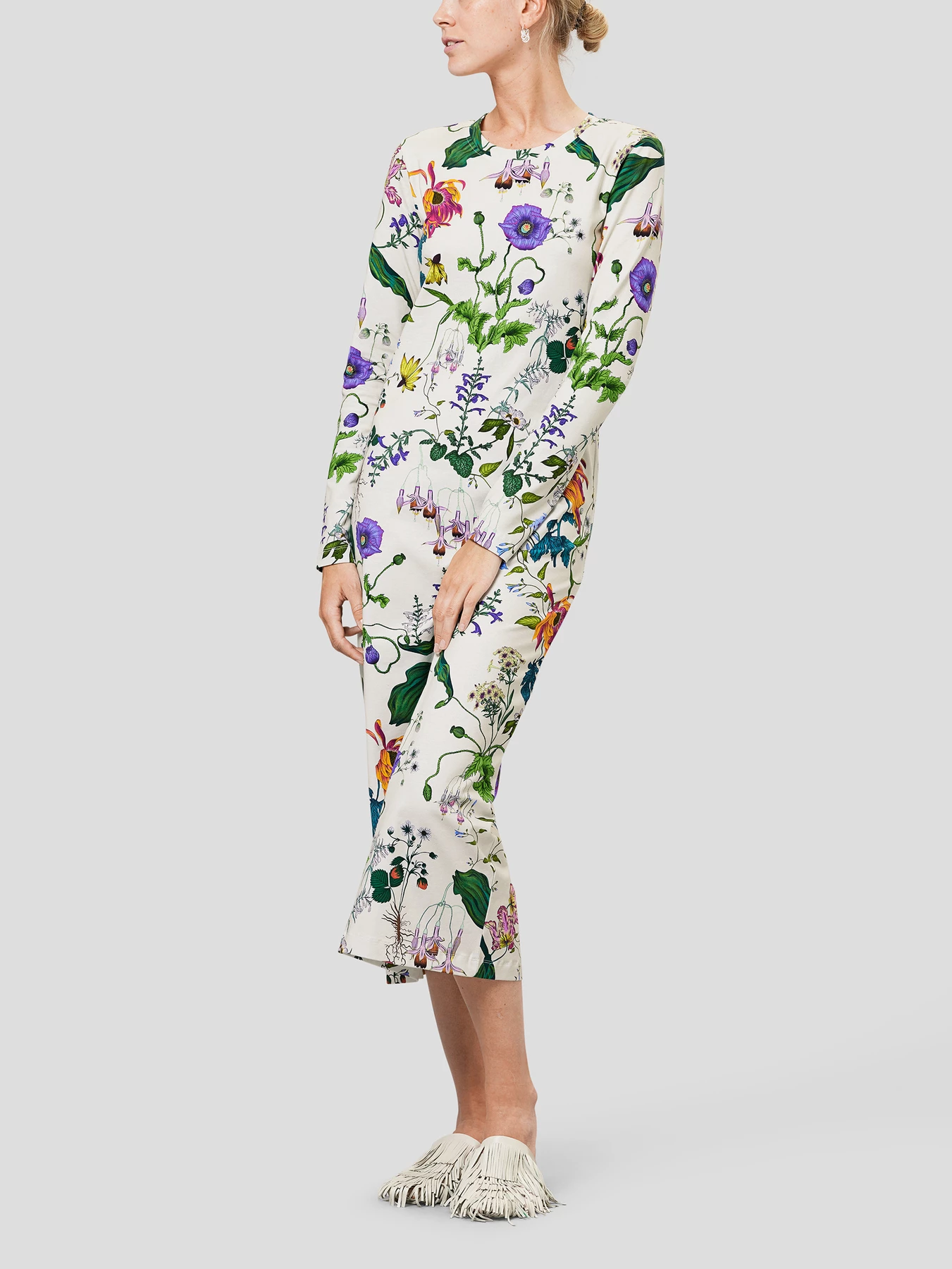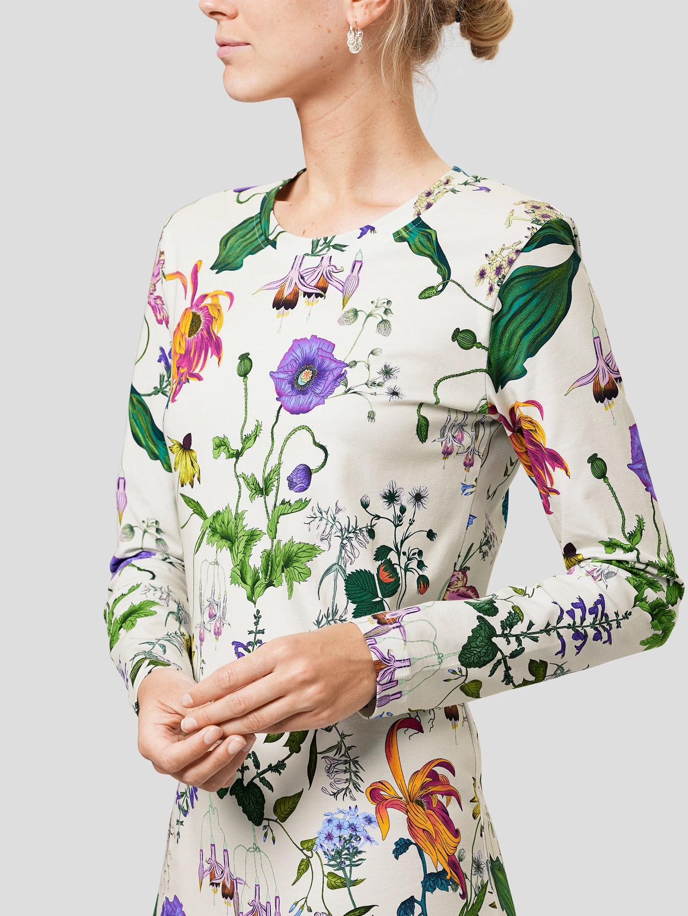 Long dress in organic cotton. The dress has a round neck and long sleeves, and it is designed in a tight silhouette.