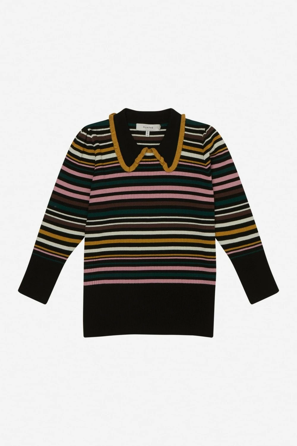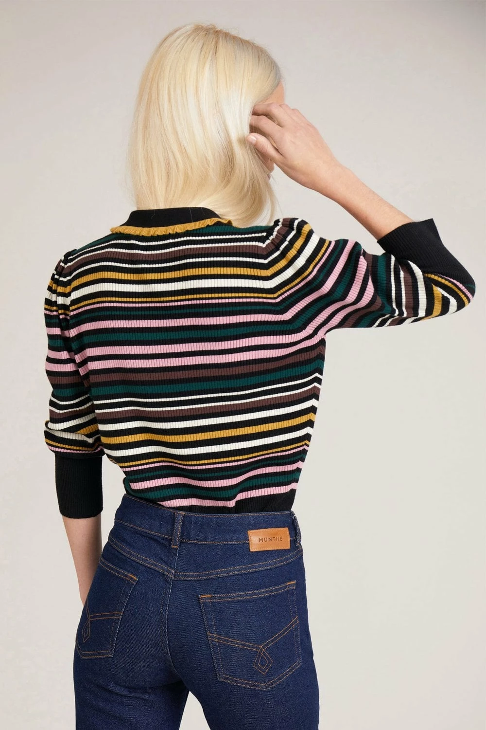 Black Cool Rib Knit Stripe 3/4 Length Puff Sleeve Tight Cuff Collar with Frill 80% VIscose 20% Polyamide 43479