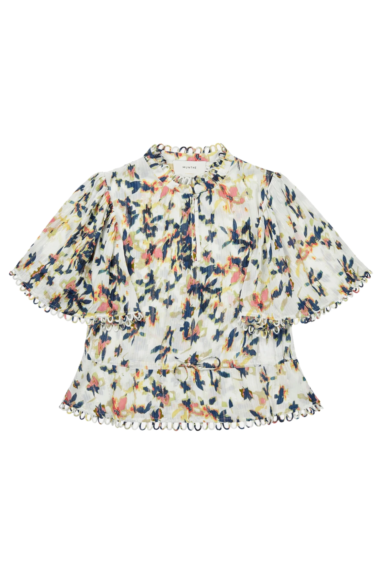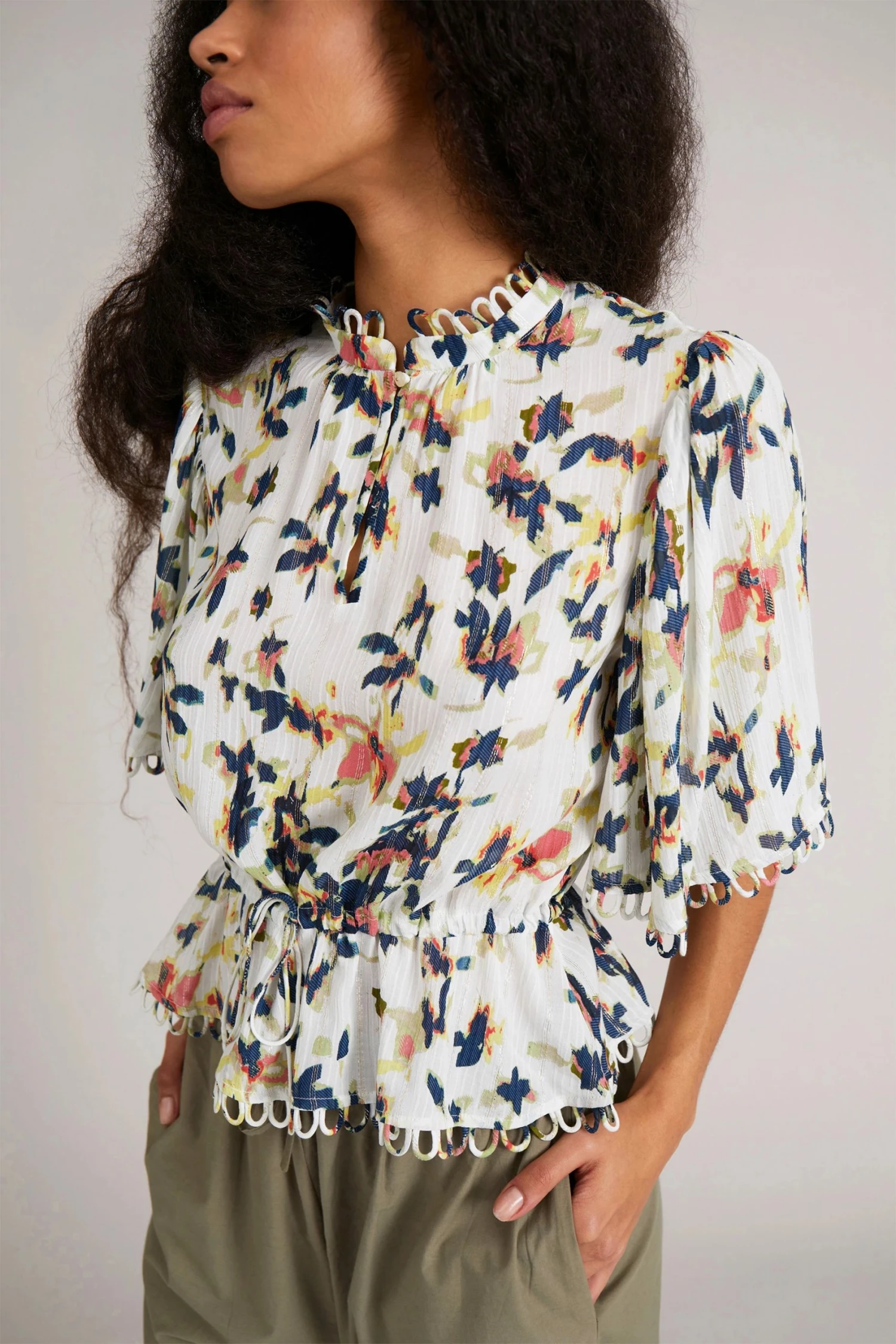 The top has a slit in the neck, rouleau details along the neckline, sleeves and at the bottom and a tie at the waist. Regular fit. Available in rose with a beautiful print and lurex details.