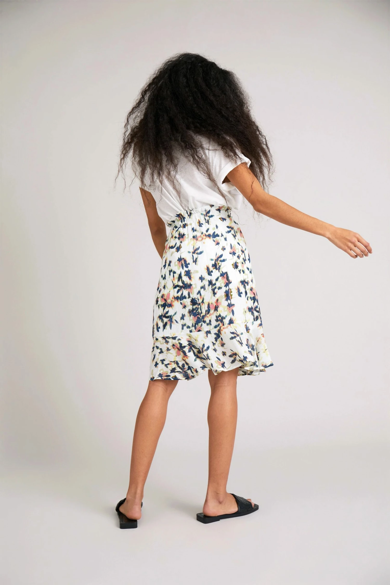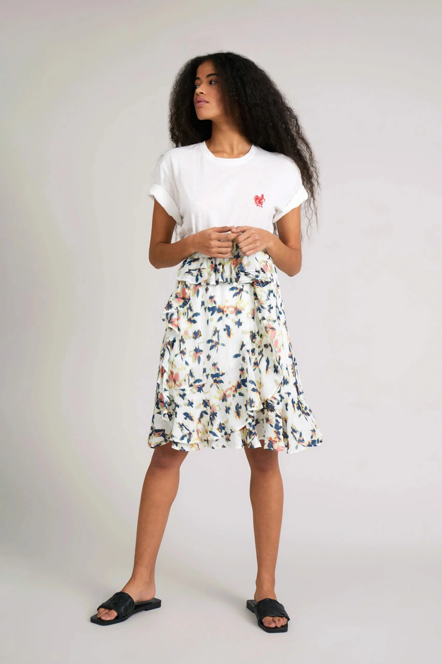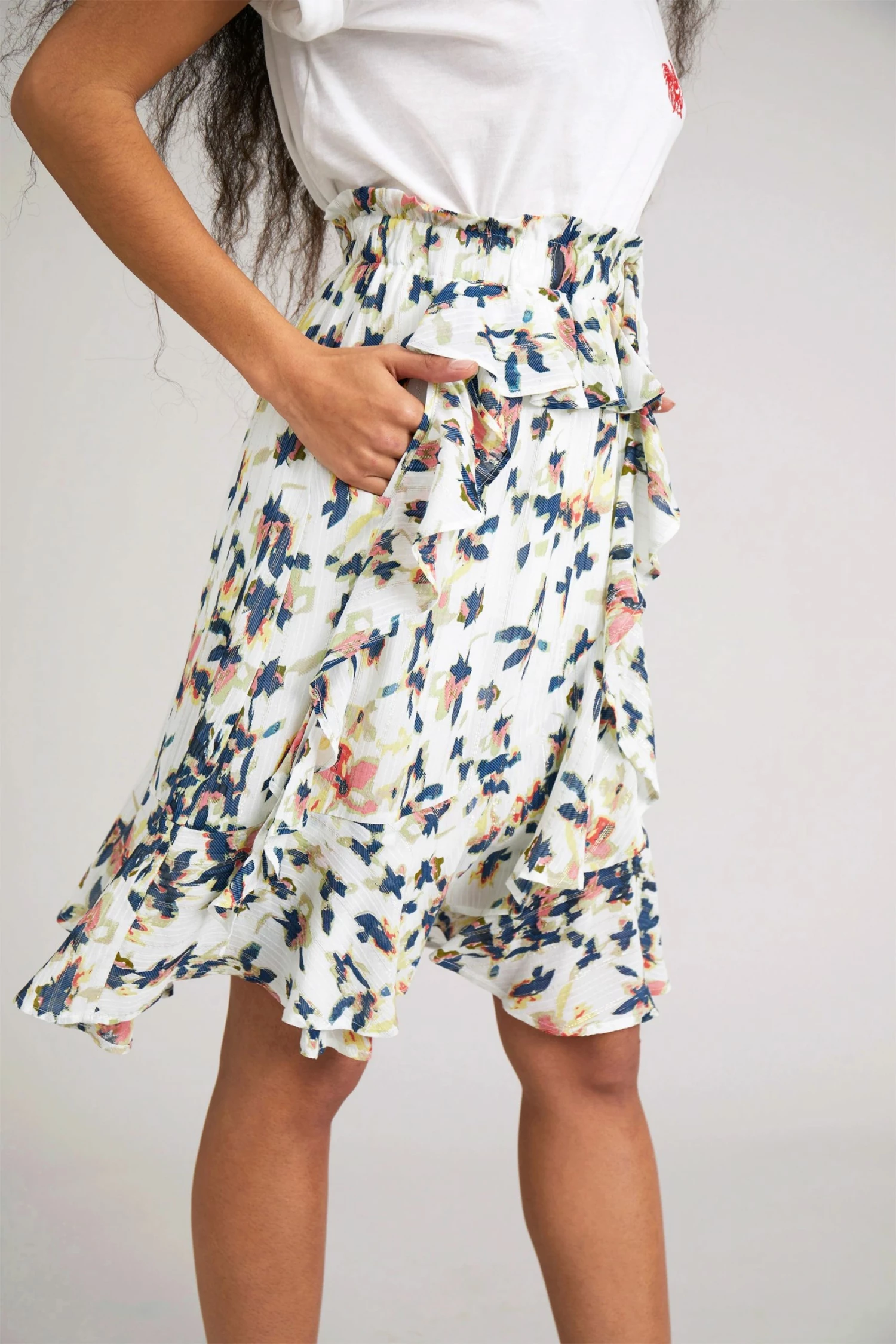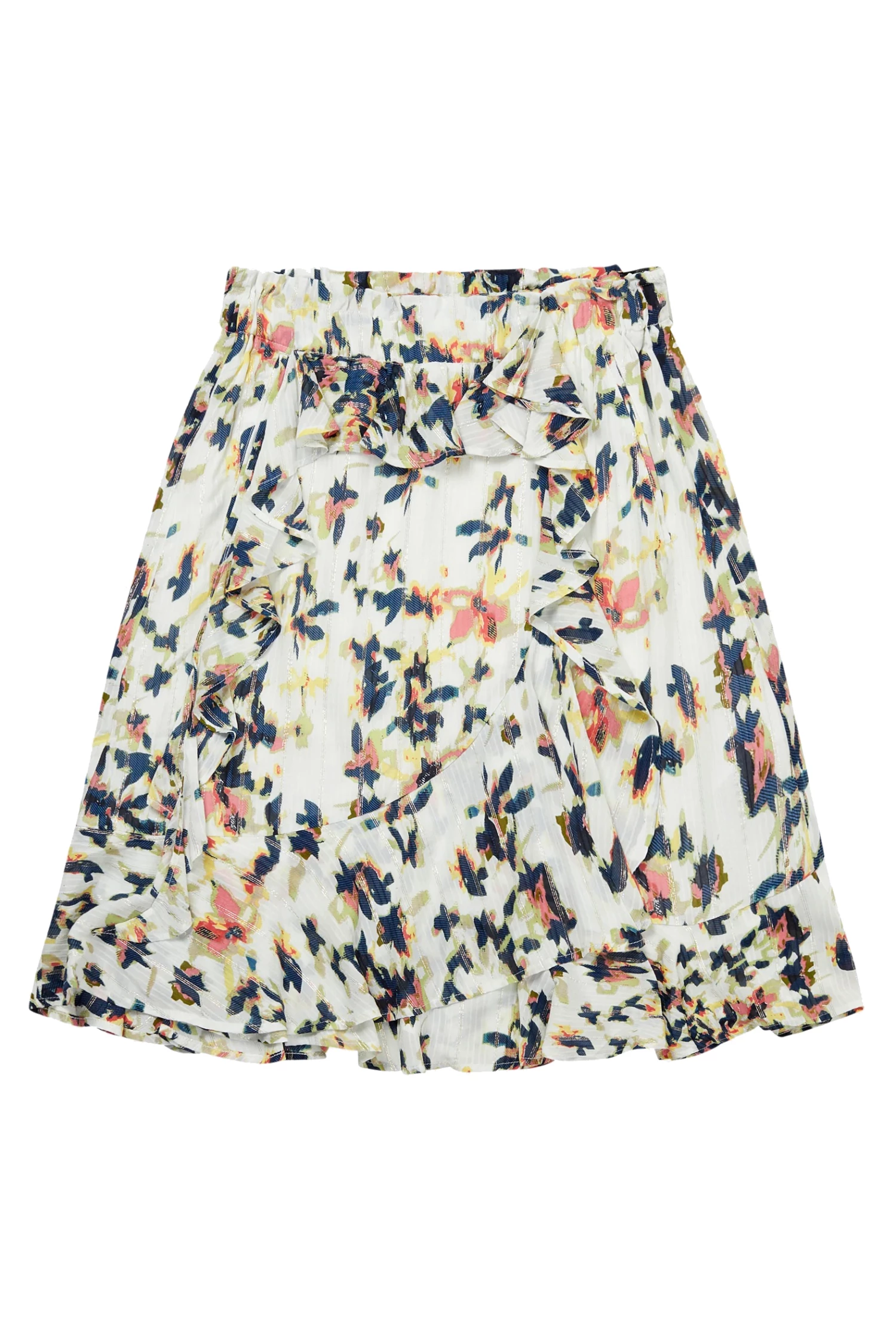 The skirt has an elastic waist and side pockets. Available in rose with a beautiful print with lurex details.