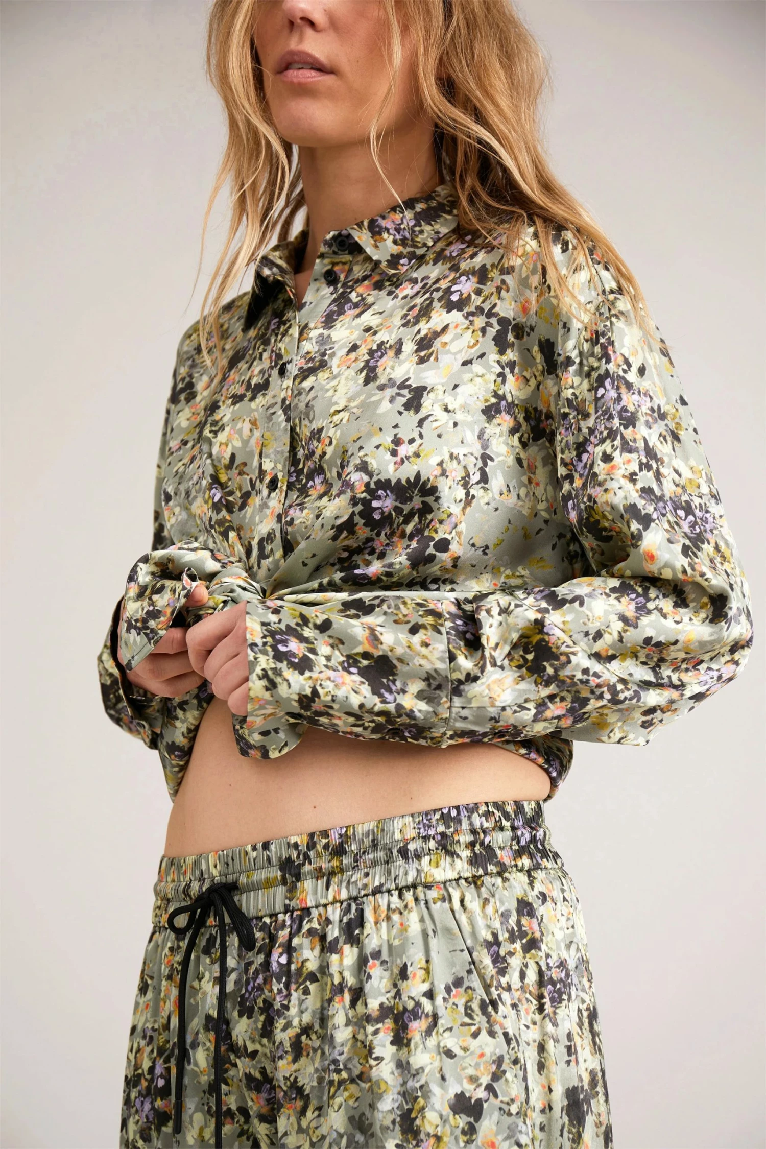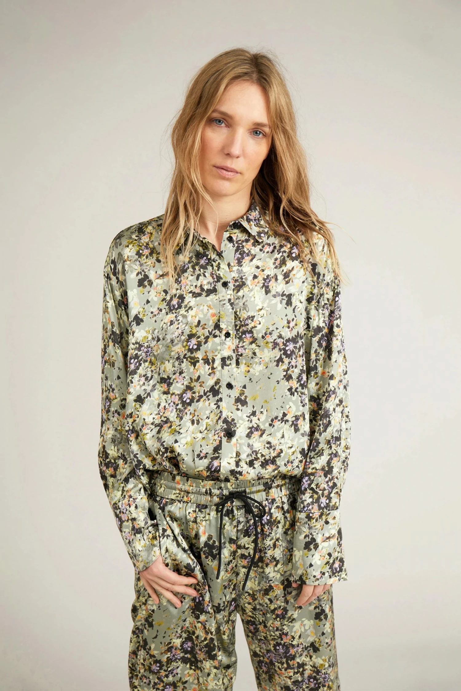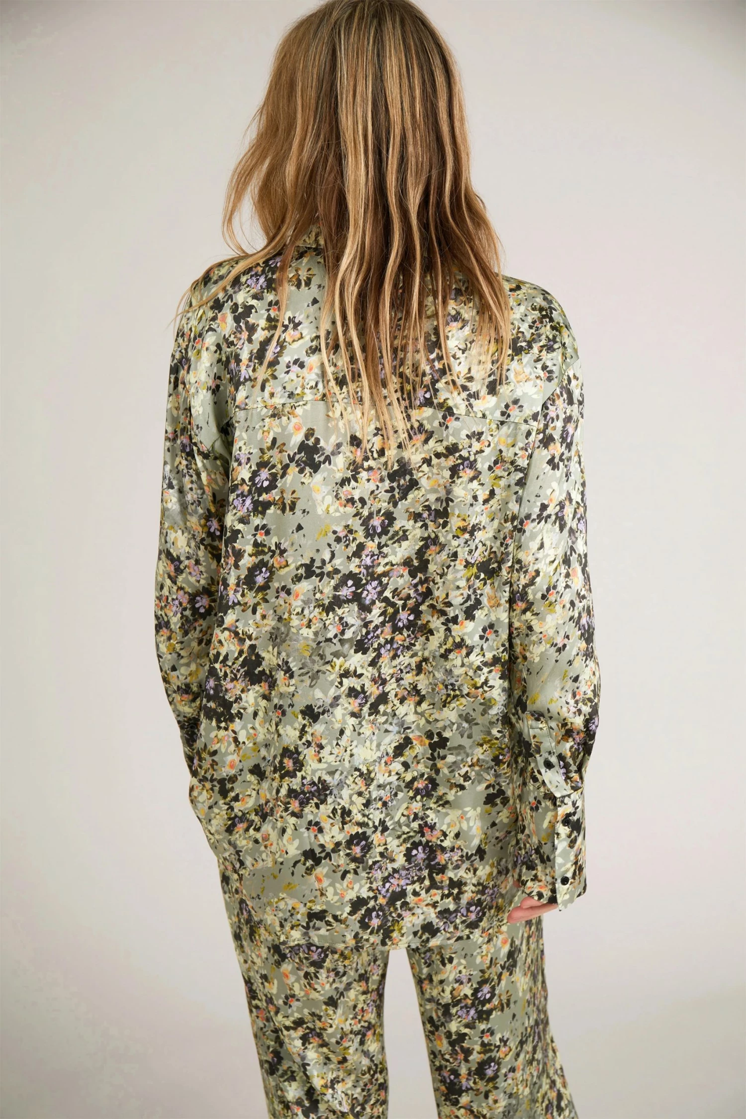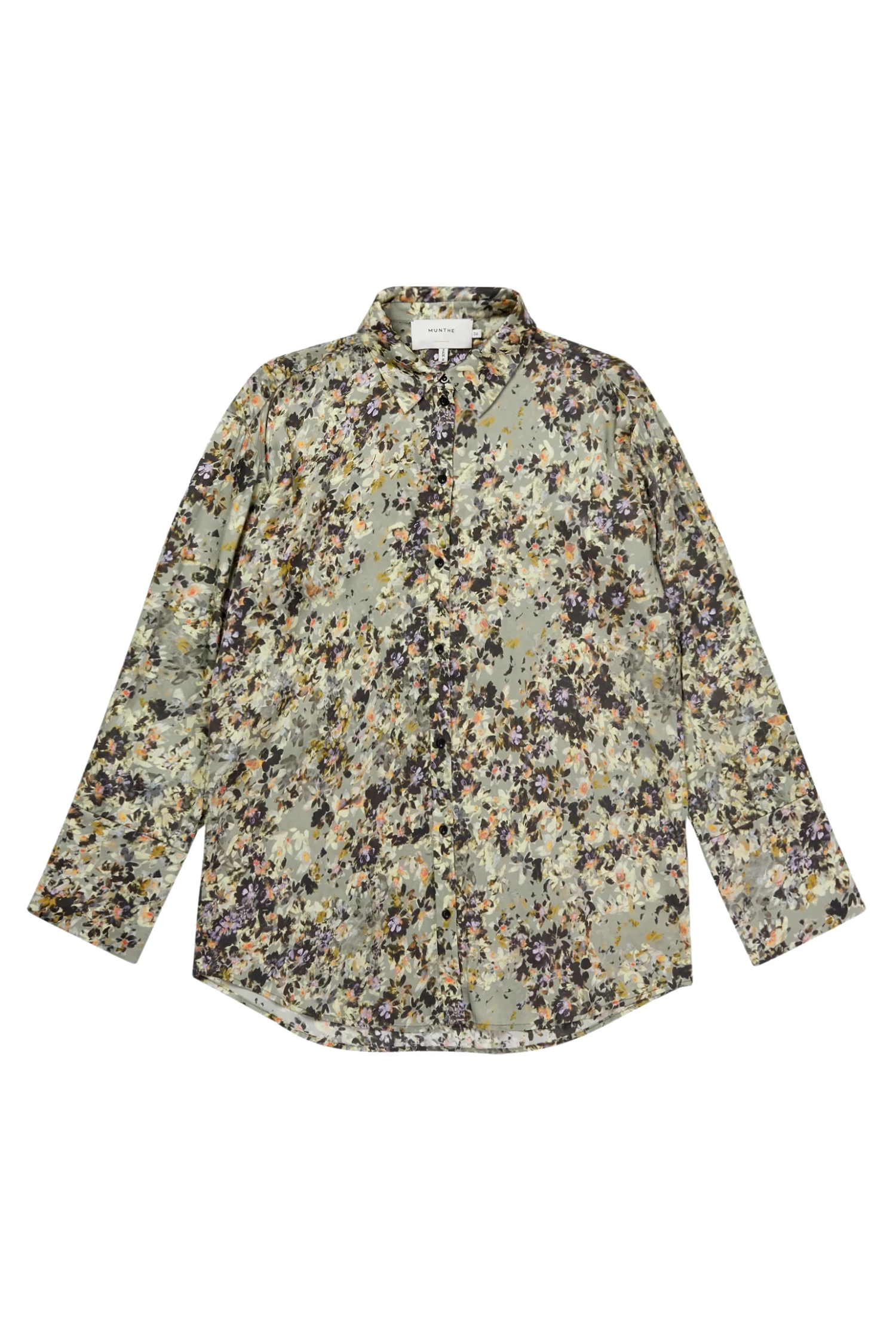 The shirt has a loose fit, placket and cuffs with button closure, and it is slightly longer at the back.