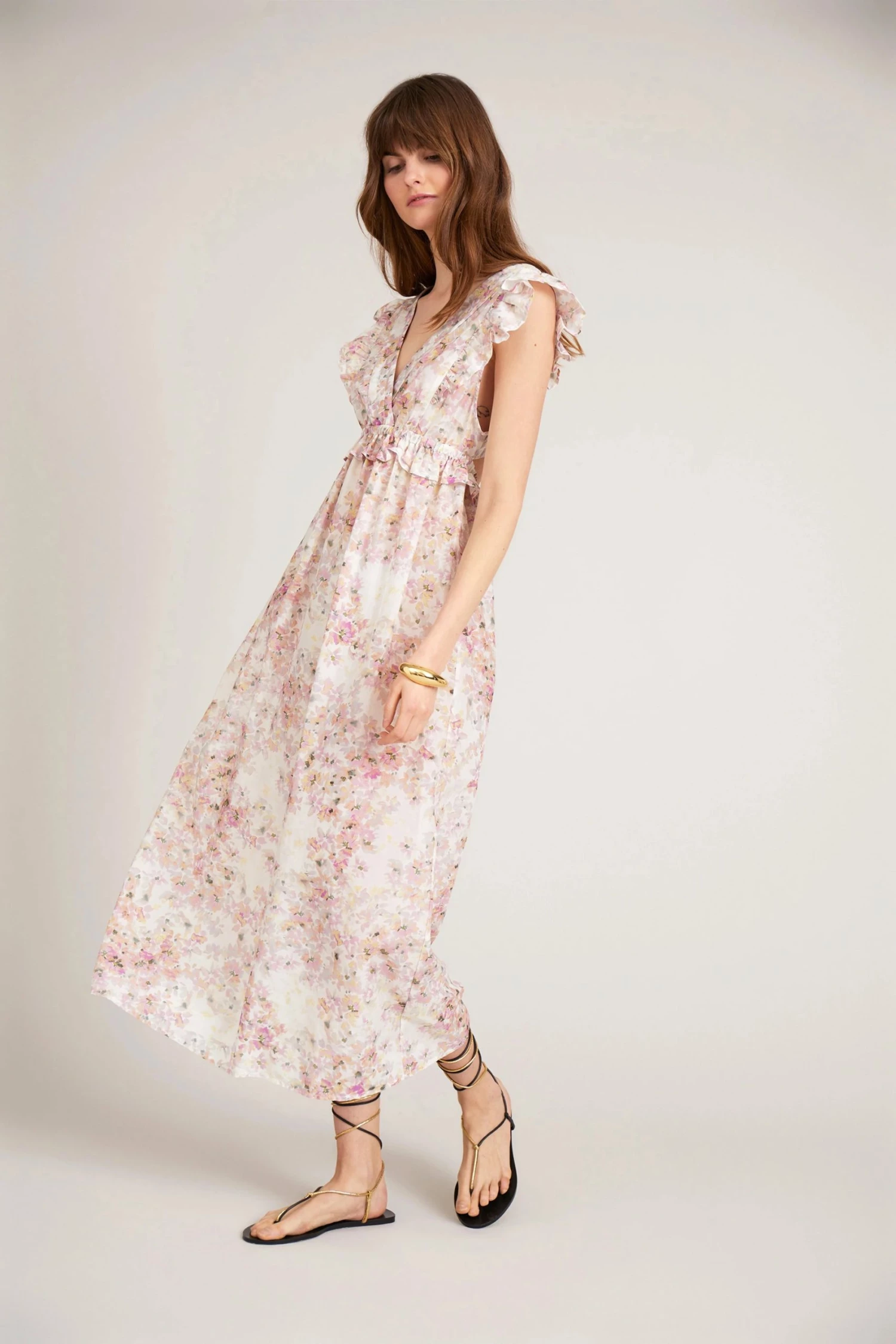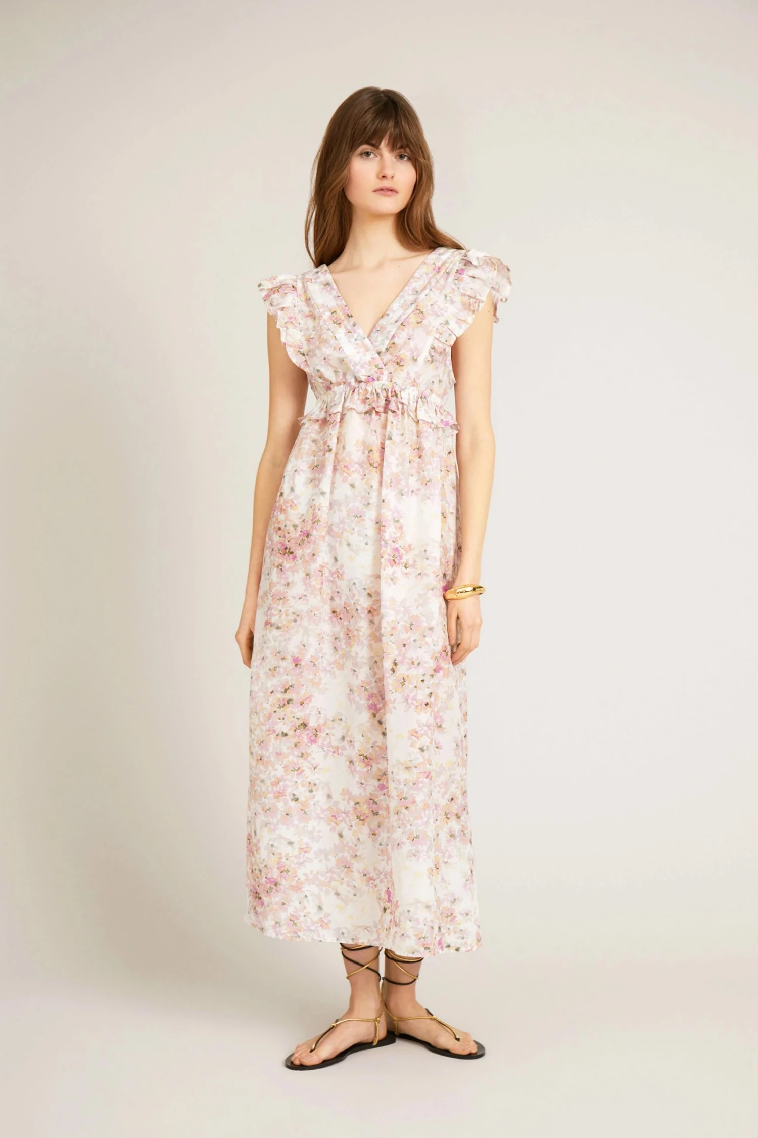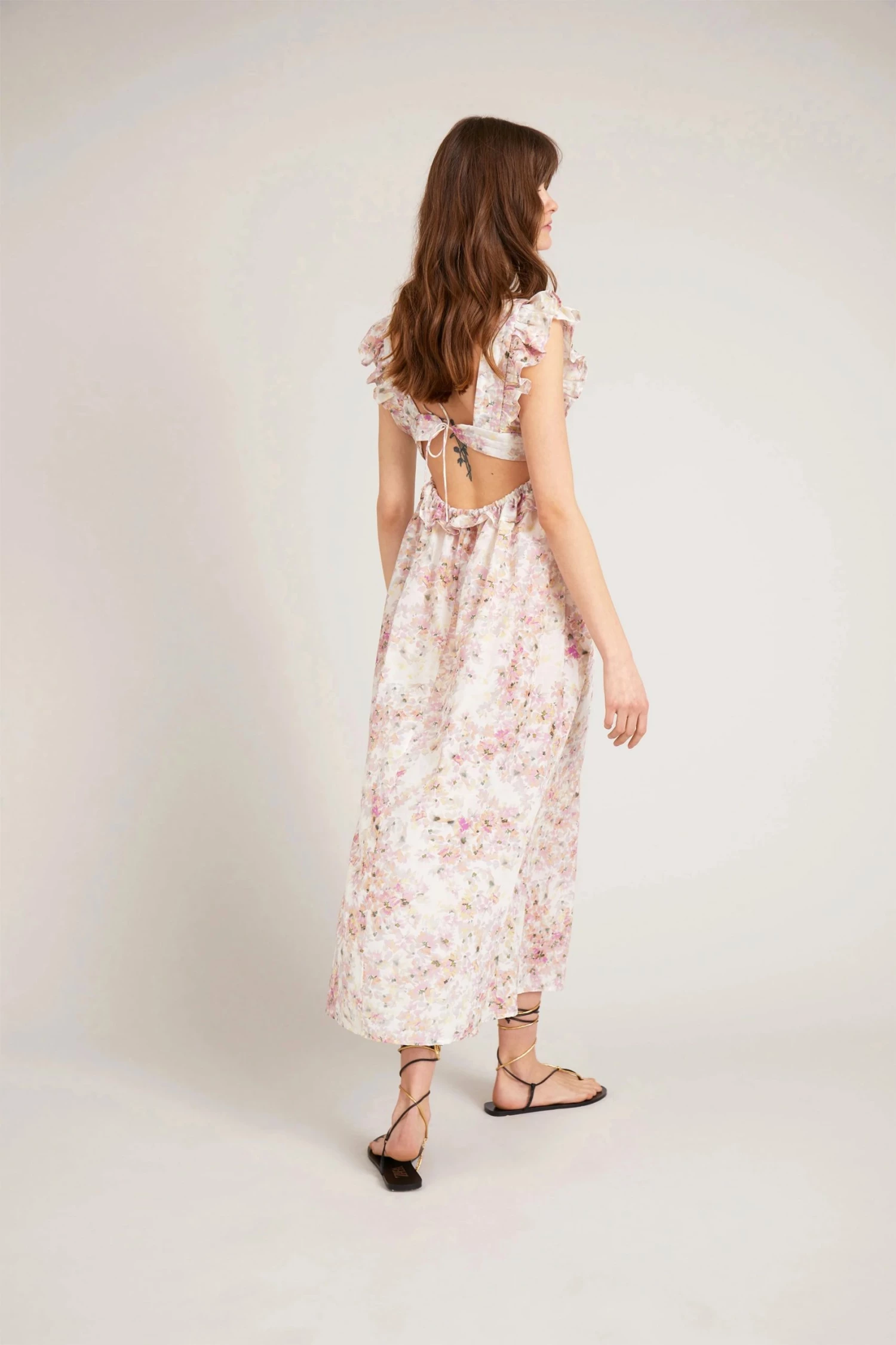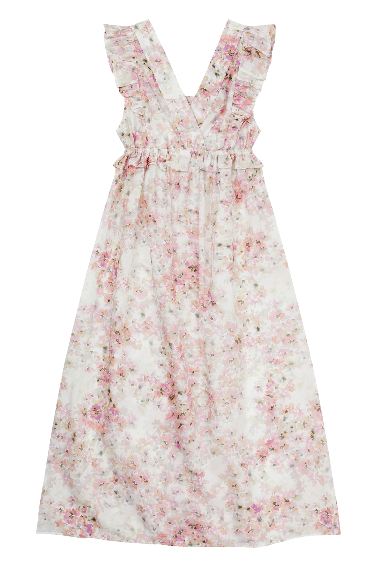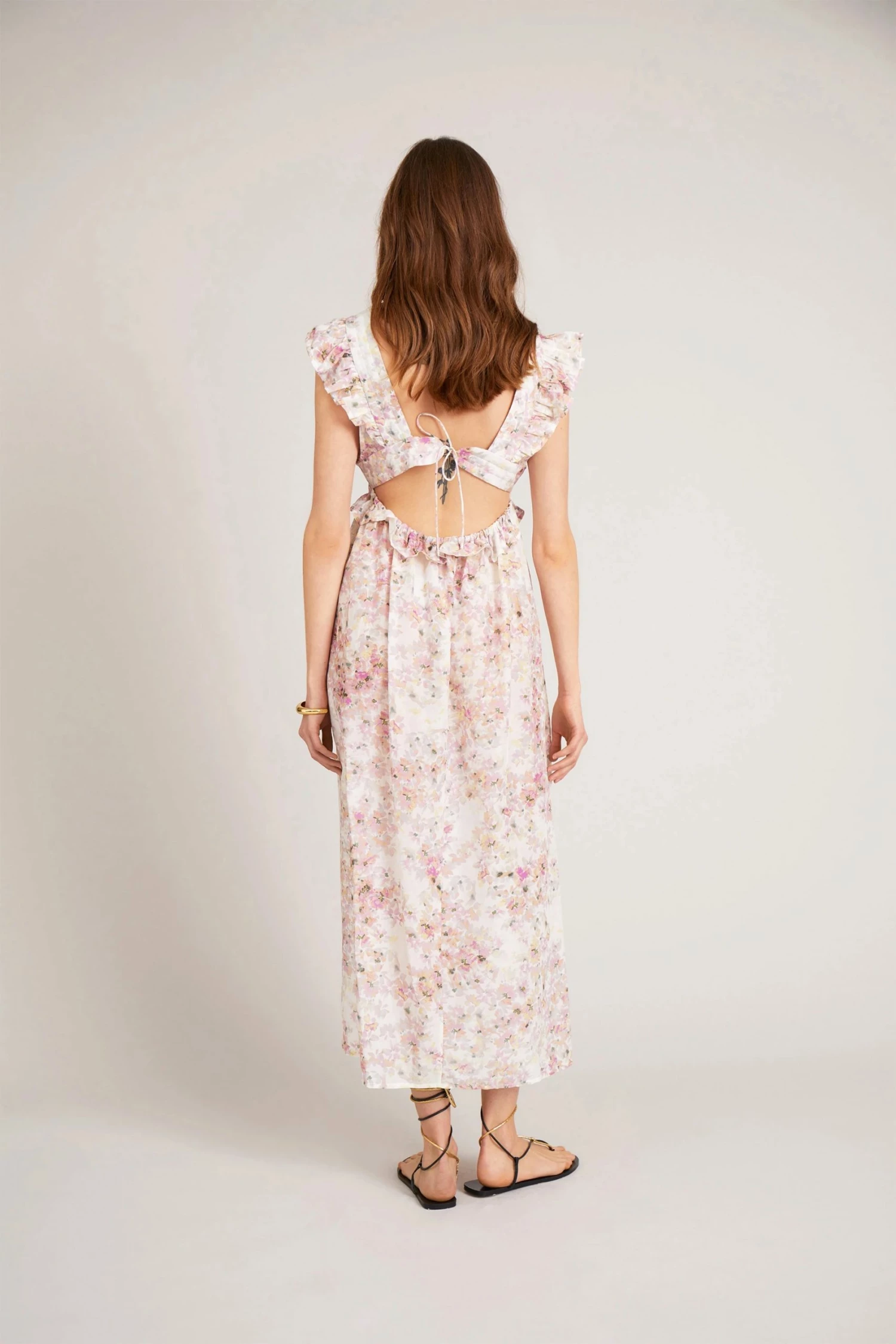 The dress has a V-neck with overlap, a deep back with tie closure and frill details along the shoulders, front and back. Regular fit. Available in rose with a beautiful print.