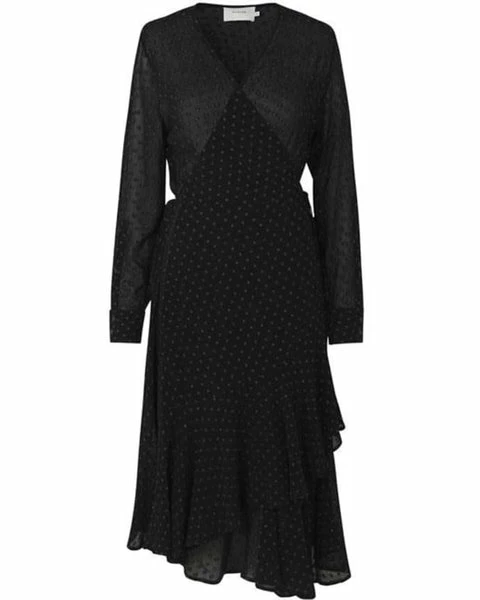 Flattering wrap dress in viscose with lurex dots. The dress has frill details and V-neck. Wear it with sneakers and a knit for a cool everyday look or with boots or heels for an evening look. Due to the material, the style may shrink a little after washing. Since Munthe plus Simonsen was established in 1994, the brand has undergone immense growth, winning prestigious awards and worked with internationally recognized brand ambassadors and top-models, and become known for its lavish fashion shows. In 2014, the brand was relaunched by founder and creative director Naja Munthe under the name MUNTHE. Munthes designs are easily recognizable by their artistic, free-spirited, enthusiastic and contrasting characteristics. MUNTHE is synonymous with clothing that is to be worn and loved, and a style which is both relaxed and festive.