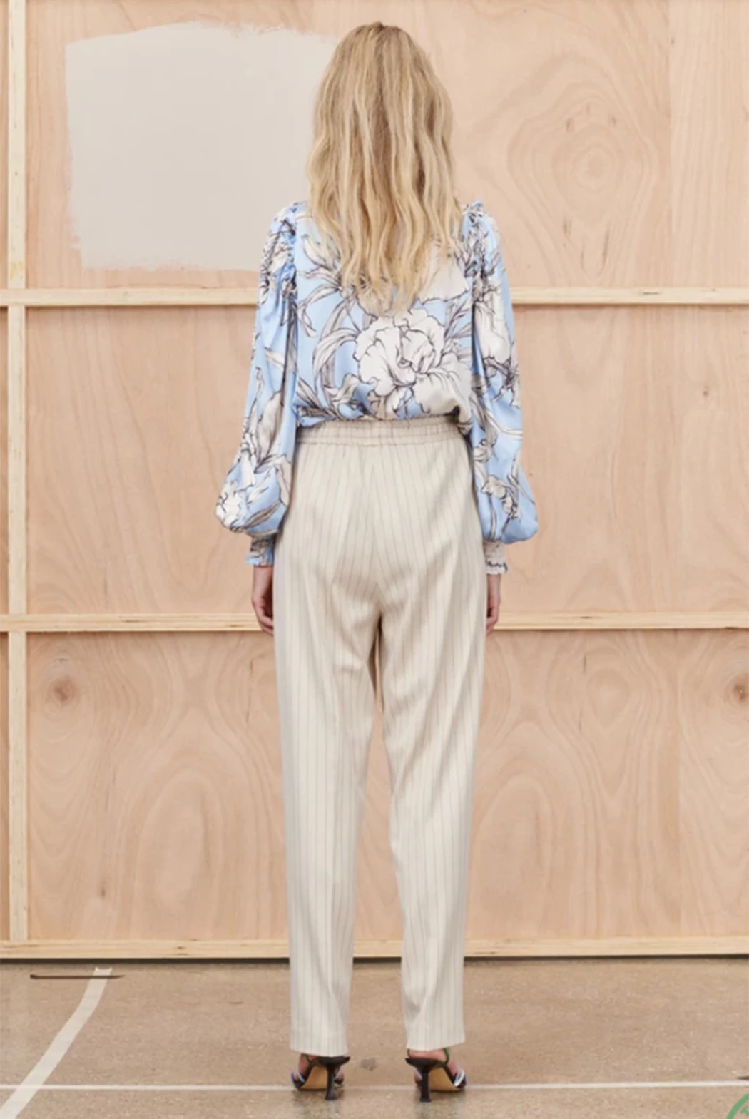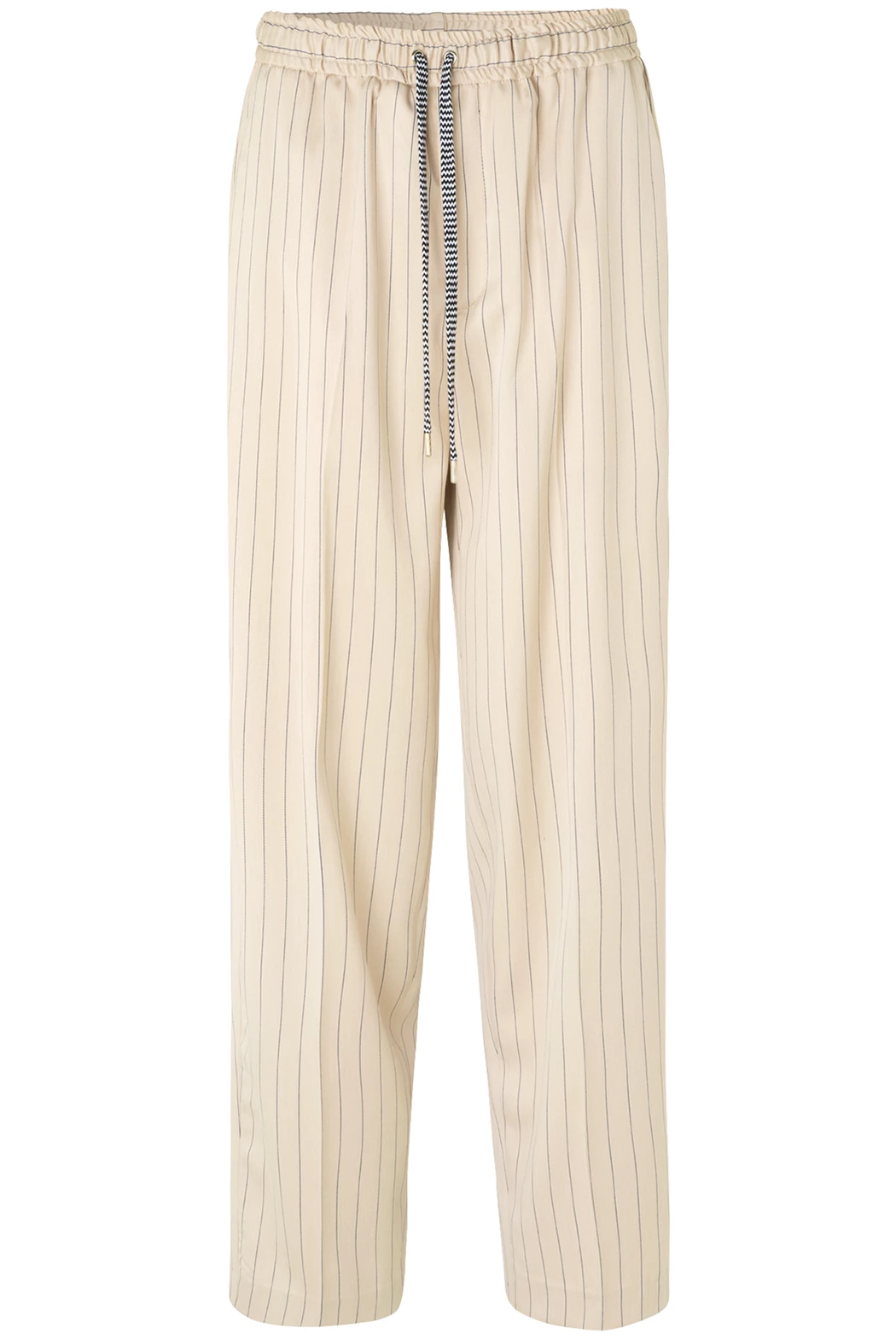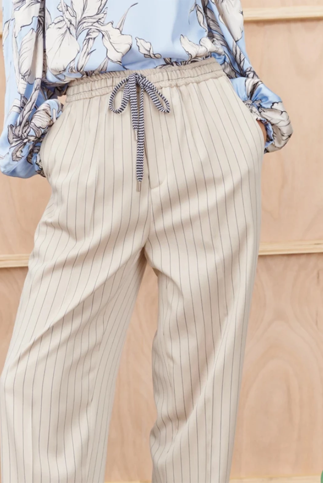 Very wearable suit pants in a recycled polyester mix with thin stripes and with front press fold. The pants have a high waist – with elastic band, side pockets and pressed creases to enhance the straight legs.