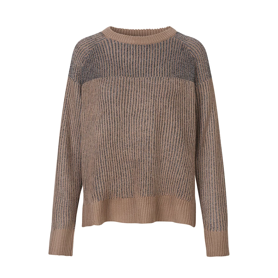 Soft knit in merino wool with glittery lurex details. The knit has long sleeves and a round neckline. Wearable with jeans and sneakers for a nice everyday look.