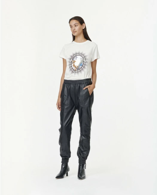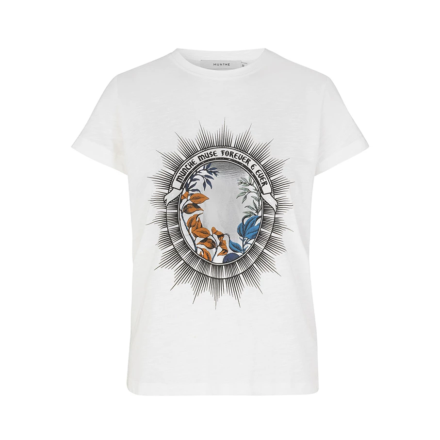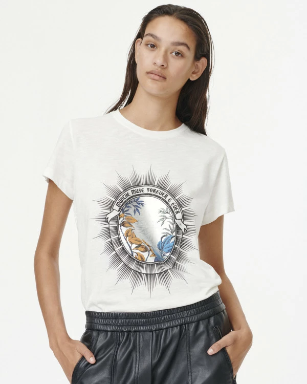 Cotton T-shirt with short sleeves, round neckline and print on the chest. Wear it with a light skirt or a pair of jeans for a cool everyday look.