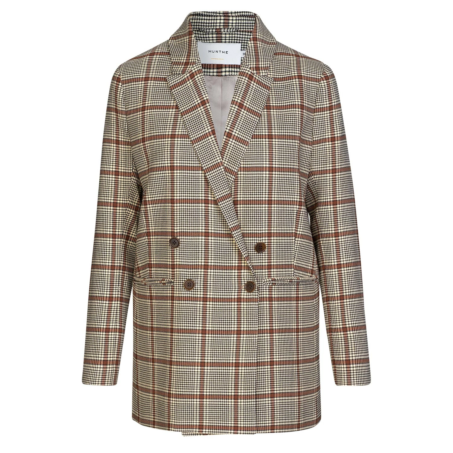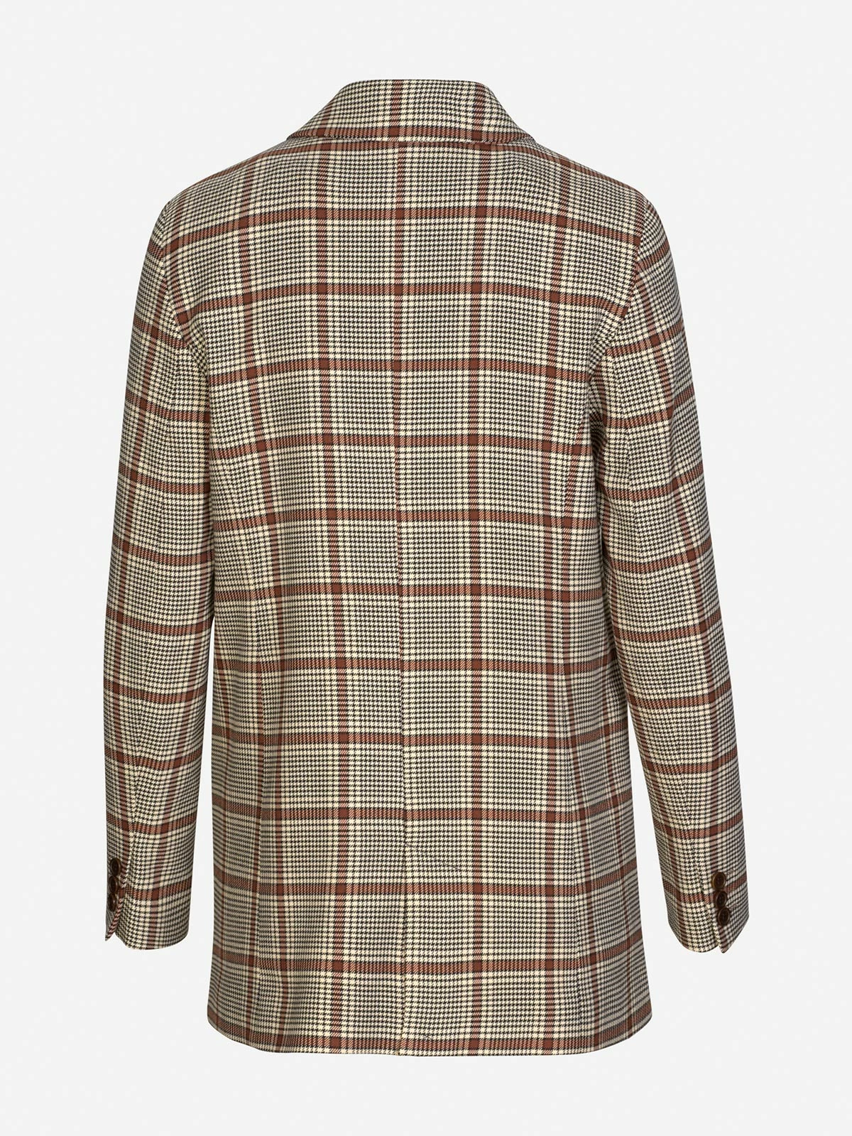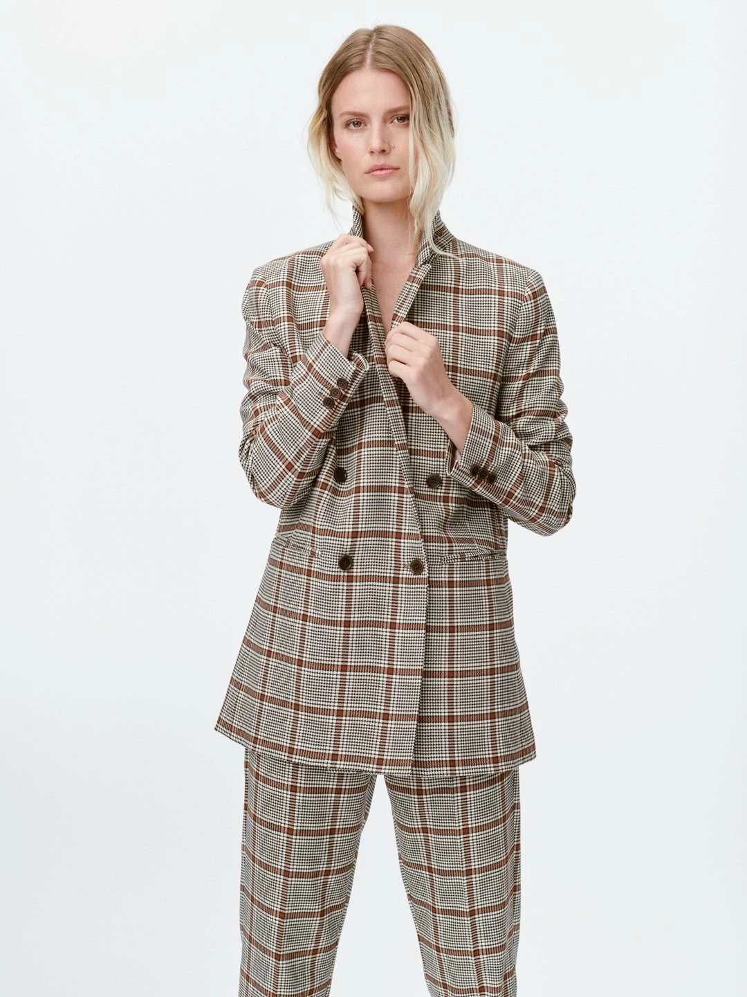 Classic double-breasted fitted blazer in a handsome diced fabric.