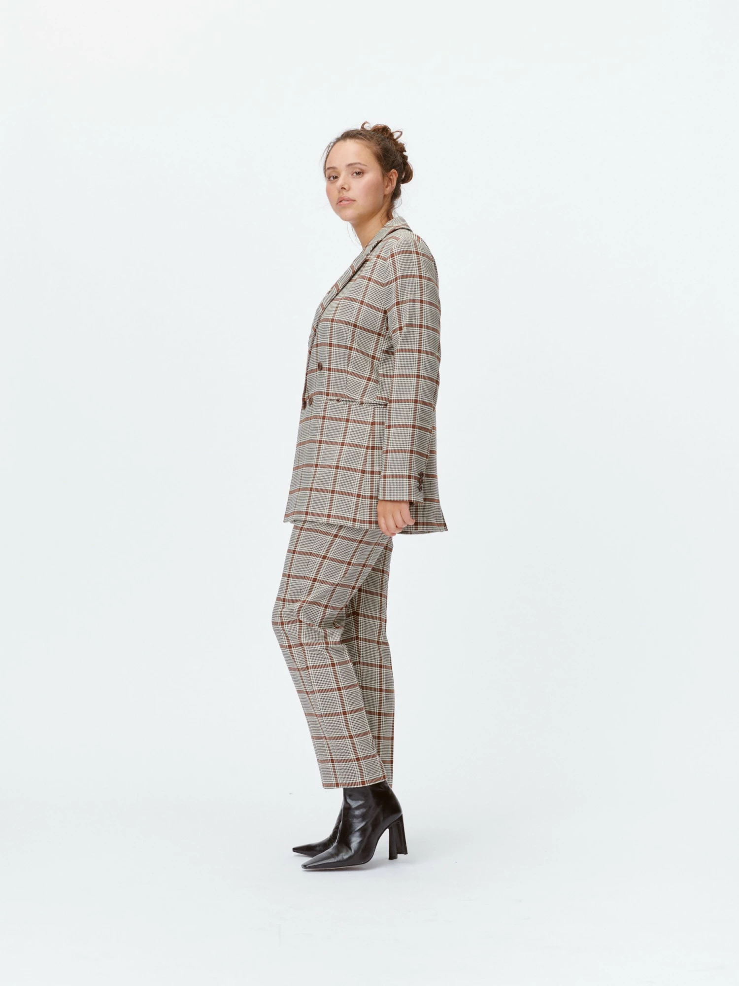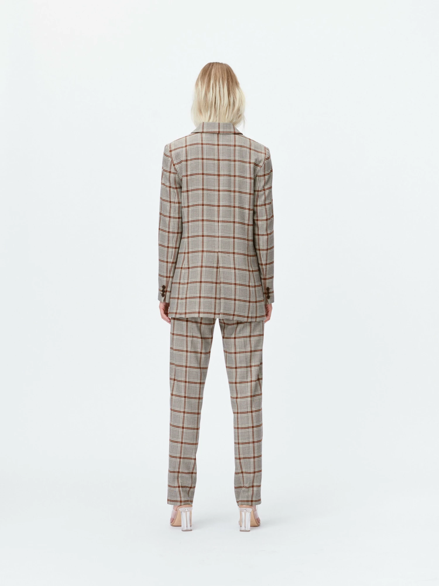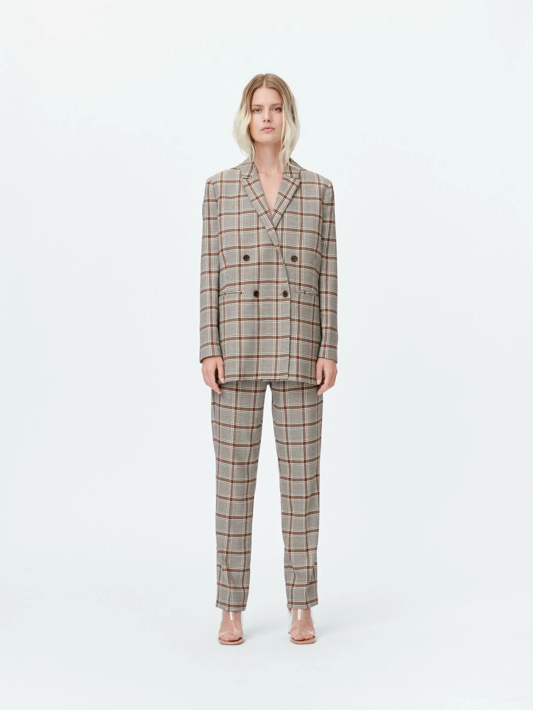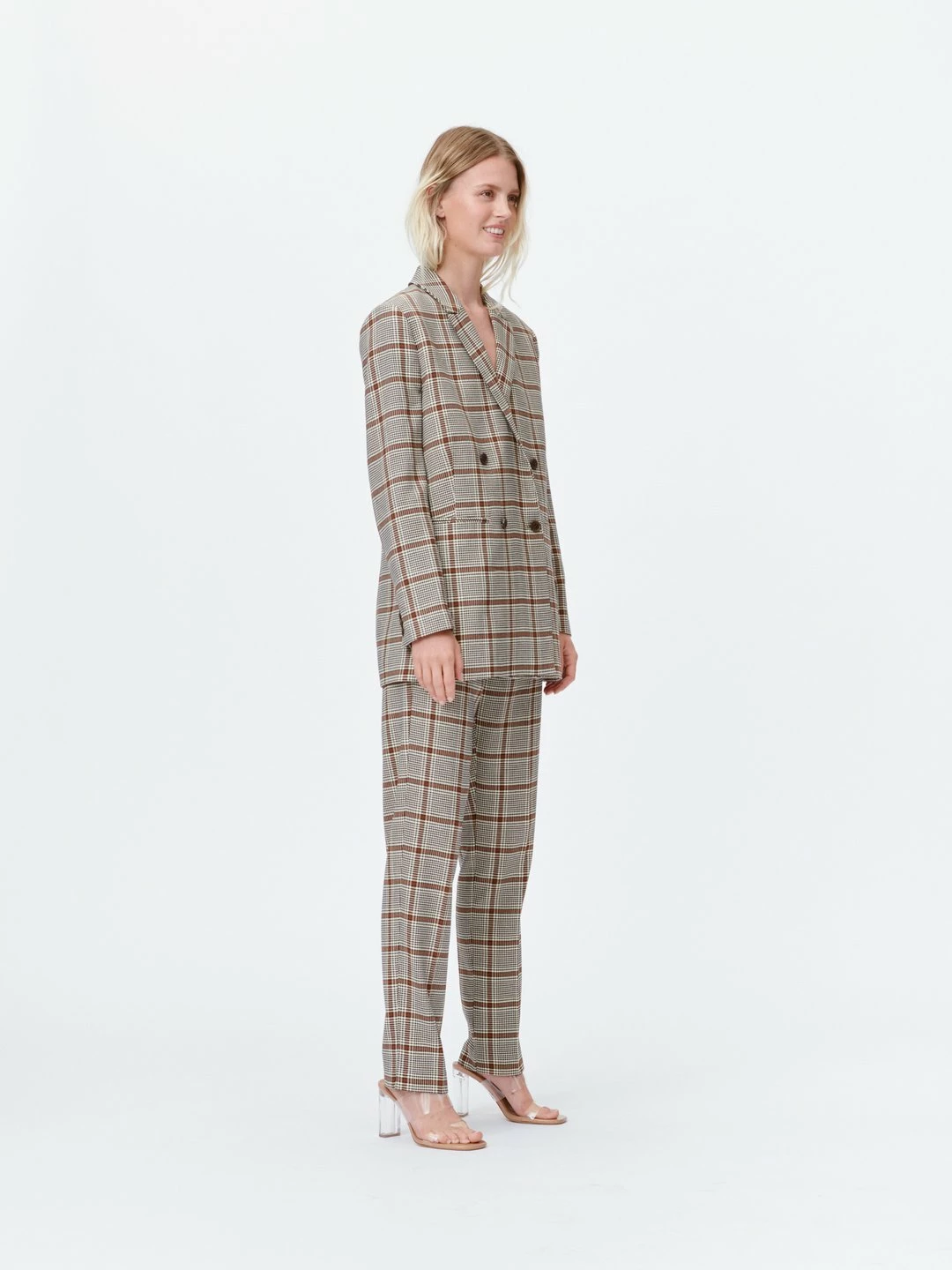 Classic double-breasted fitted blazer in a handsome diced fabric.