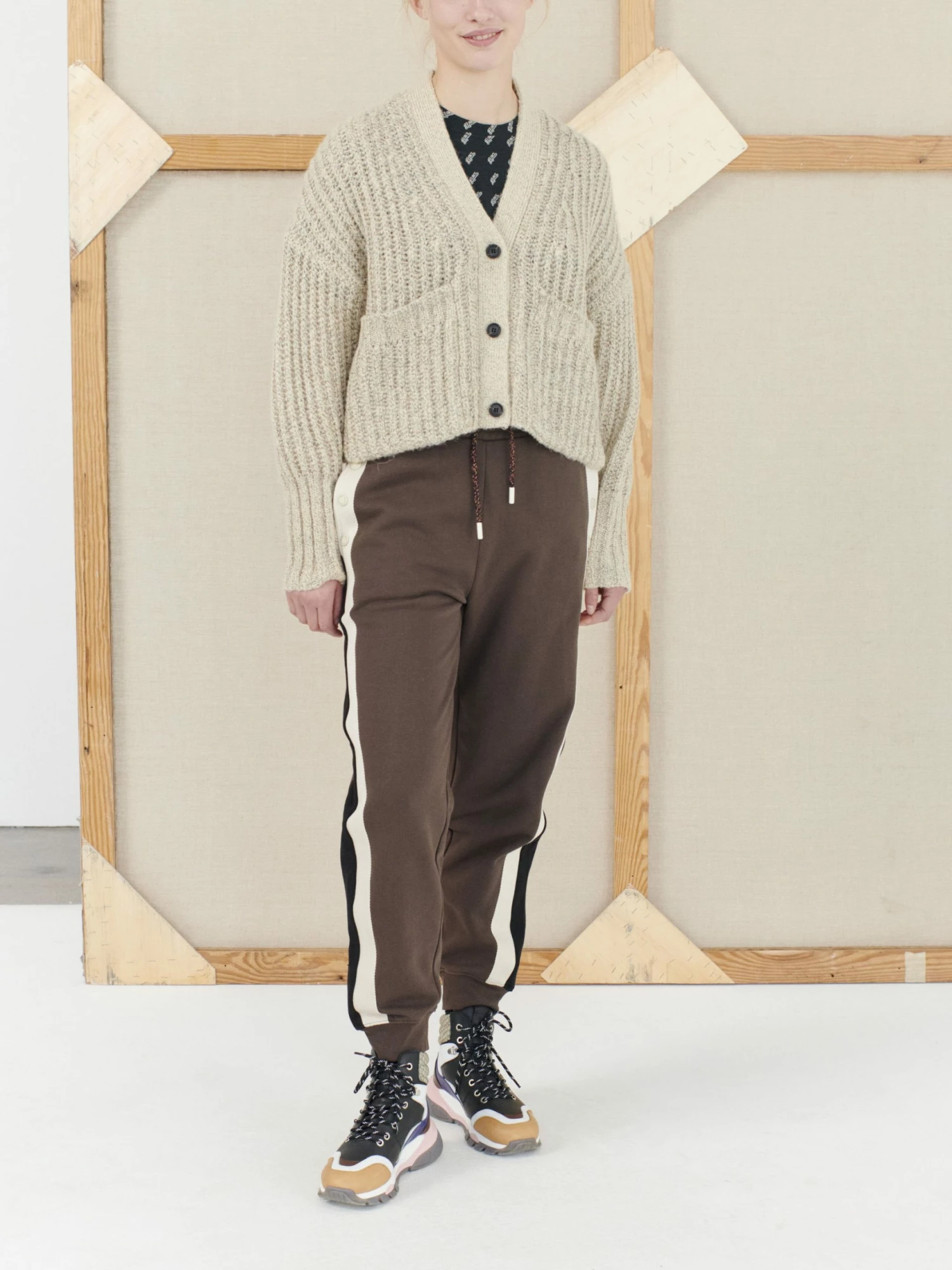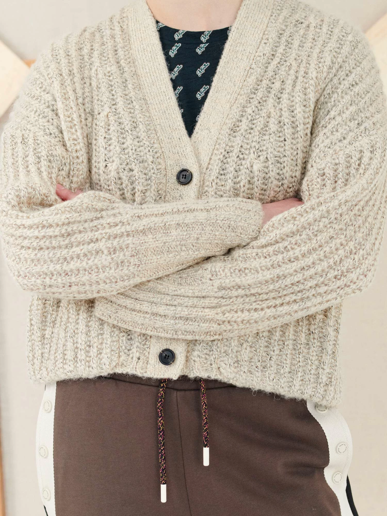 Beautiful, long-sleeved cardigan with a loose fit. The Nark Knit has dropped shoulders, button closure and big pockets at the front. Wide rib along the neckline, at the end of the sleeves and at the placket. Available in kit.
