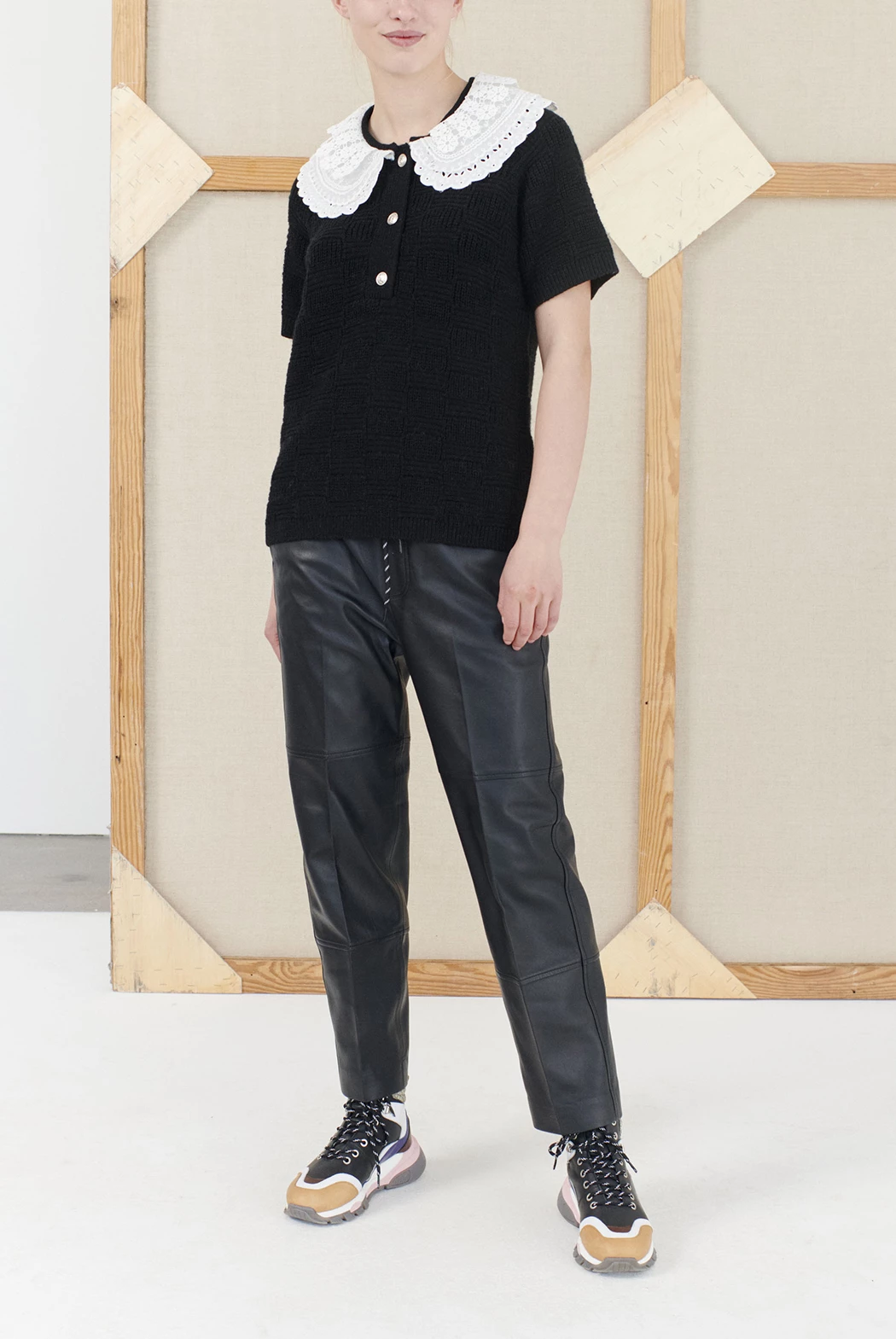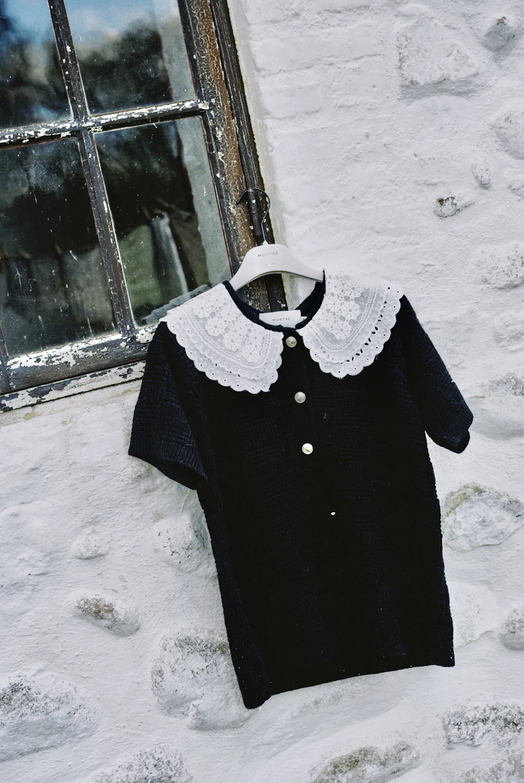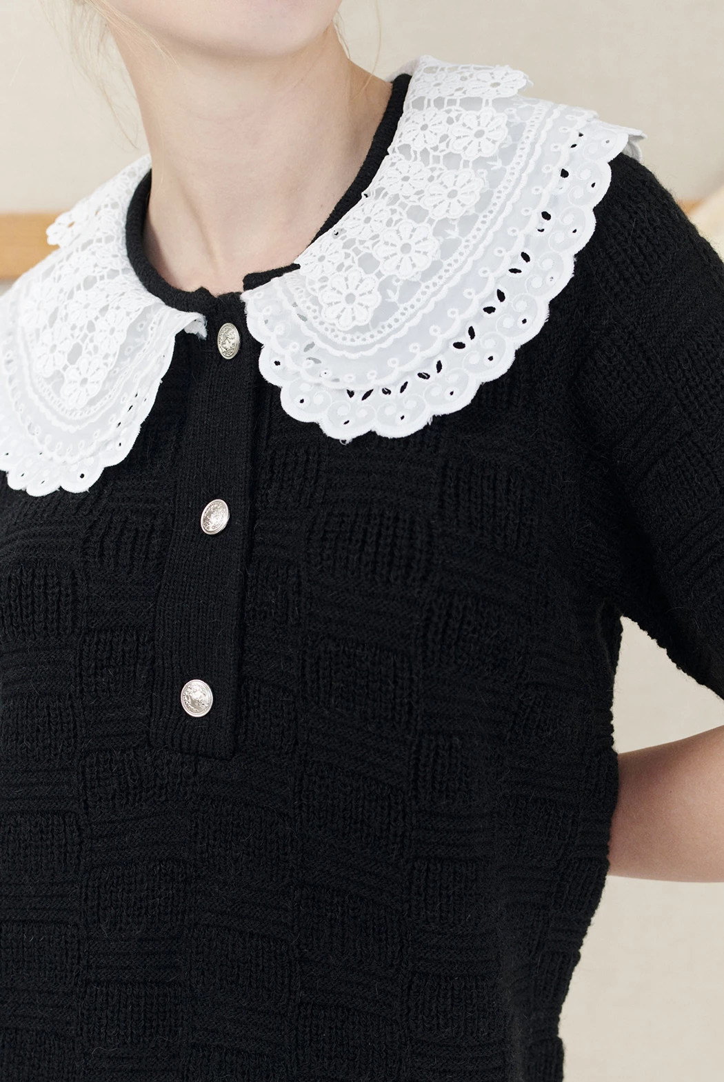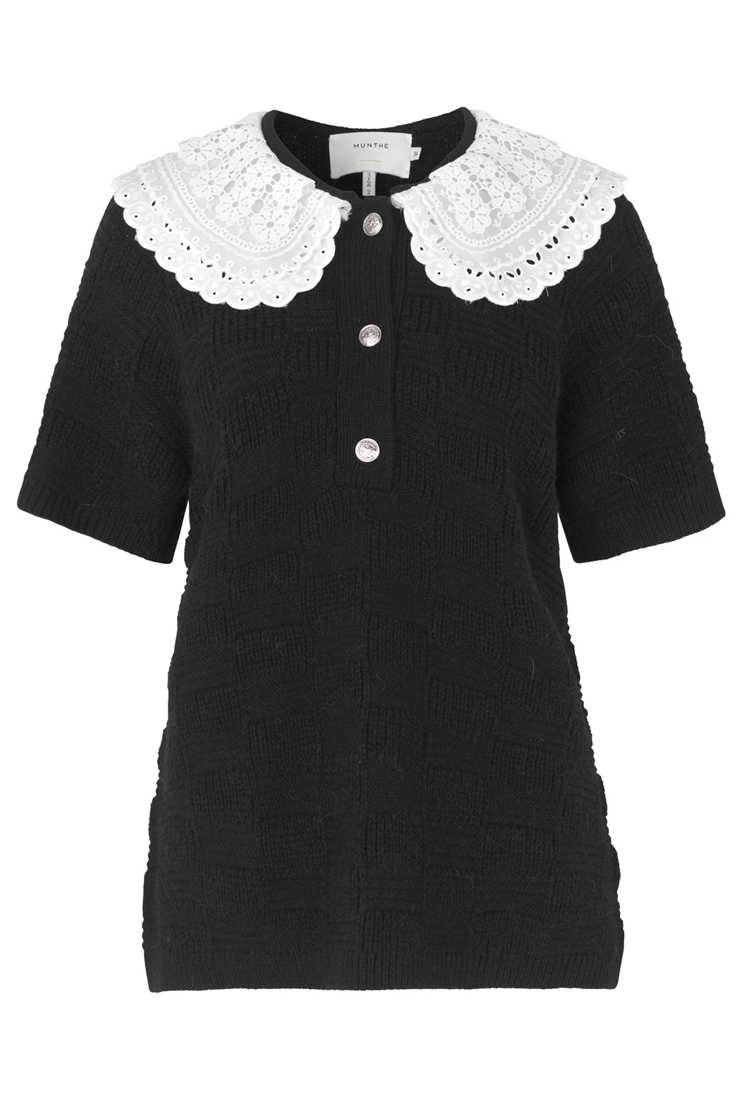 Beautiful, polo inspired knit with a big lace collar. The knit has a regular fit and short sleeves.
