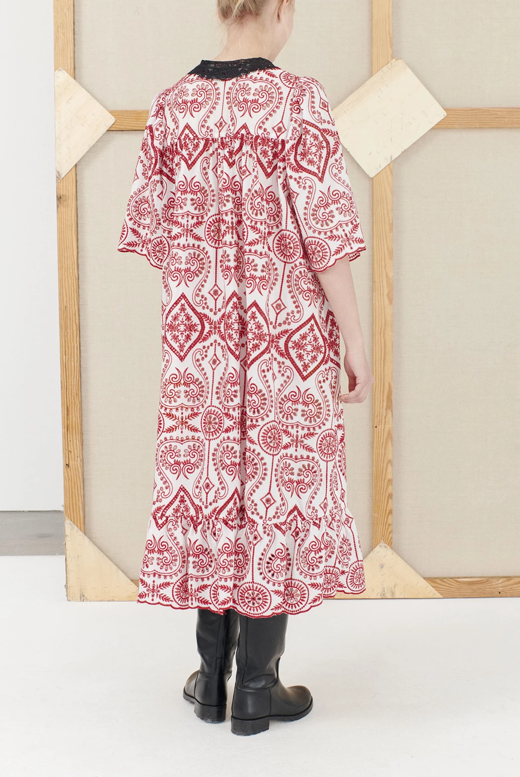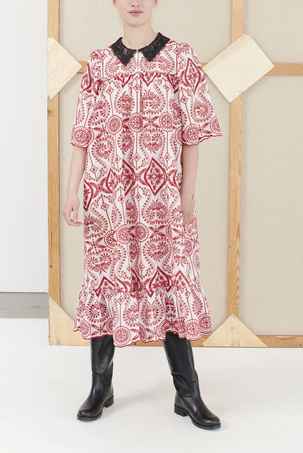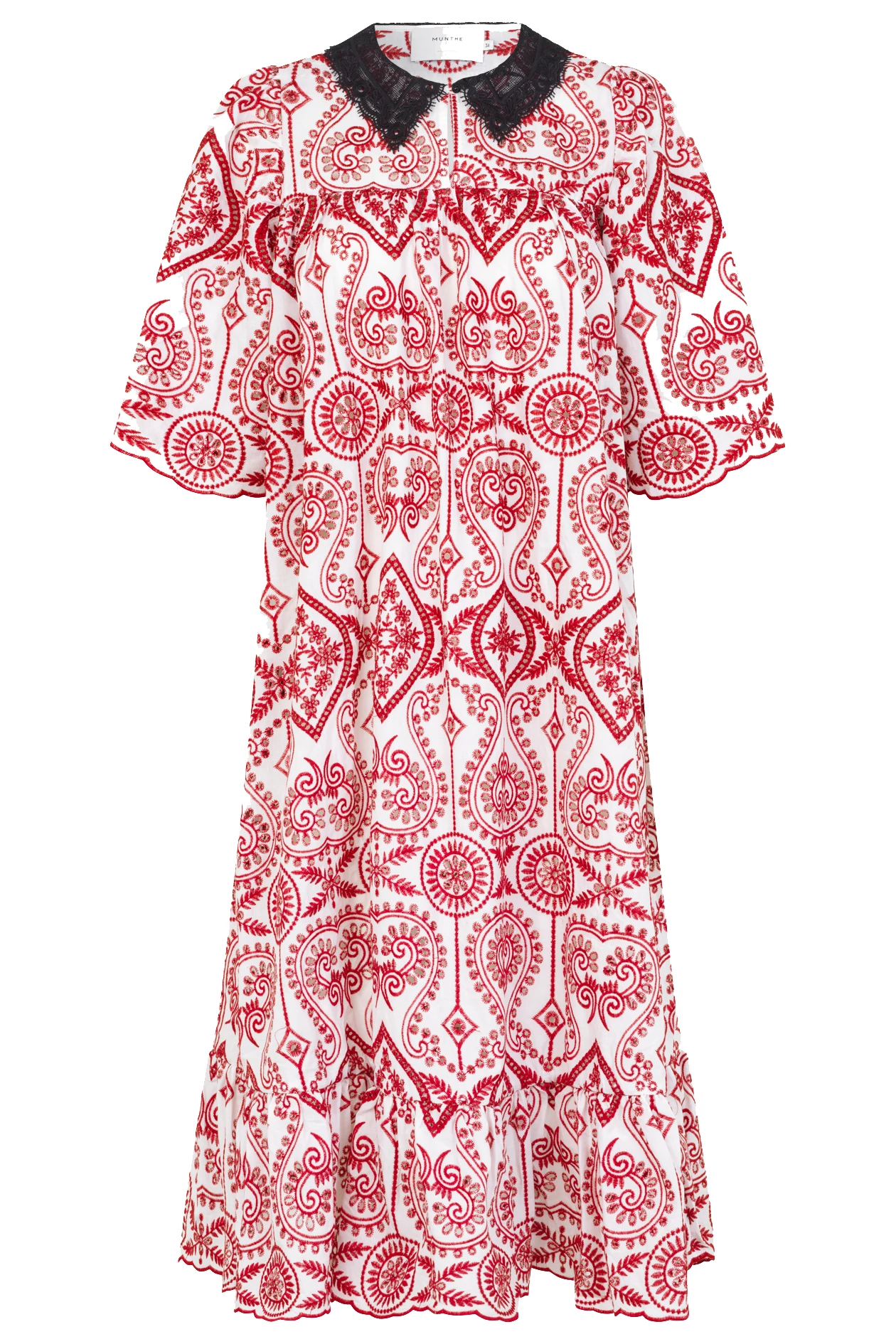 Beautiful, knee-length dress in organic cotton. The dress has a loose fit and is designed in lovely broderie anglaise, has three-quarter length puff sleeves, lace collar and button closure at the front. Available black and white.