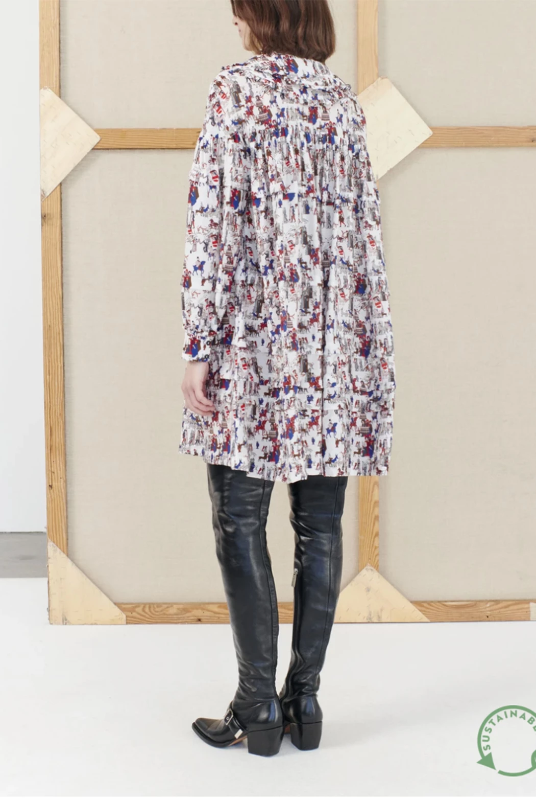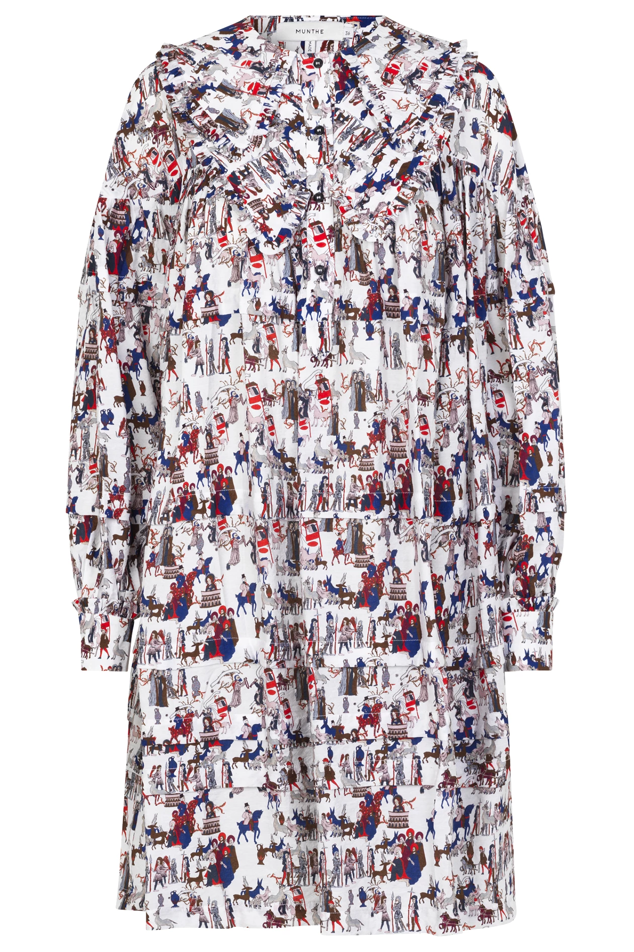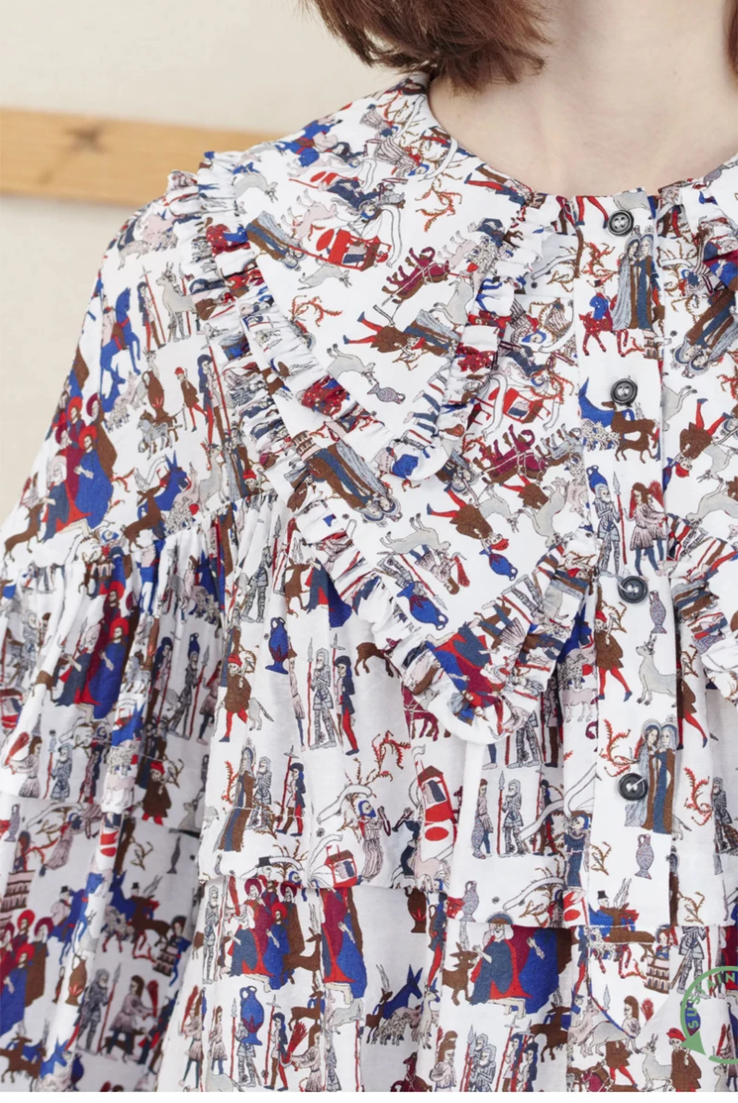 The dress has a loose fit and long, voluminous sleeves with cuffs, lovely pleats and a big double collar with frill detail along the edge. Dropped shoulders and placket in front.