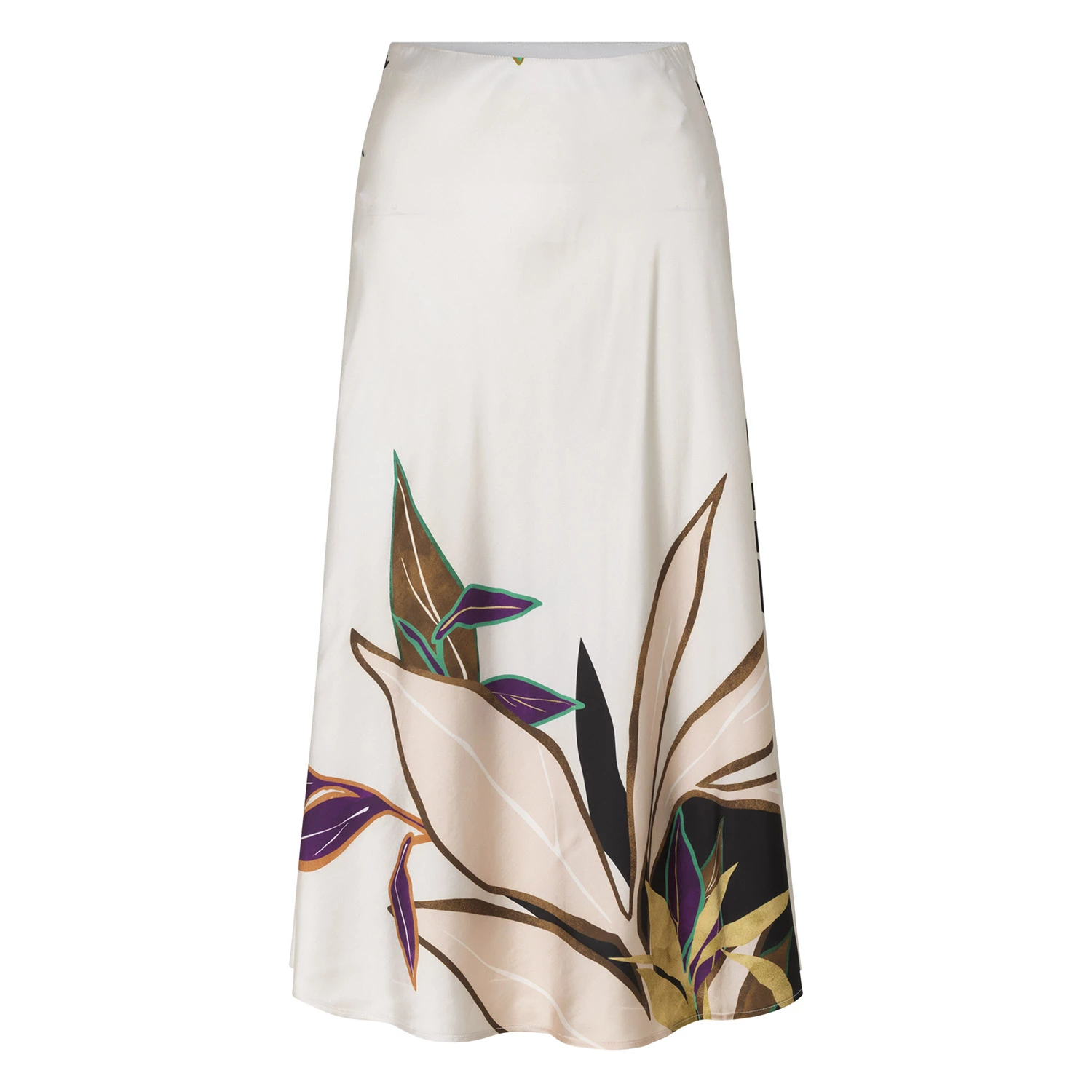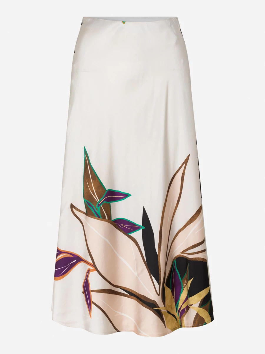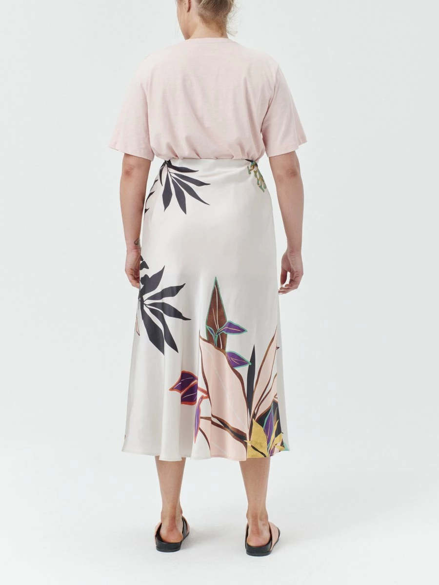 Simple, long skirt in sustainable viscose. The Pani skirt has an elastic waist and a beautiful leaf print which is unique to each individual style. The fabric is cut at an angle, which gives it a nice, draped effect. Available in ivory.