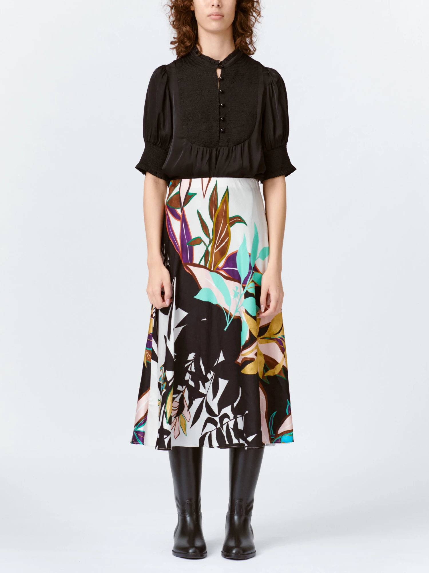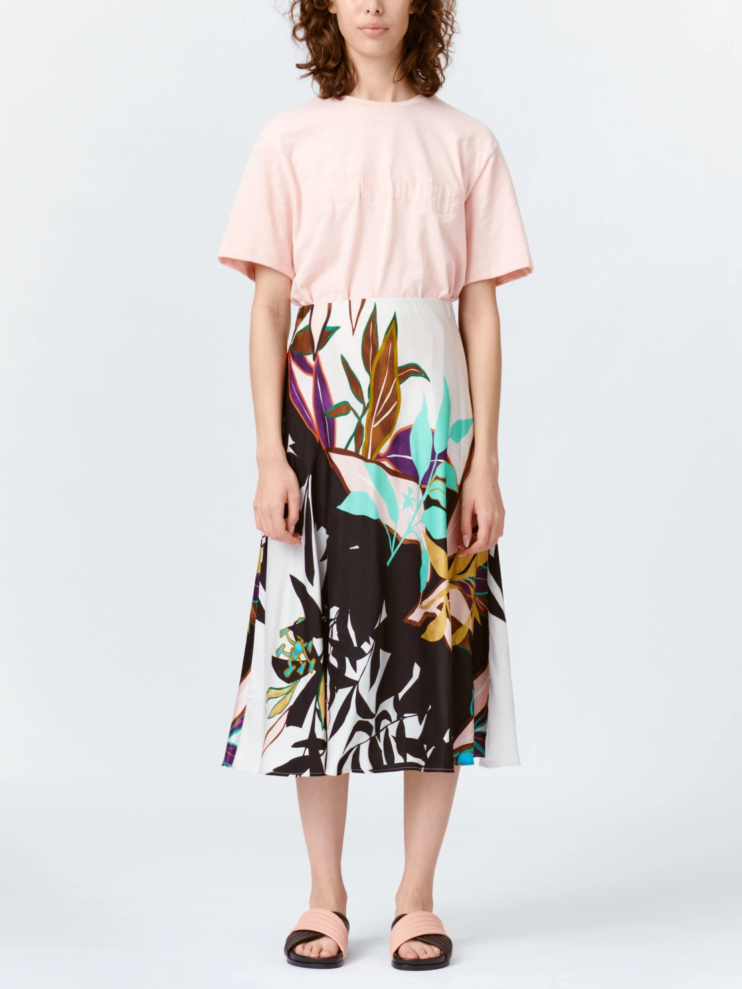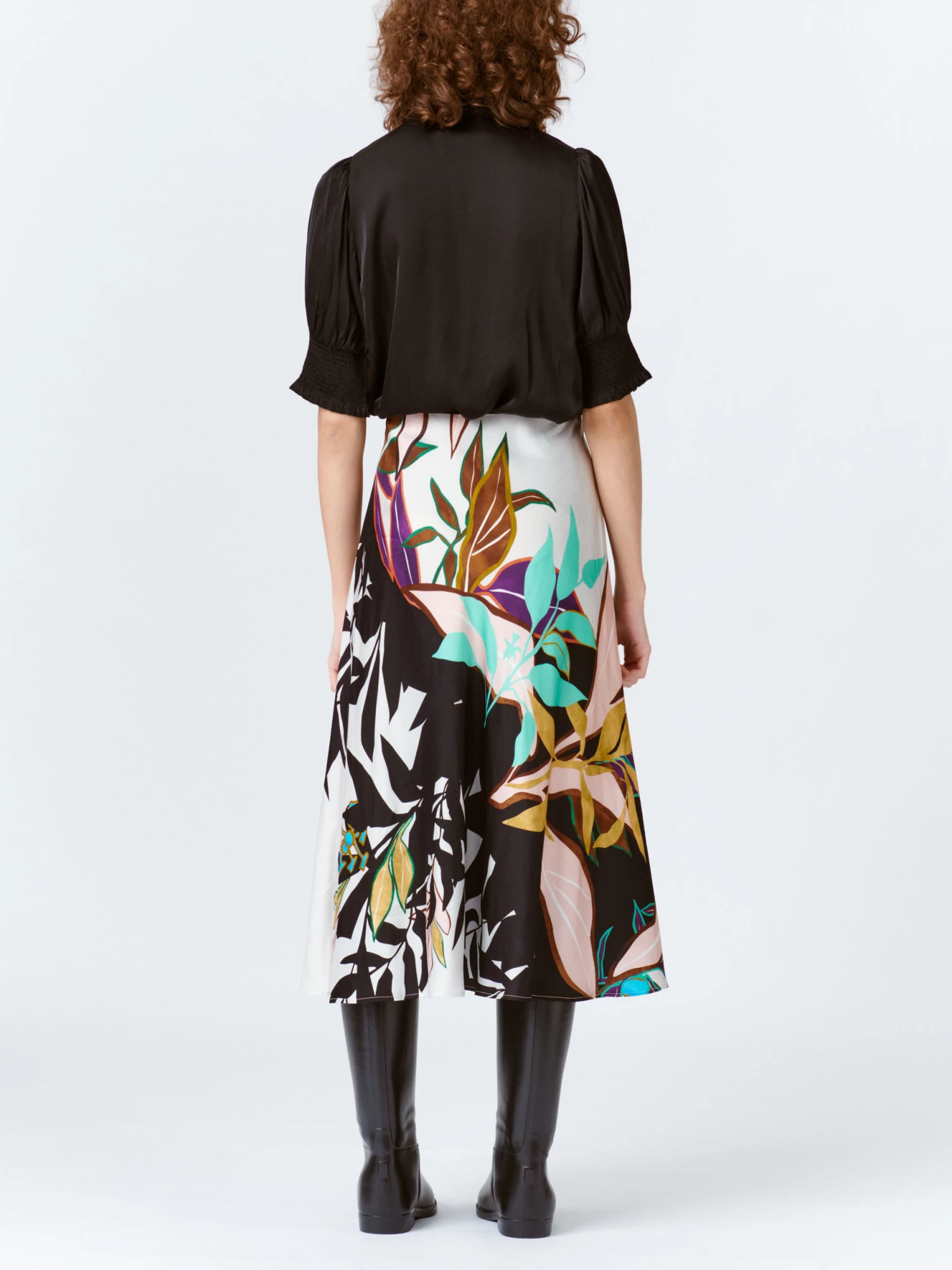 Simple, long skirt in sustainable viscose. The Pani skirt has an elastic waist and a beautiful leaf print which is unique to each individual style. The fabric is cut at an angle, which gives it a nice, draped effect. Available in ivory.