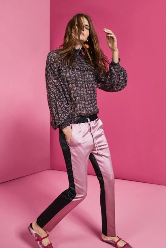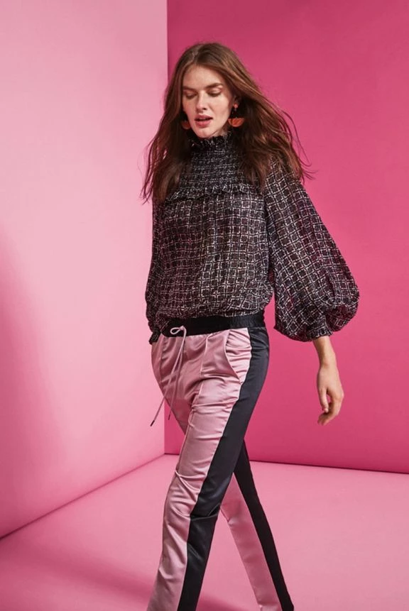 The Norma pants are colour blocked in pink and black and have an elastic waistband. A comfortable style for everyday use but also a style that can be paired with high heels for a contrasting look.