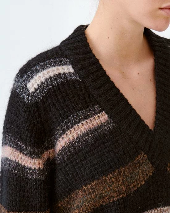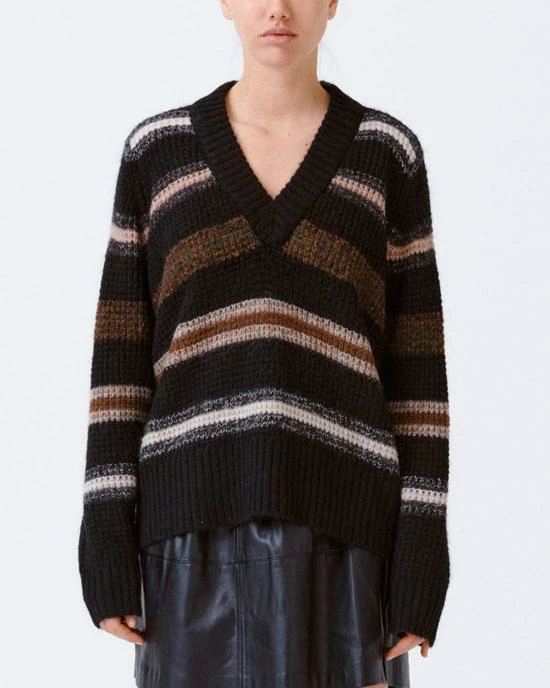 Long-sleeved knit with fine, different-colored stripes. The knit is relatively loose-fitting and has a ribbed edge along the V-neck, the end of the sleeves and the bottom. 30%wool30%polyamide 10%alpaca30%acrylic The model is 178 cm tall and wears a size 36. See more from Munthe here Since Munthe plus Simonsen was established in 1994, the brand has undergone immense growth, winning prestigious awards and worked with internationally recognized brand ambassadors and top-models, and become known for its lavish fashion shows. In 2014, the brand was relaunched by founder and creative director Naja Munthe under the name MUNTHE. Munthes designs are easily recognizable by their artistic, free-spirited, enthusiastic and contrasting characteristics. MUNTHE is synonymous with clothing that is to be worn and loved, and a style which is both relaxed and festive.