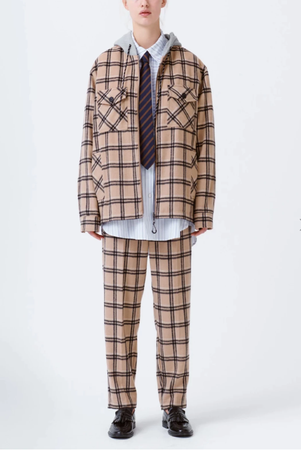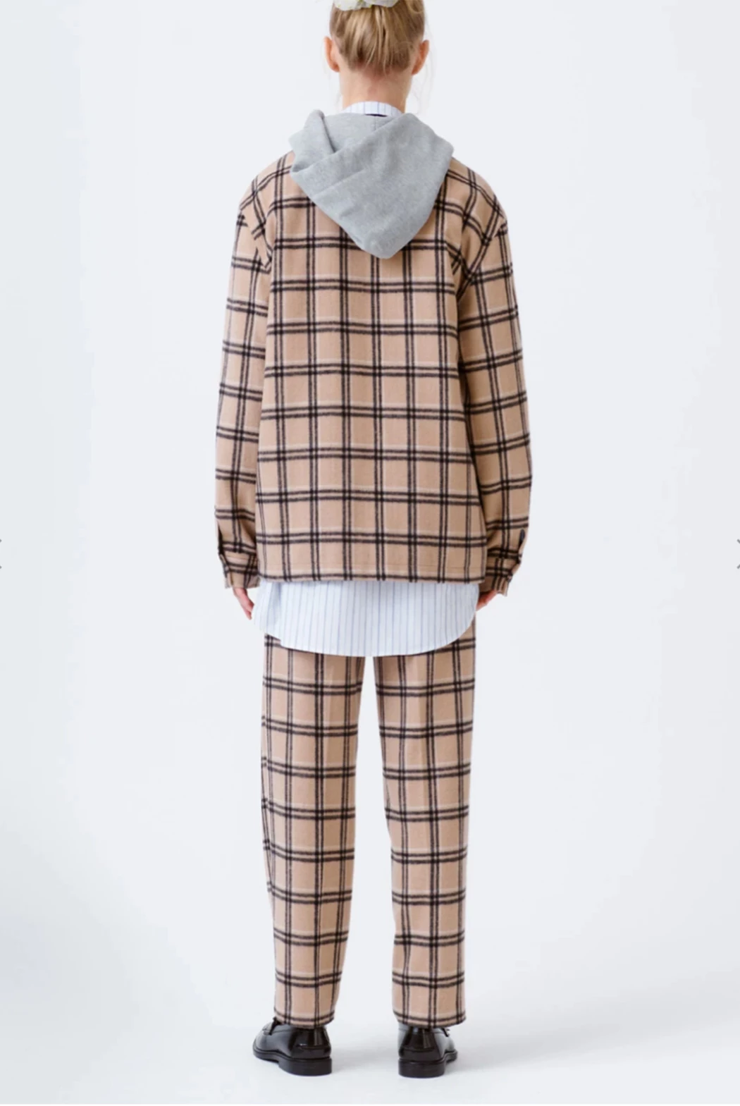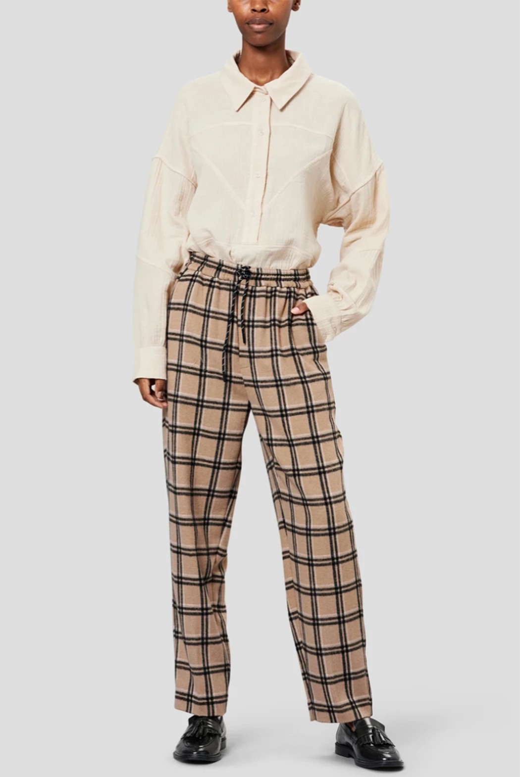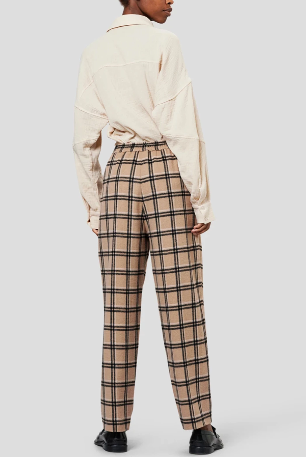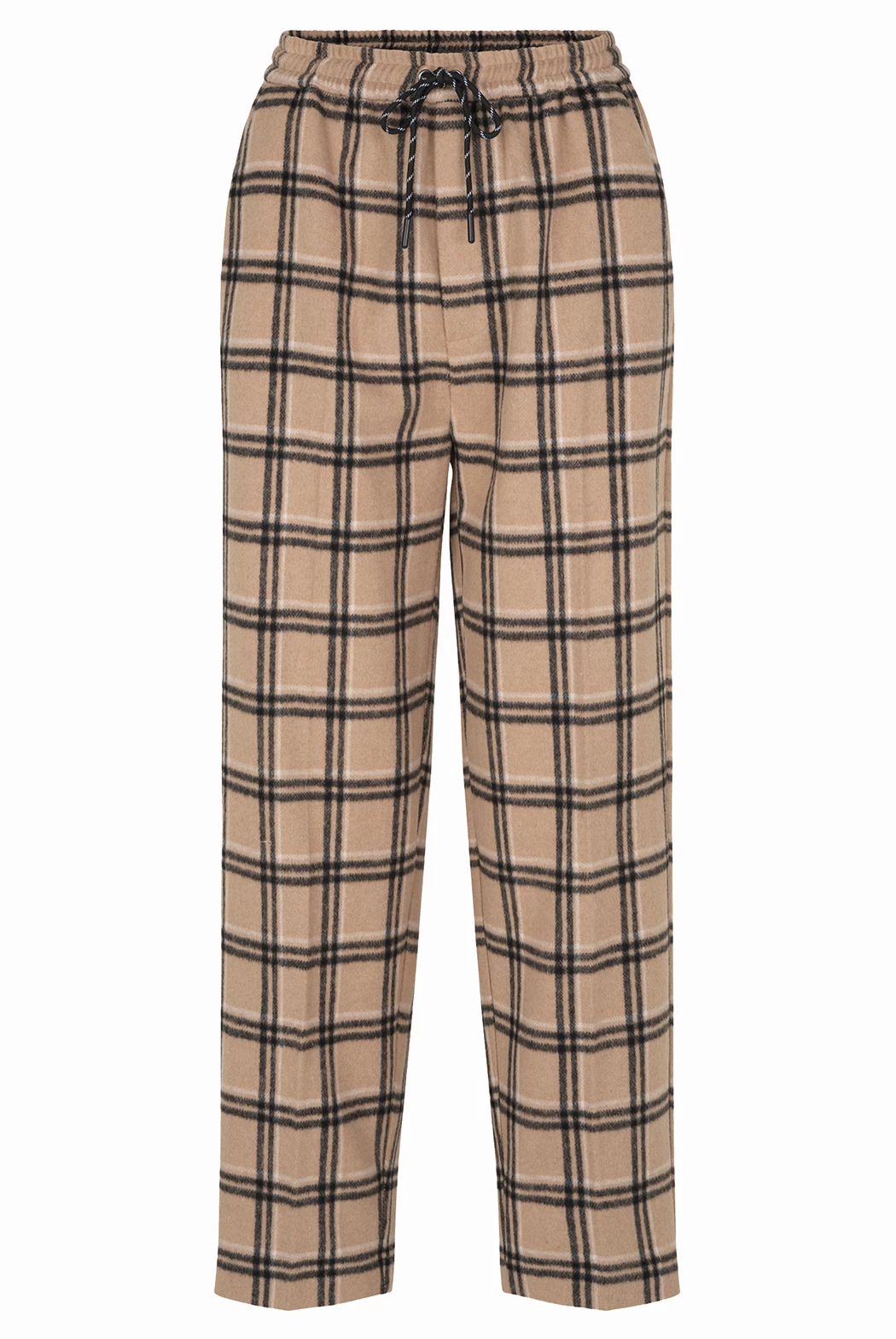 Cool, loose fitting trousers in a checkered wool blend. The trousers have side pockets and elastic and tie at the waist. Available in camel.