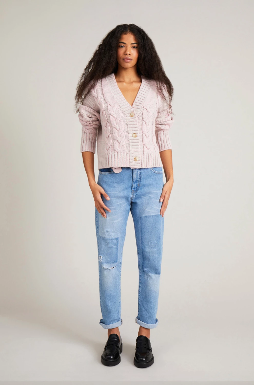 Super stylish cable knit cardigan crafted from a lovely wool blend, designed with a shorter length, a flattering deep v-neck, front button closures and long, voluminous sleeves. Looks great with our DL1961 Mara straight leg jeans for a casual yet trendy everyday look.