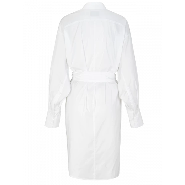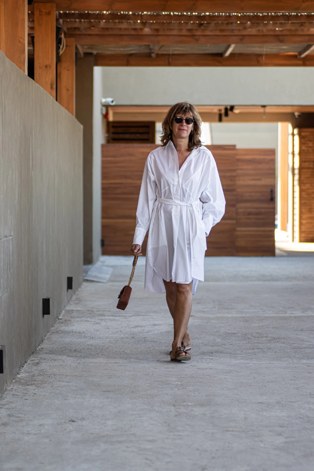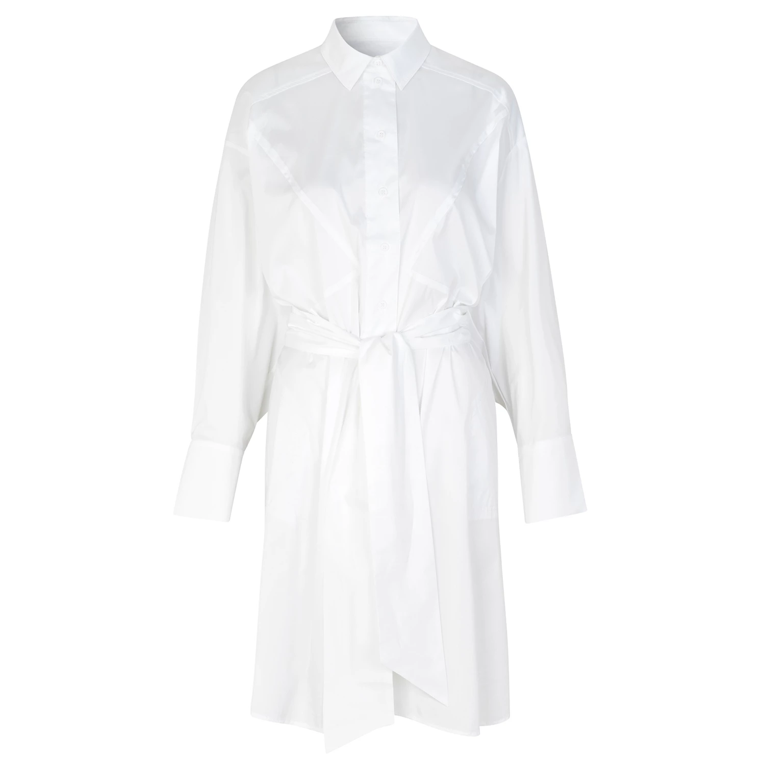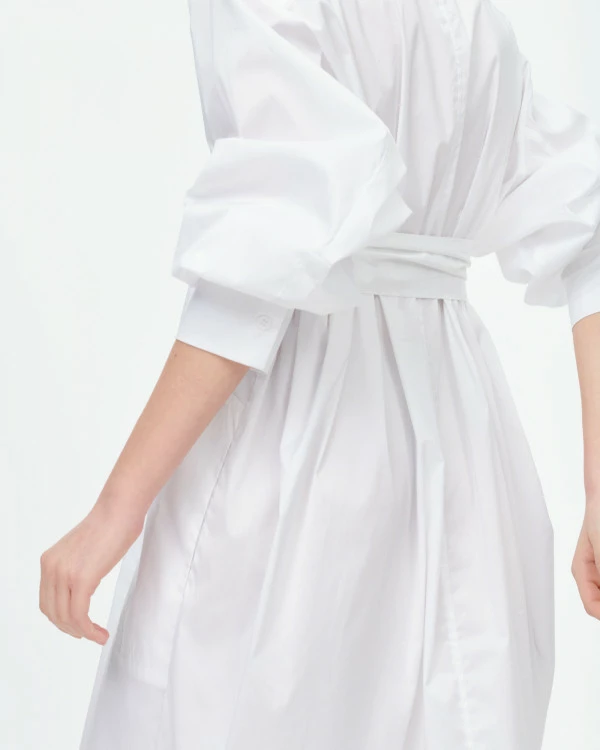 Shirt dress with small collar, belt in the waist and button closure at the chest.