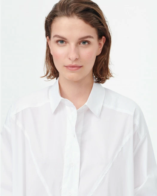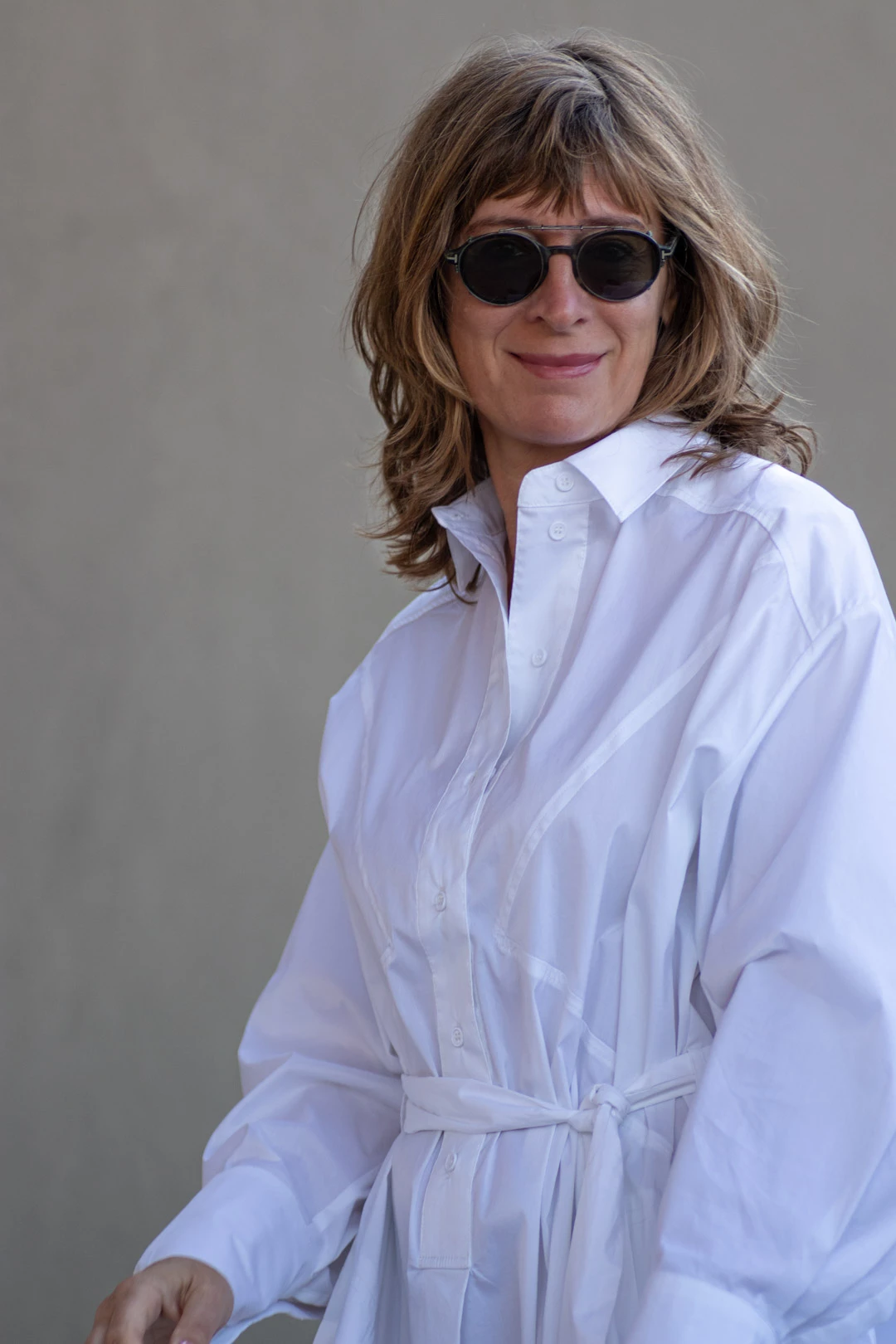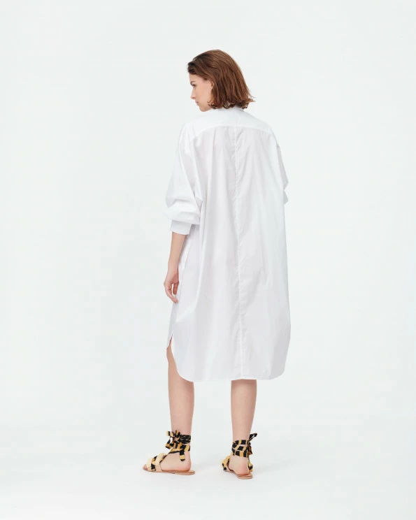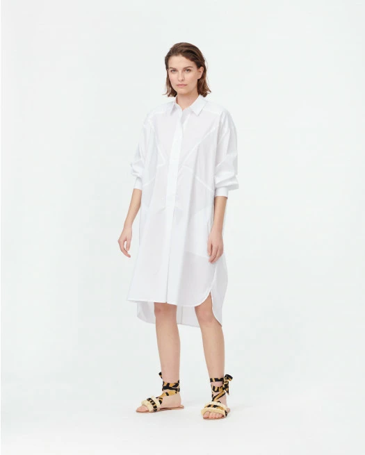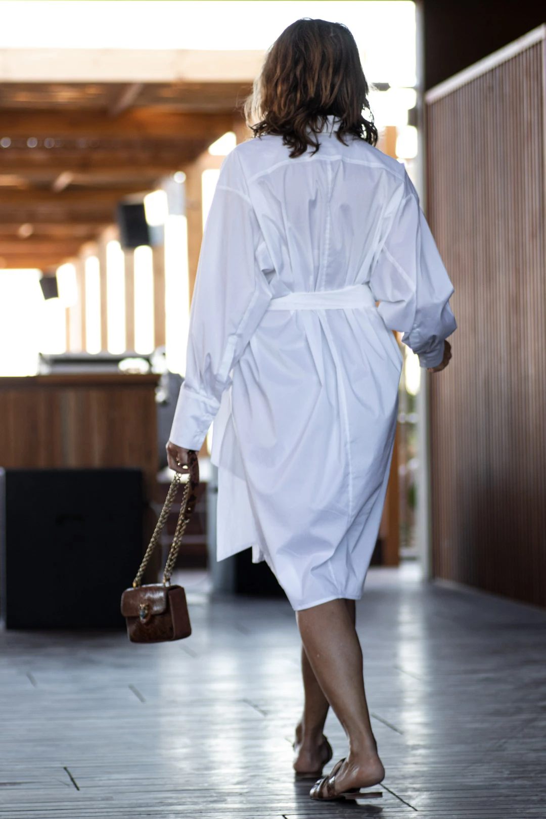 Shirt dress with small collar, belt in the waist and button closure at the chest.