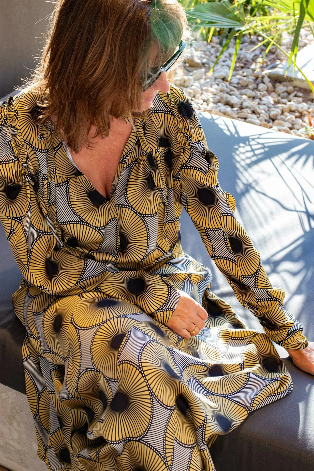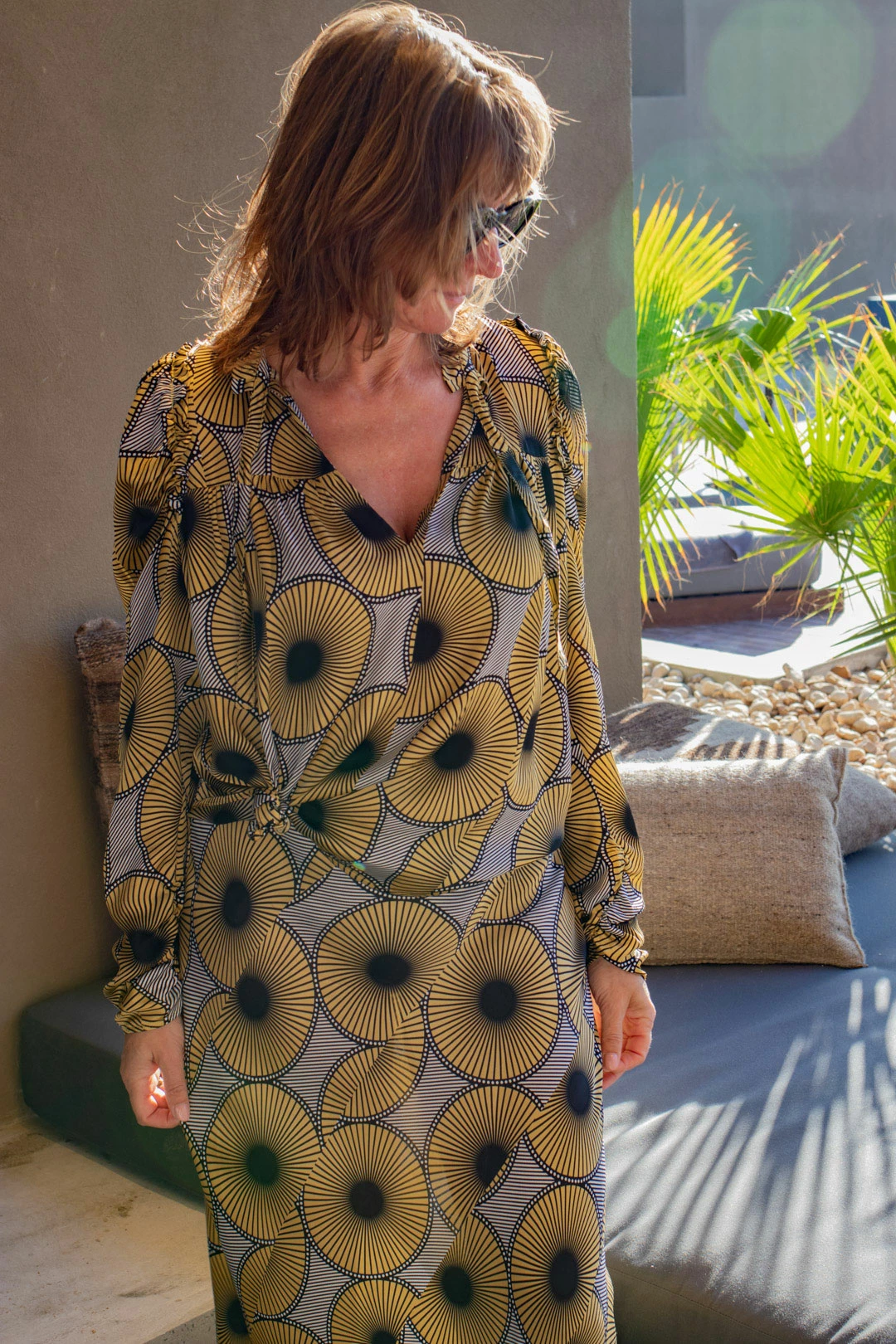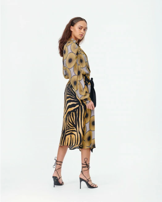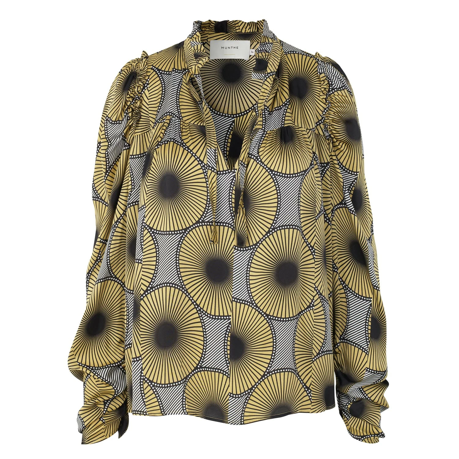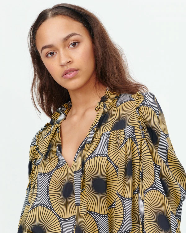 Beautiful shirt in print with puff sleeves and ruffle details. The shirt has stand-up collar and V-shaped opening at front with ties at top.