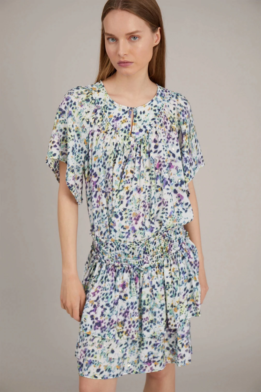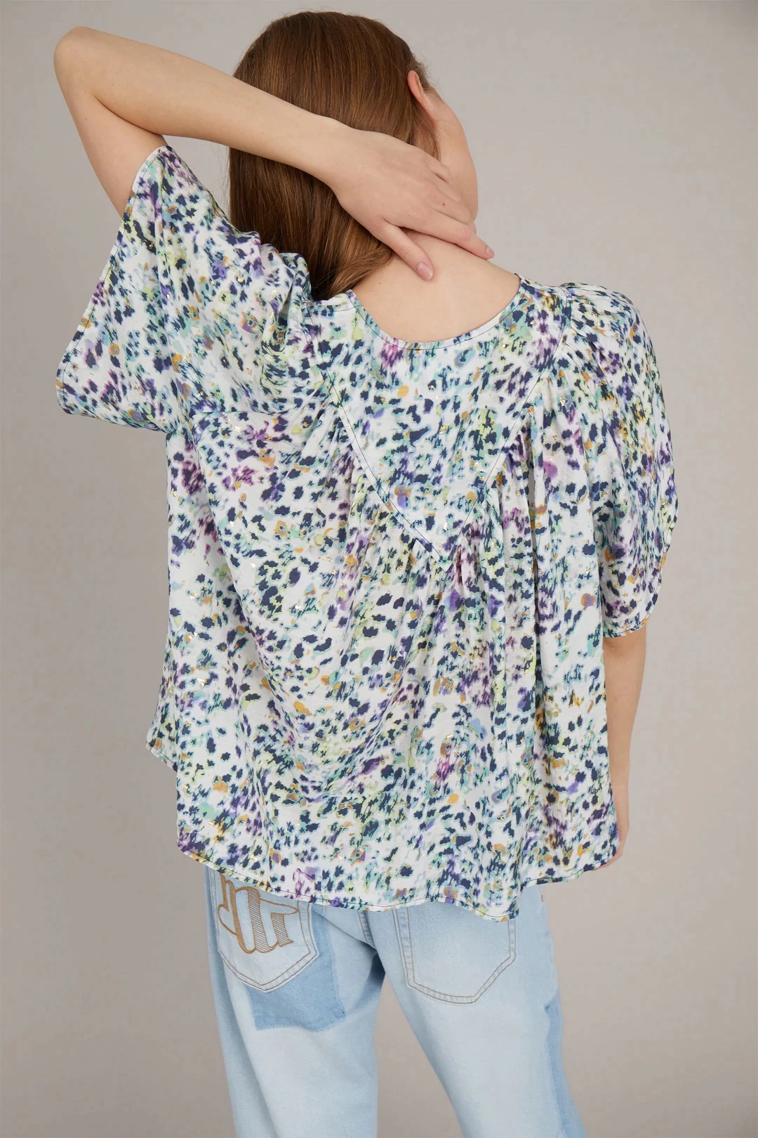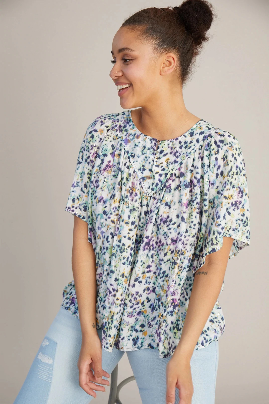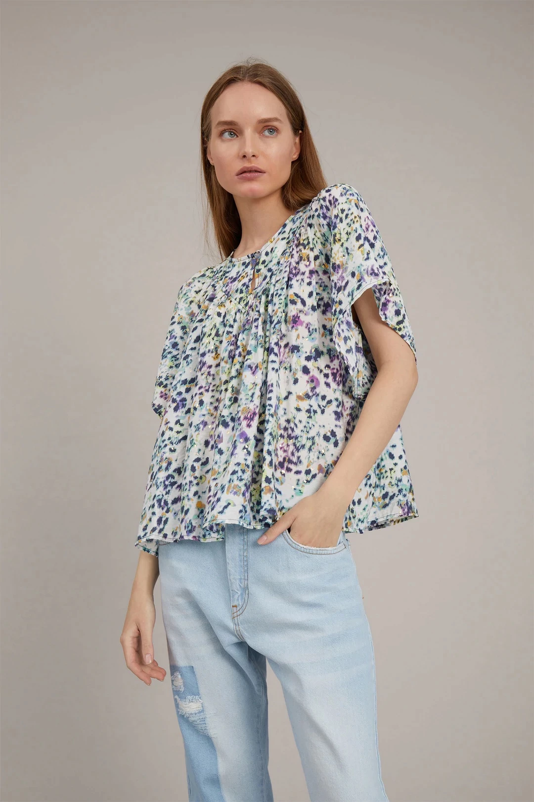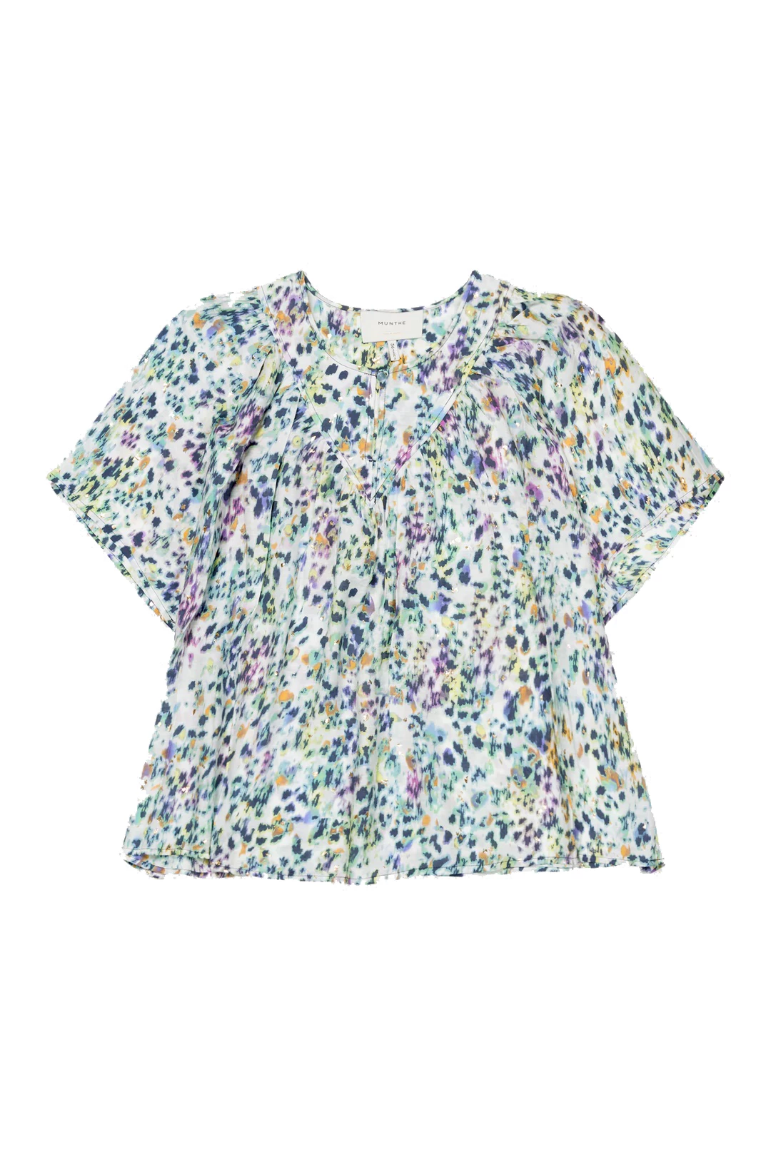 Short-sleeved top made from an Ecovero viscose blend, which is a sustainable viscose that meets high ecofriendly standards throughout the production process and comes from sustainable wood and paper. The top has a round neck with a slit and button closure and it is available in white with a beautiful print.