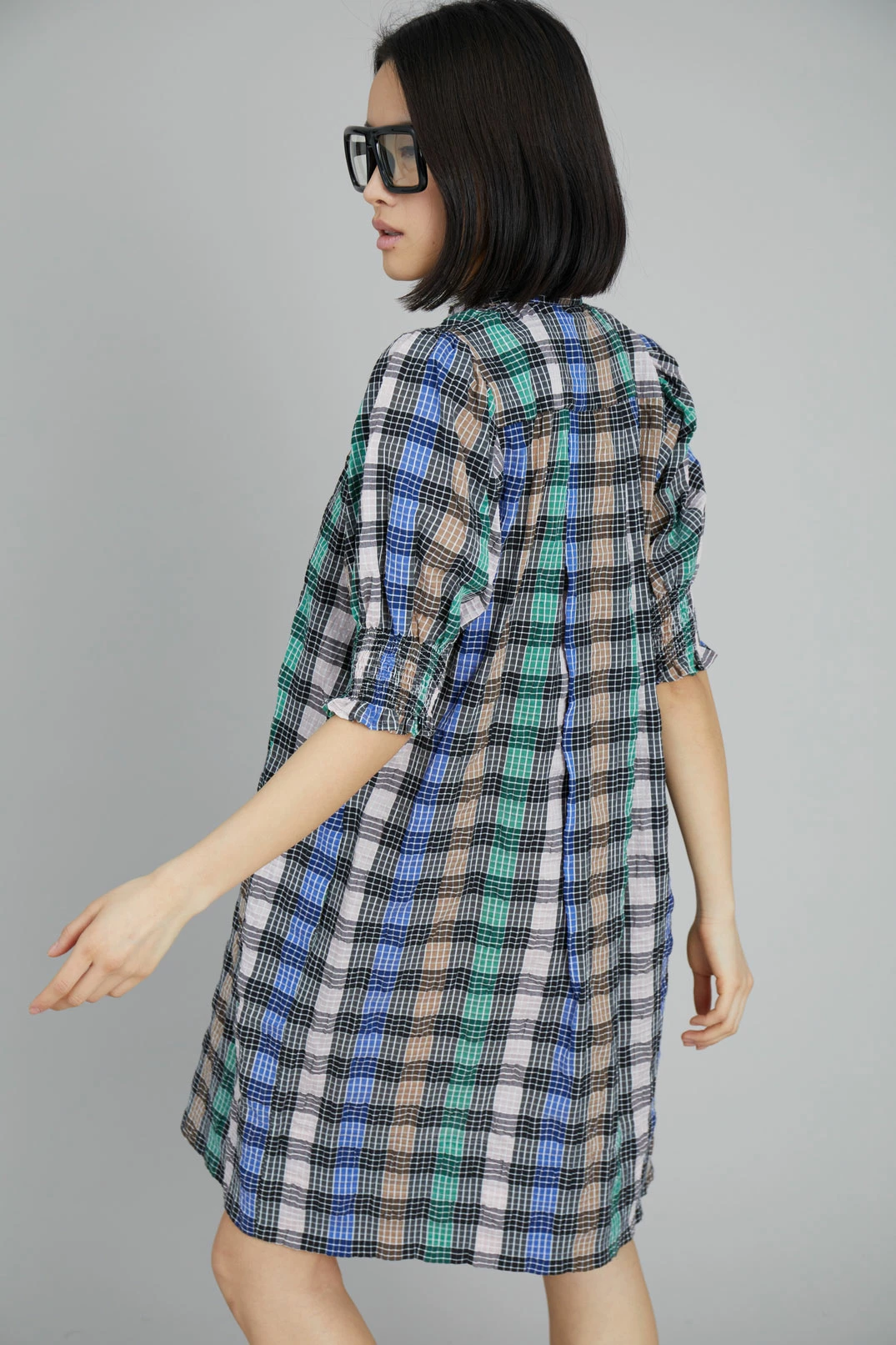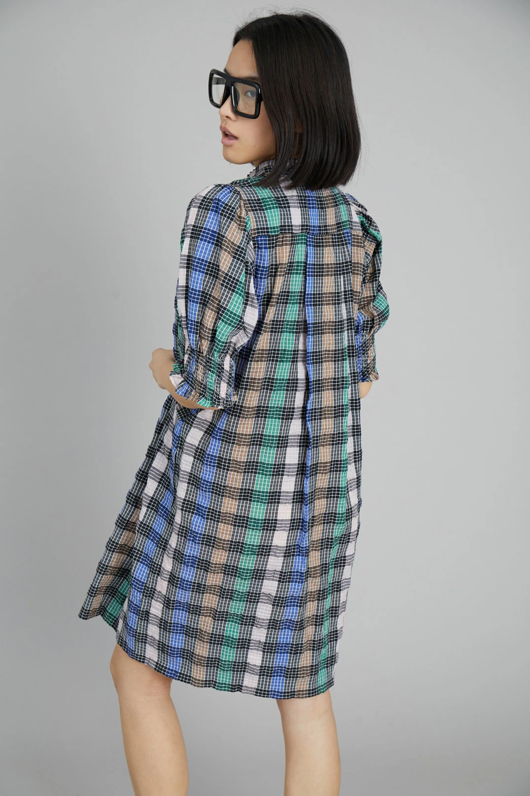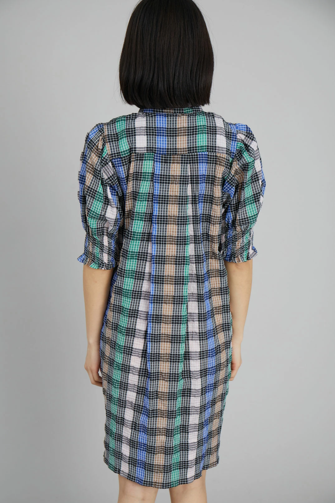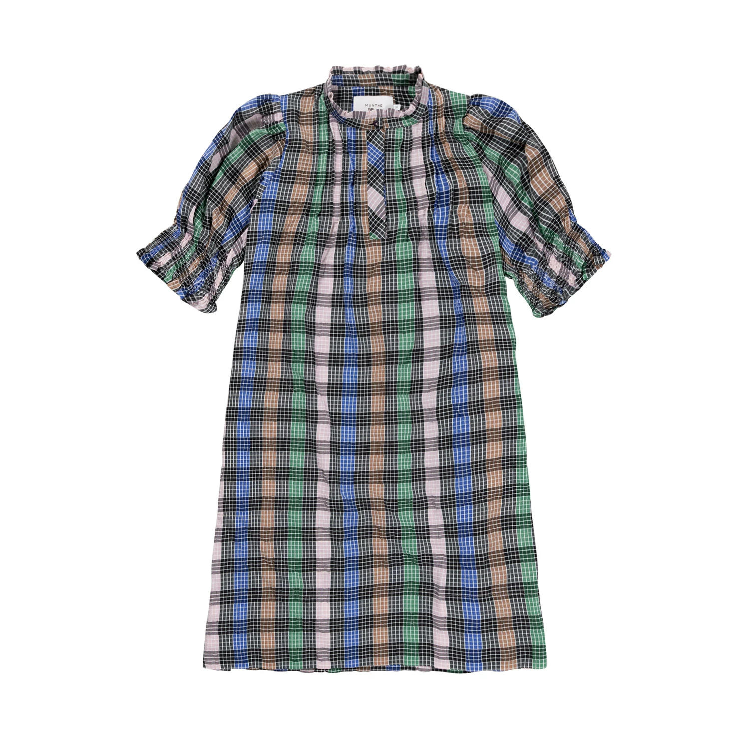 Short, checkered dress made from a recycled polyester and organic cotton blend. The Vantasic Dress has short puff sleeves with smock, collar with a small frill and button closure at the neck. Regular fit.