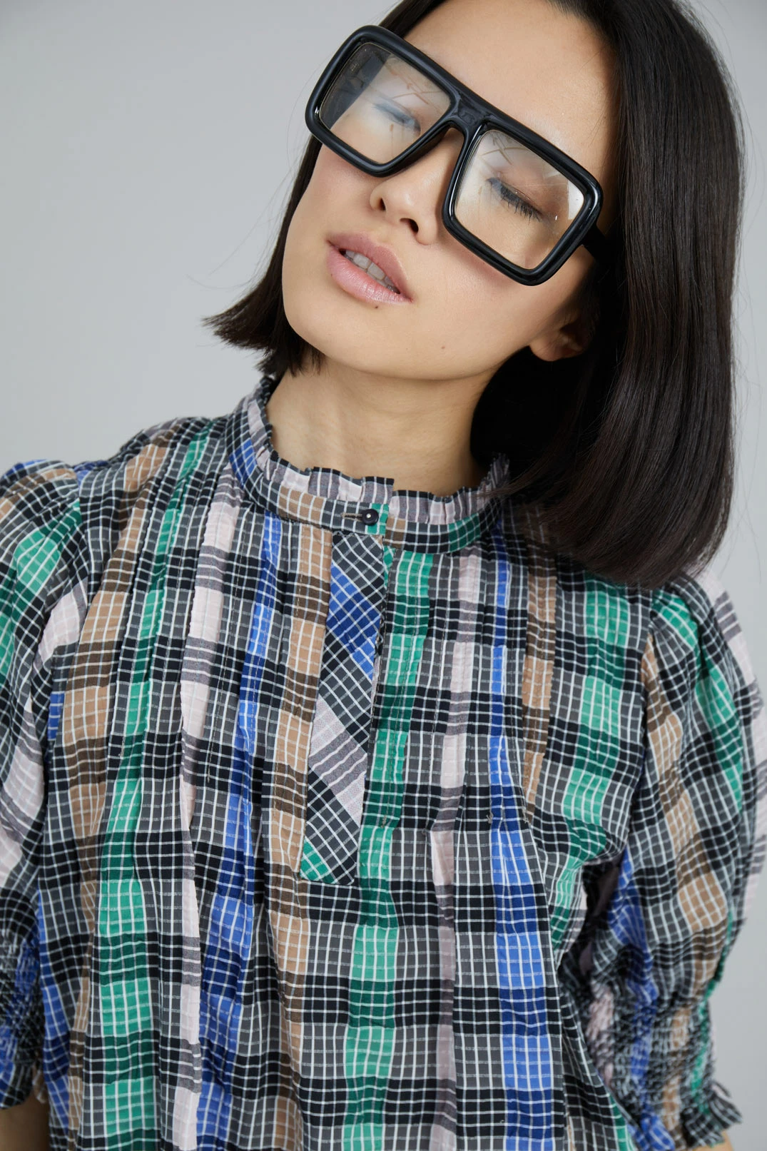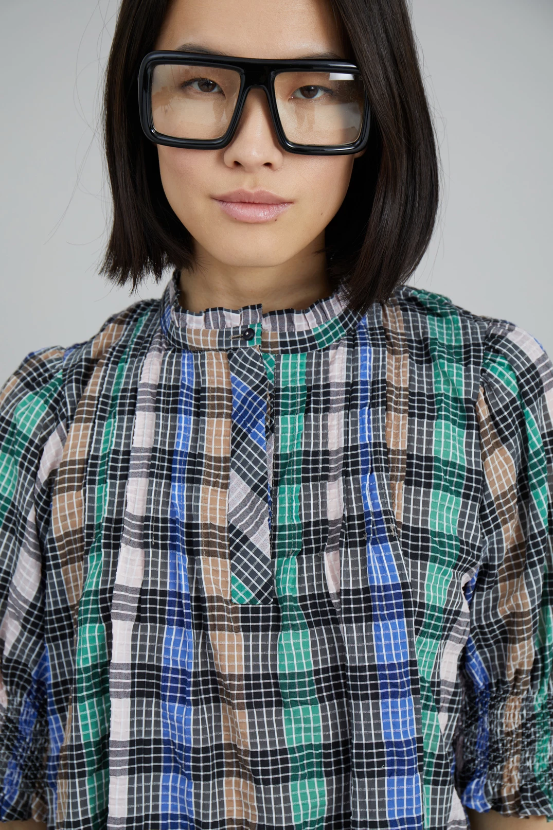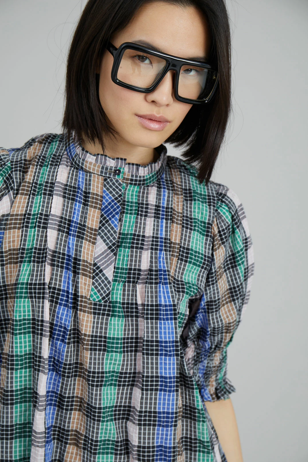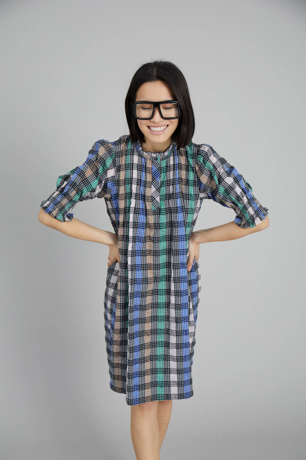 Short, checkered dress made from a recycled polyester and organic cotton blend. The Vantasic Dress has short puff sleeves with smock, collar with a small frill and button closure at the neck. Regular fit.