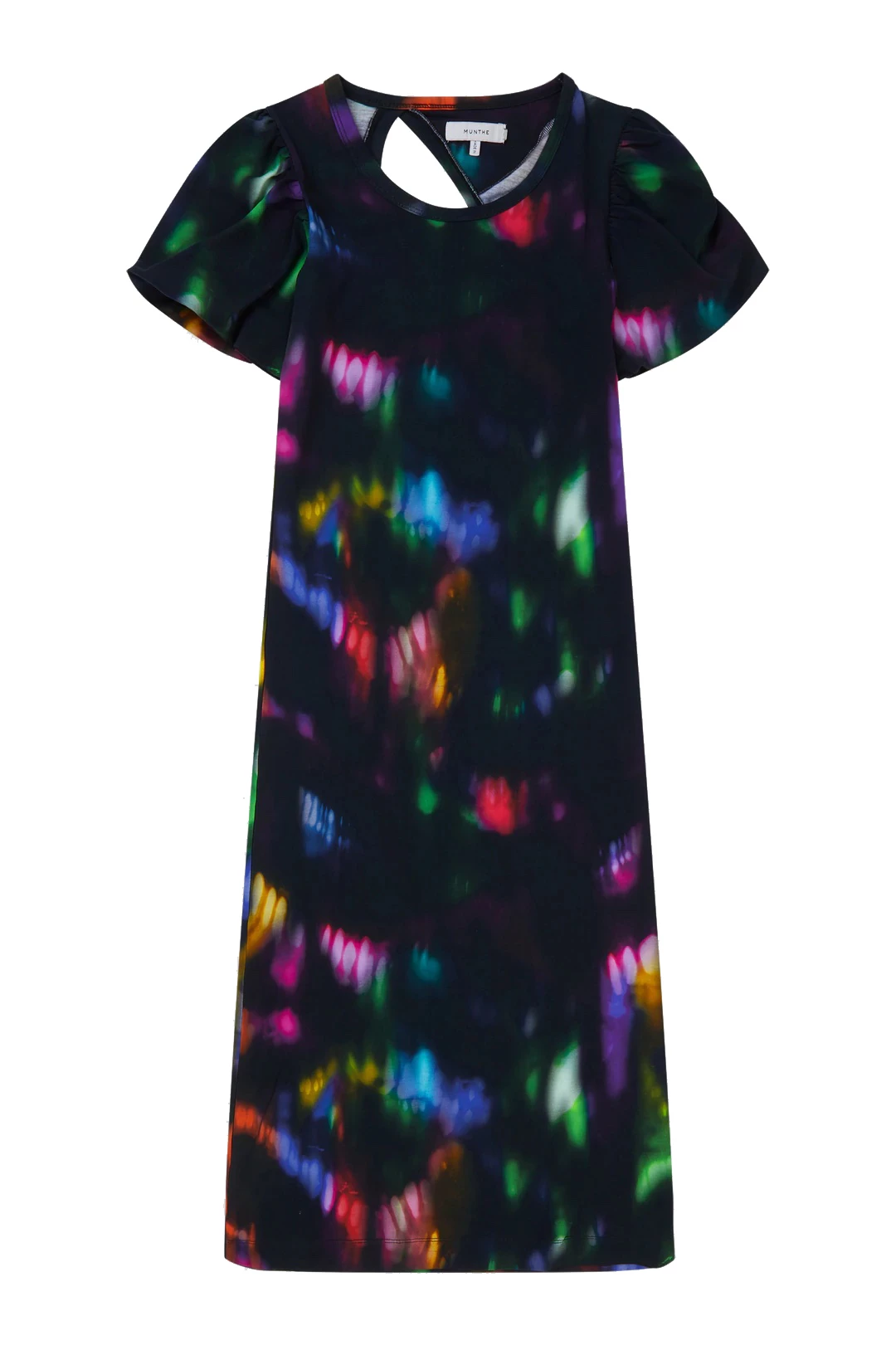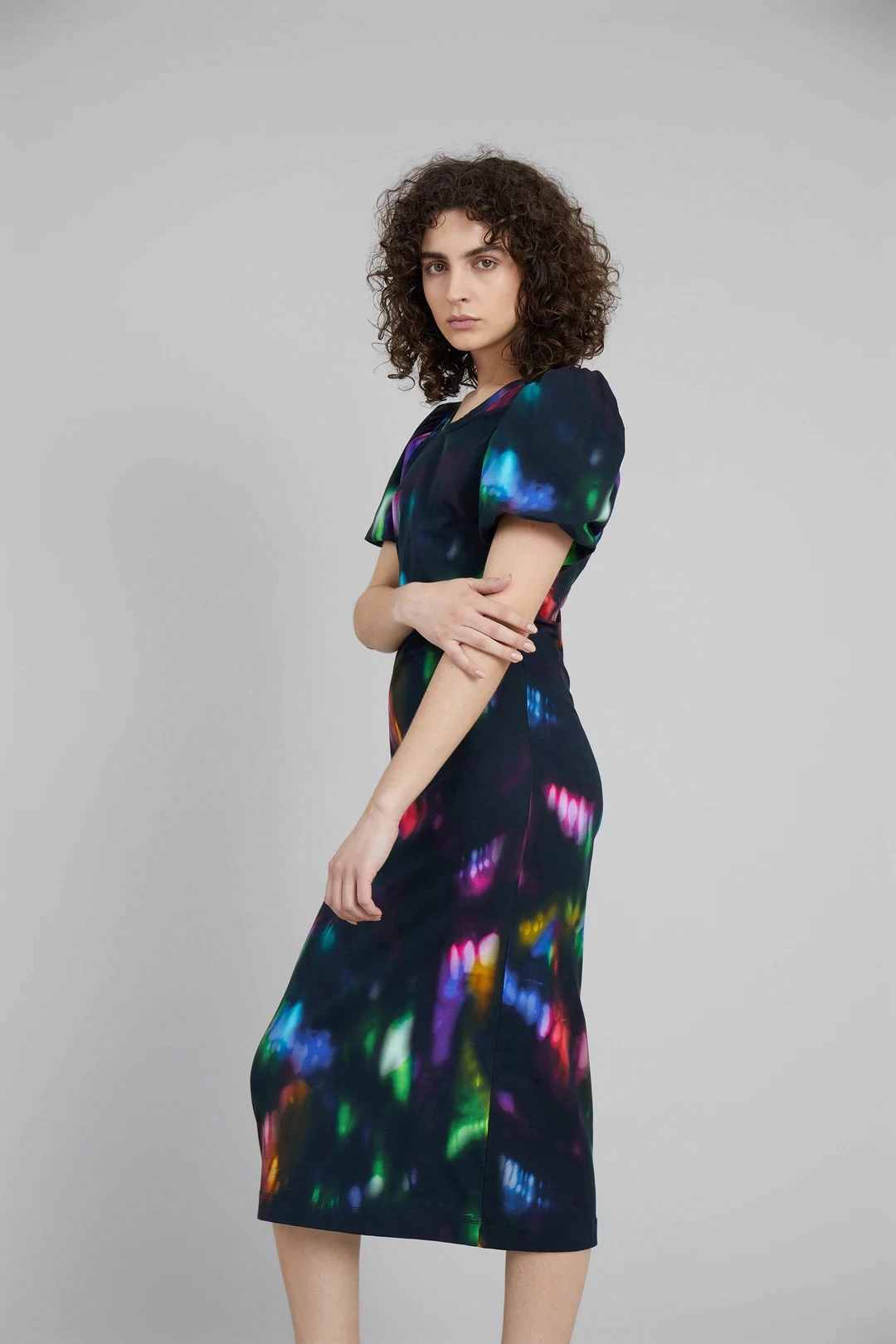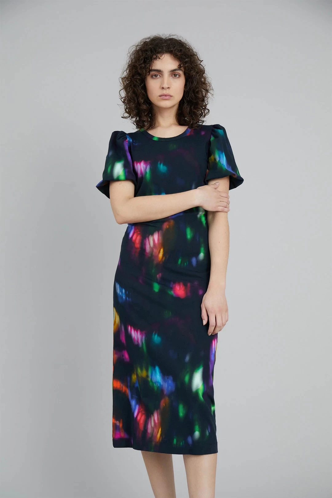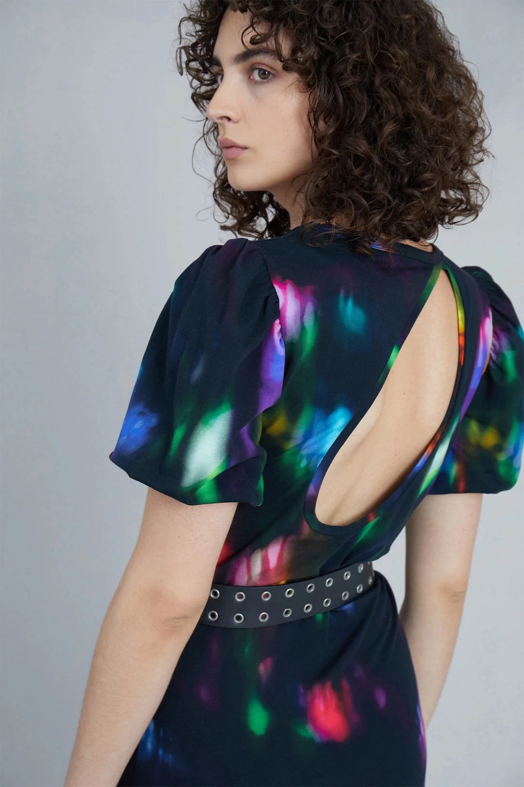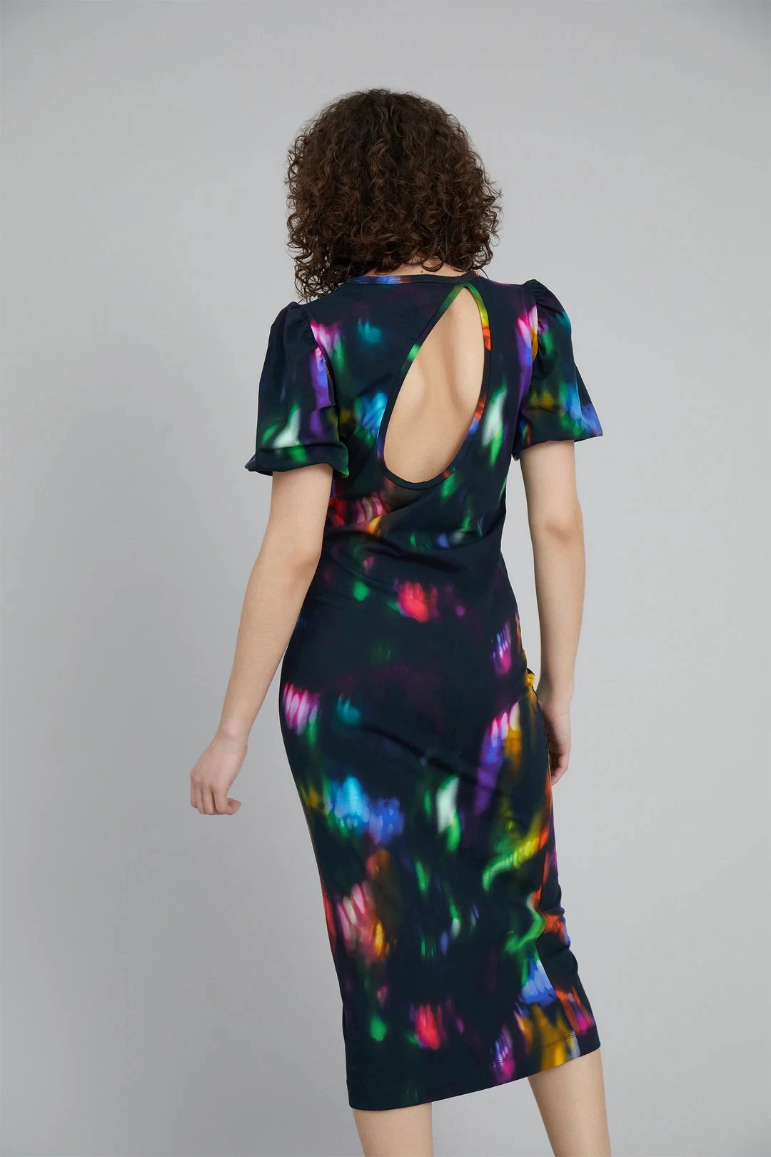 Slim fitted, long dress in organic cotton. The dress has short puff sleeves, a round neck and an asymmetric cutout at the back. Available in black with a cool print.