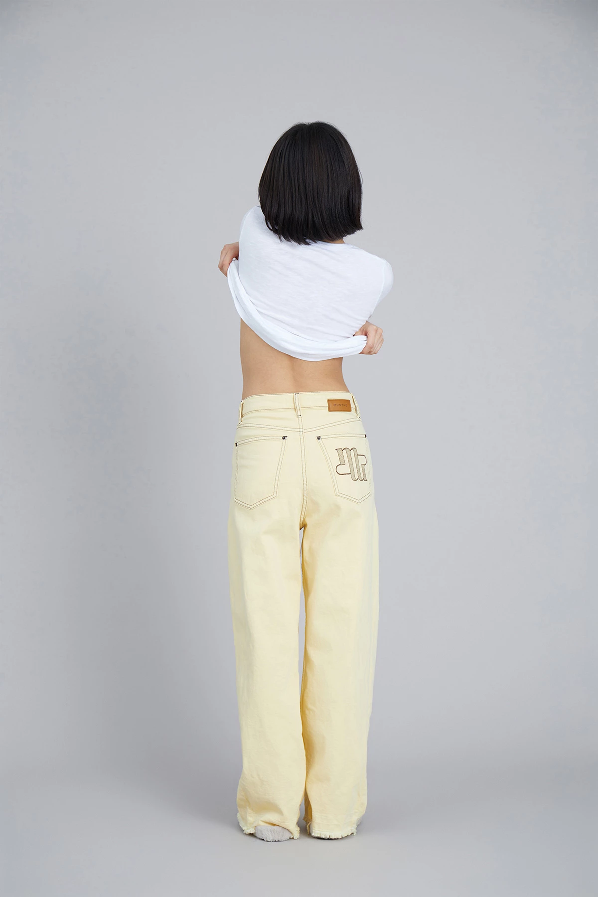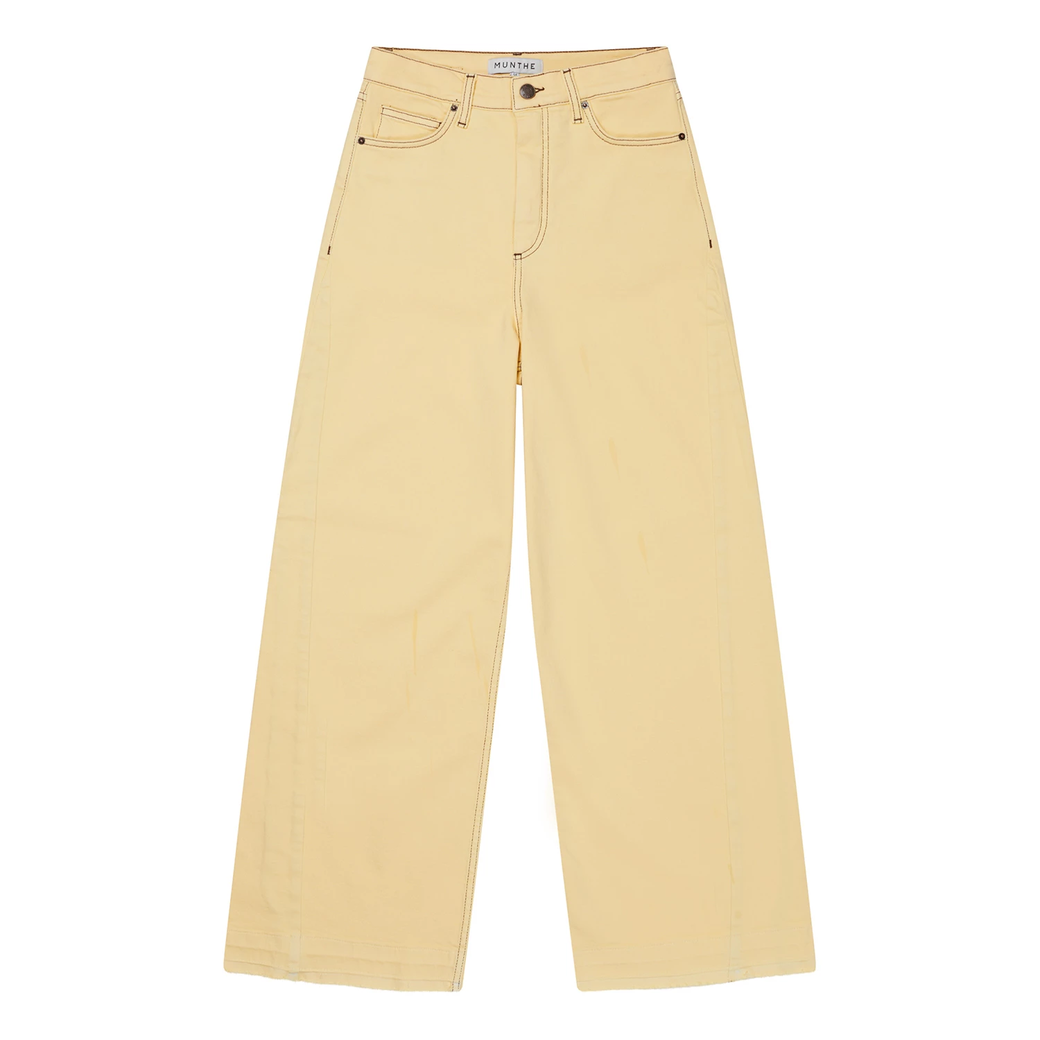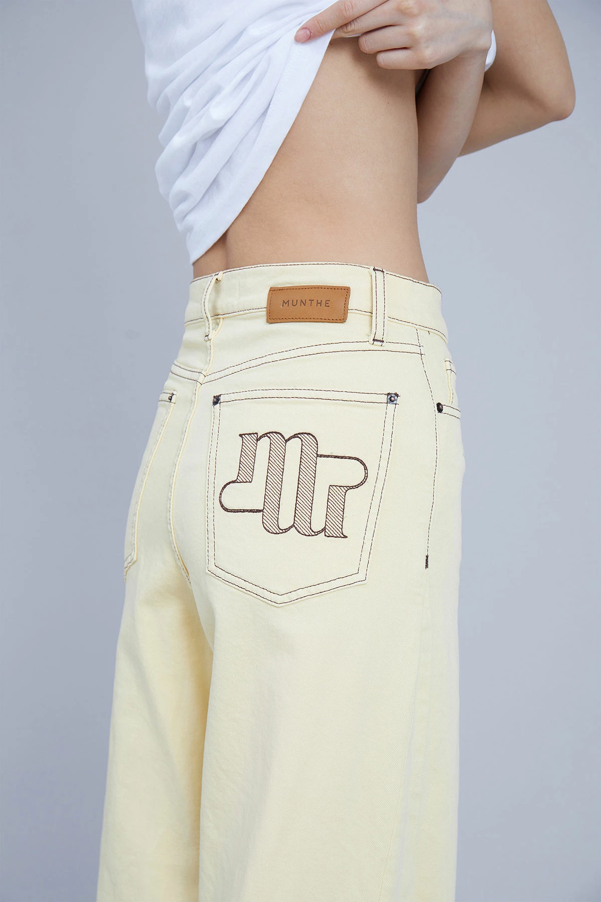 Cool jeans in organic cotton. The Vizor Pants have wide legs, pockets front and back, a MUNTHE embroidery at the right back pocket and a raw edge at the bottom. Regular fit.