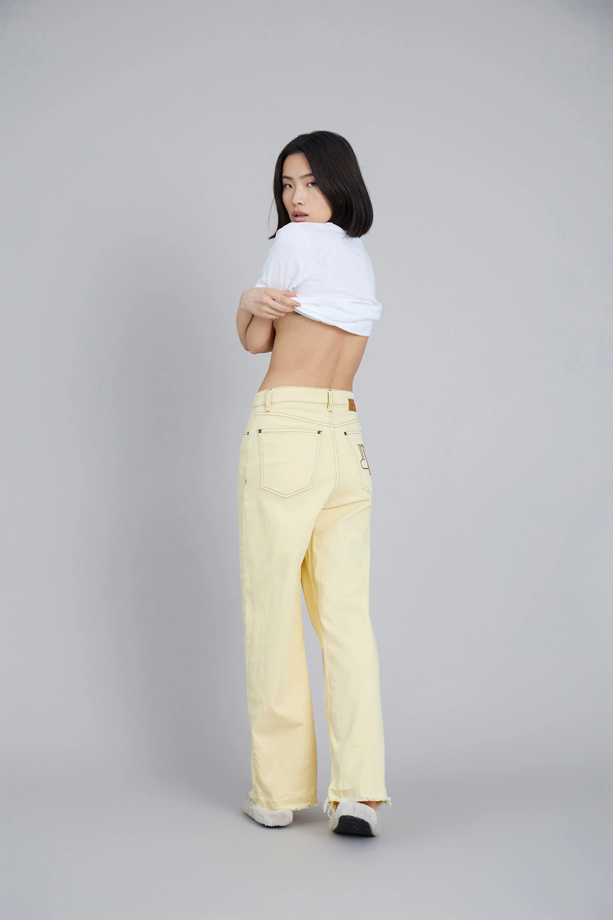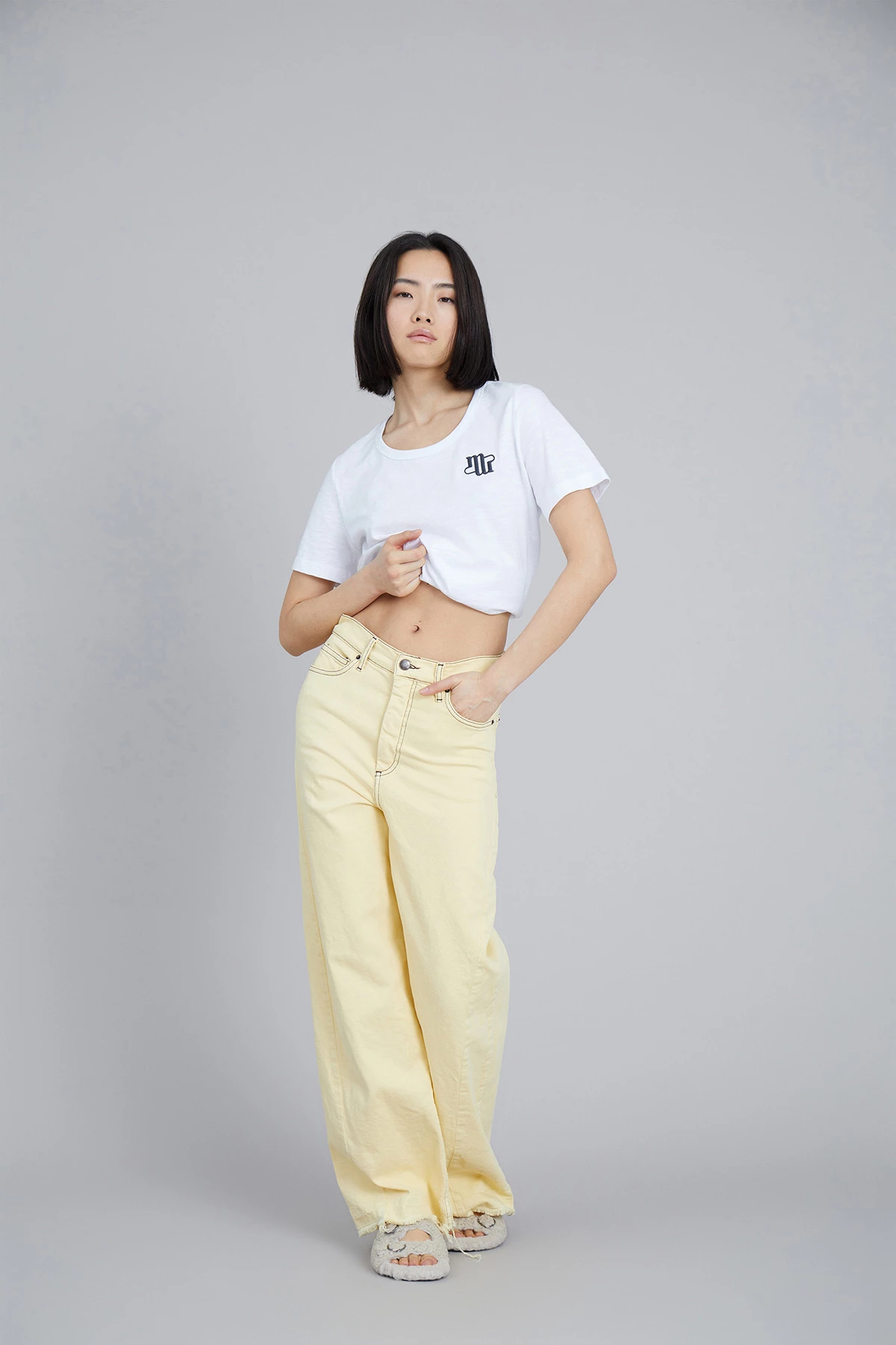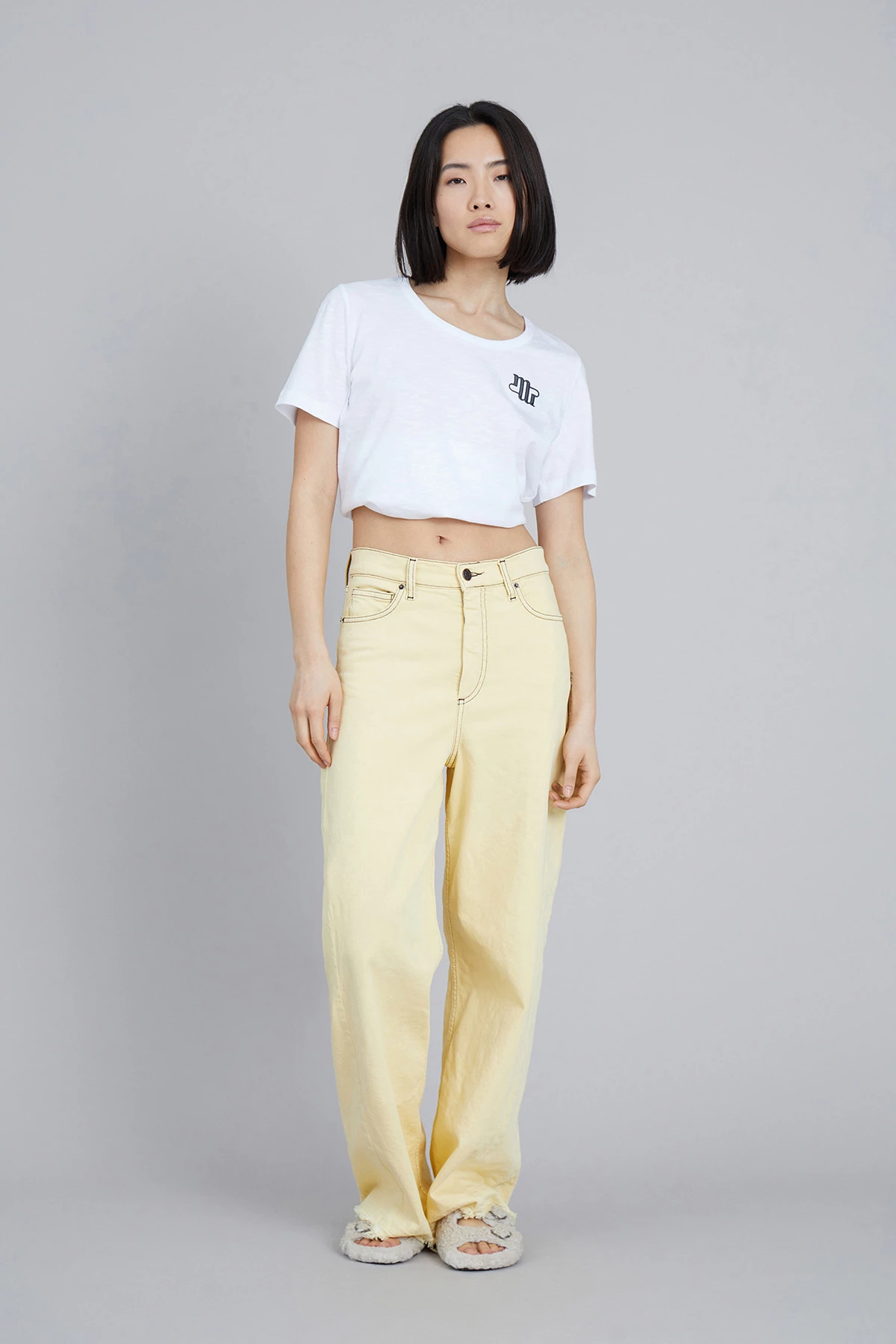Cool jeans in organic cotton. The Vizor Pants have wide legs, pockets front and back, a MUNTHE embroidery at the right back pocket and a raw edge at the bottom. Regular fit.