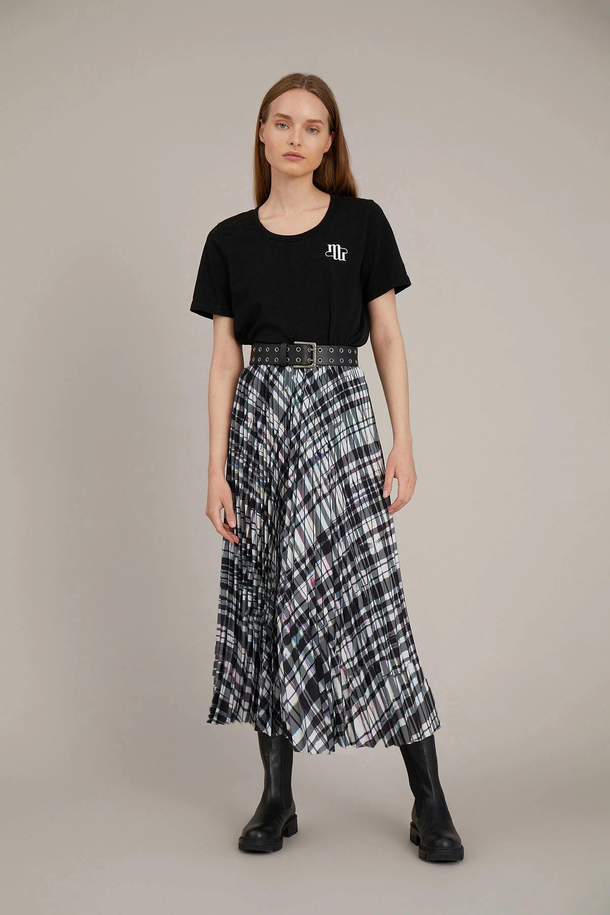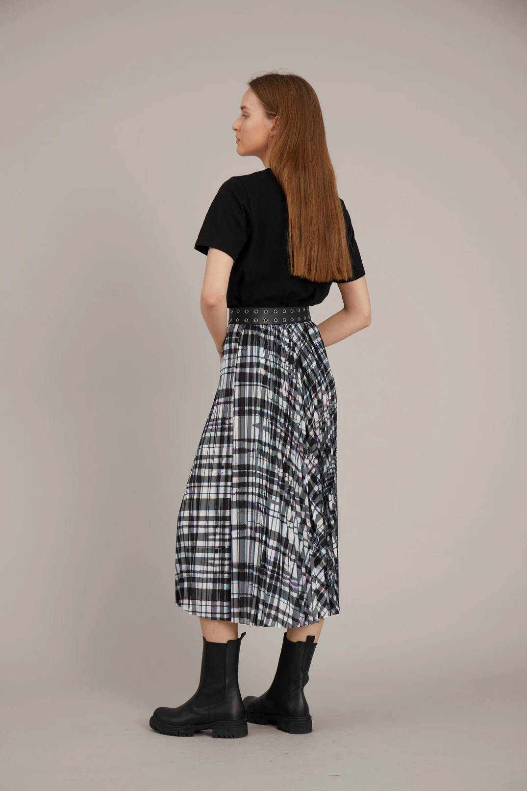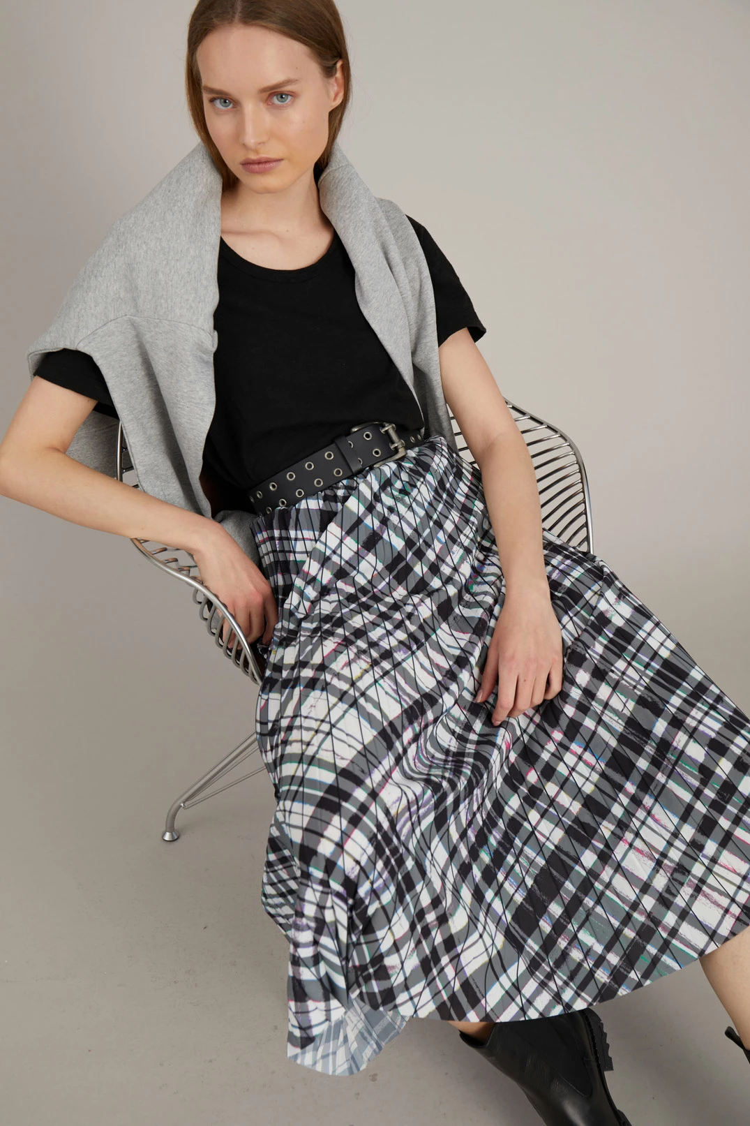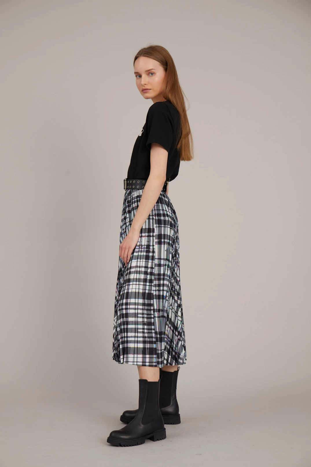 Midi-long, pleated skirt made from a recycled polyester blend. The Volume Skirt has an elastic waist and is available in granite with a pretty, checkered print.