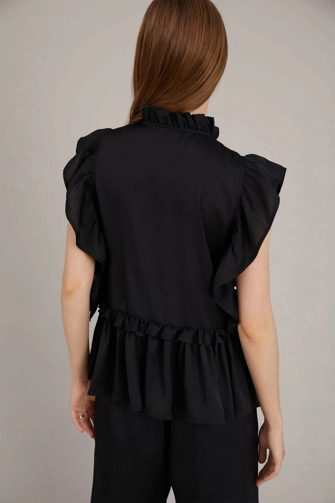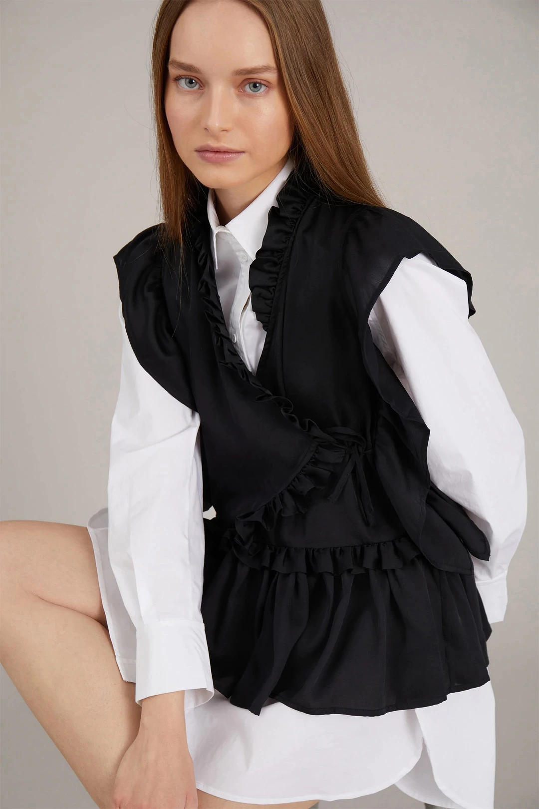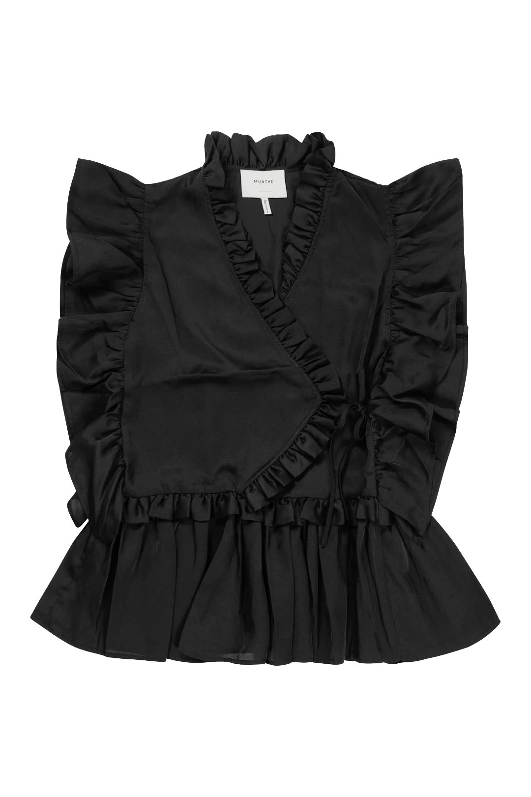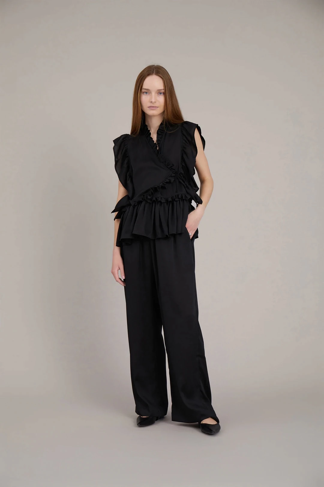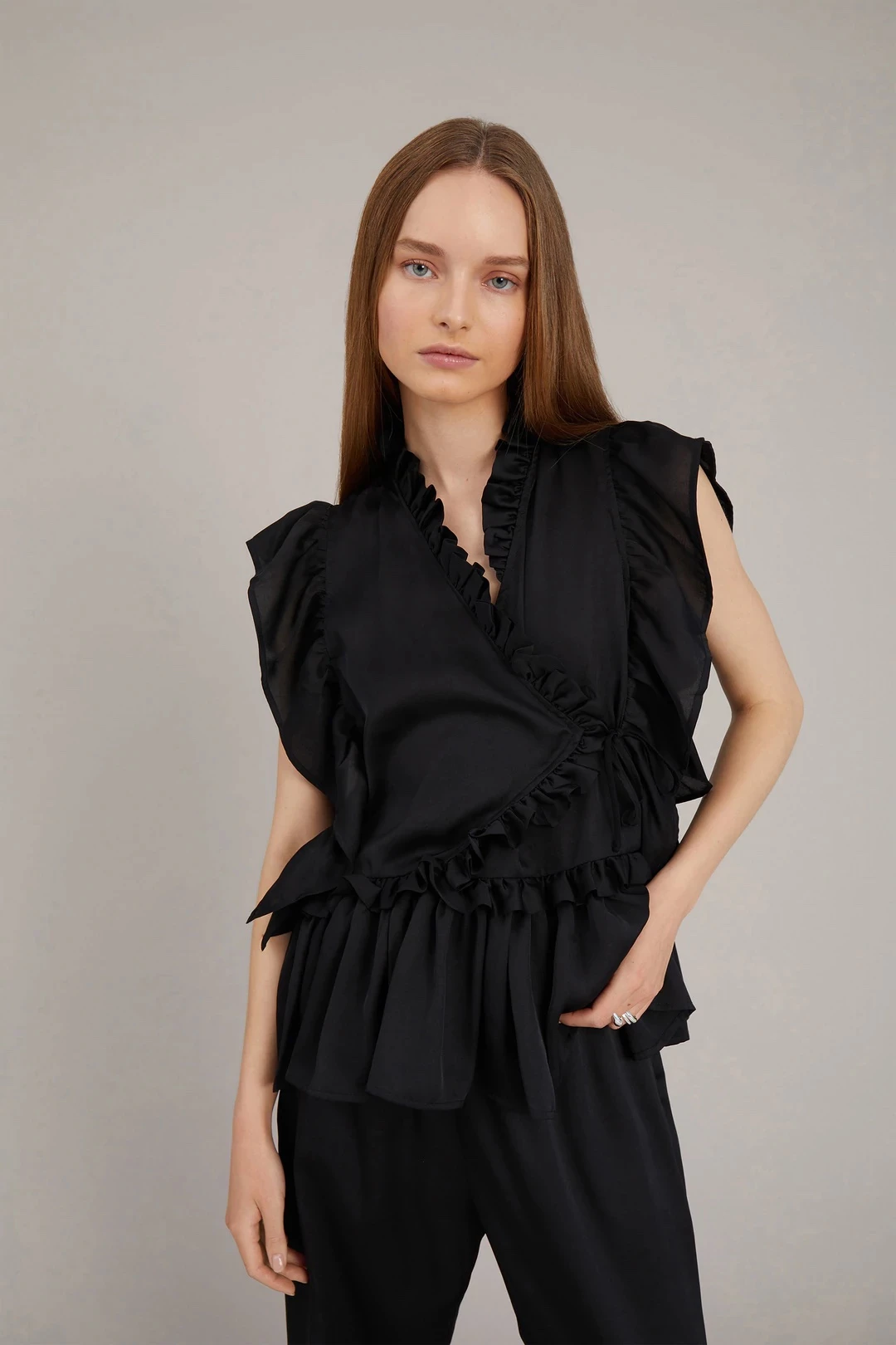 Feminine, sleeveless top made from 100% recycled polyester. The top has a wrap-effect with tie closure and beautiful frill details along the neckline, armholes, front and back. Regular fit.