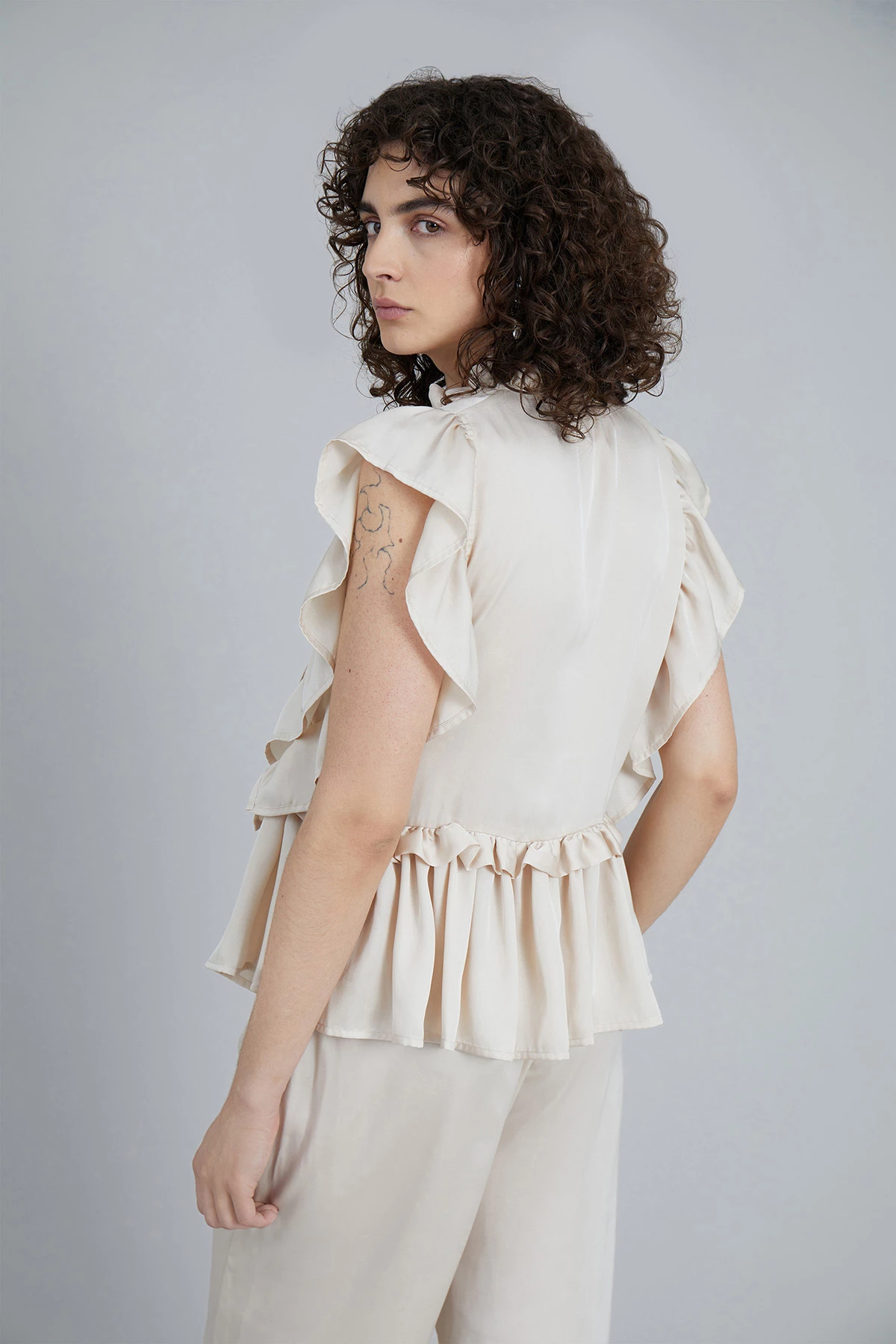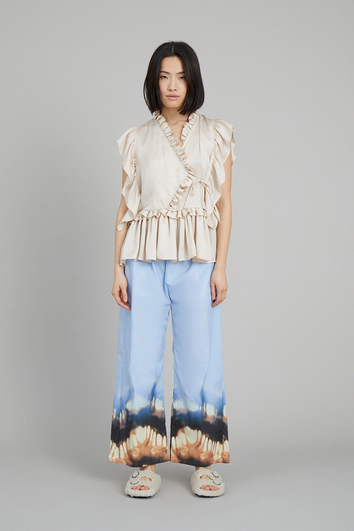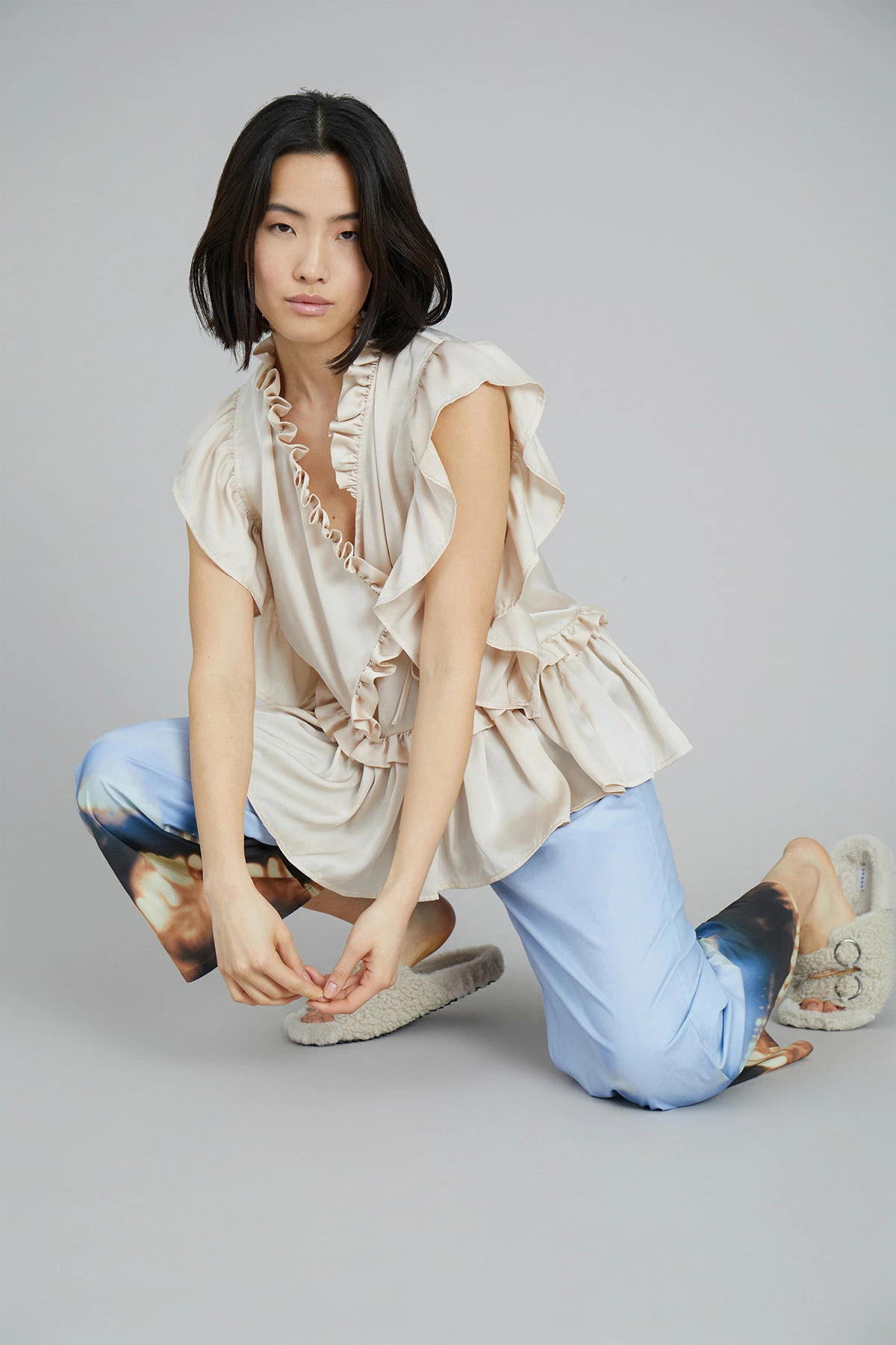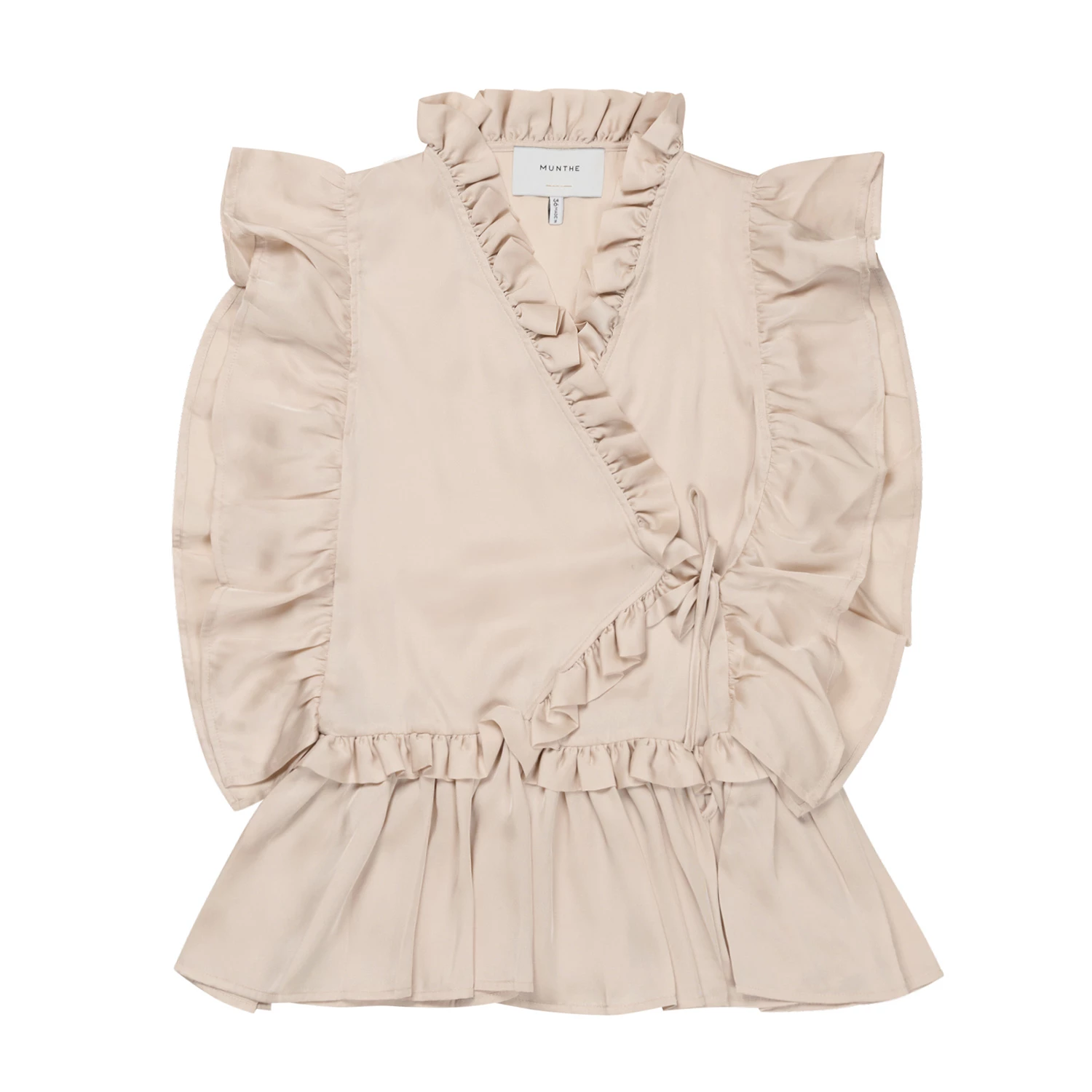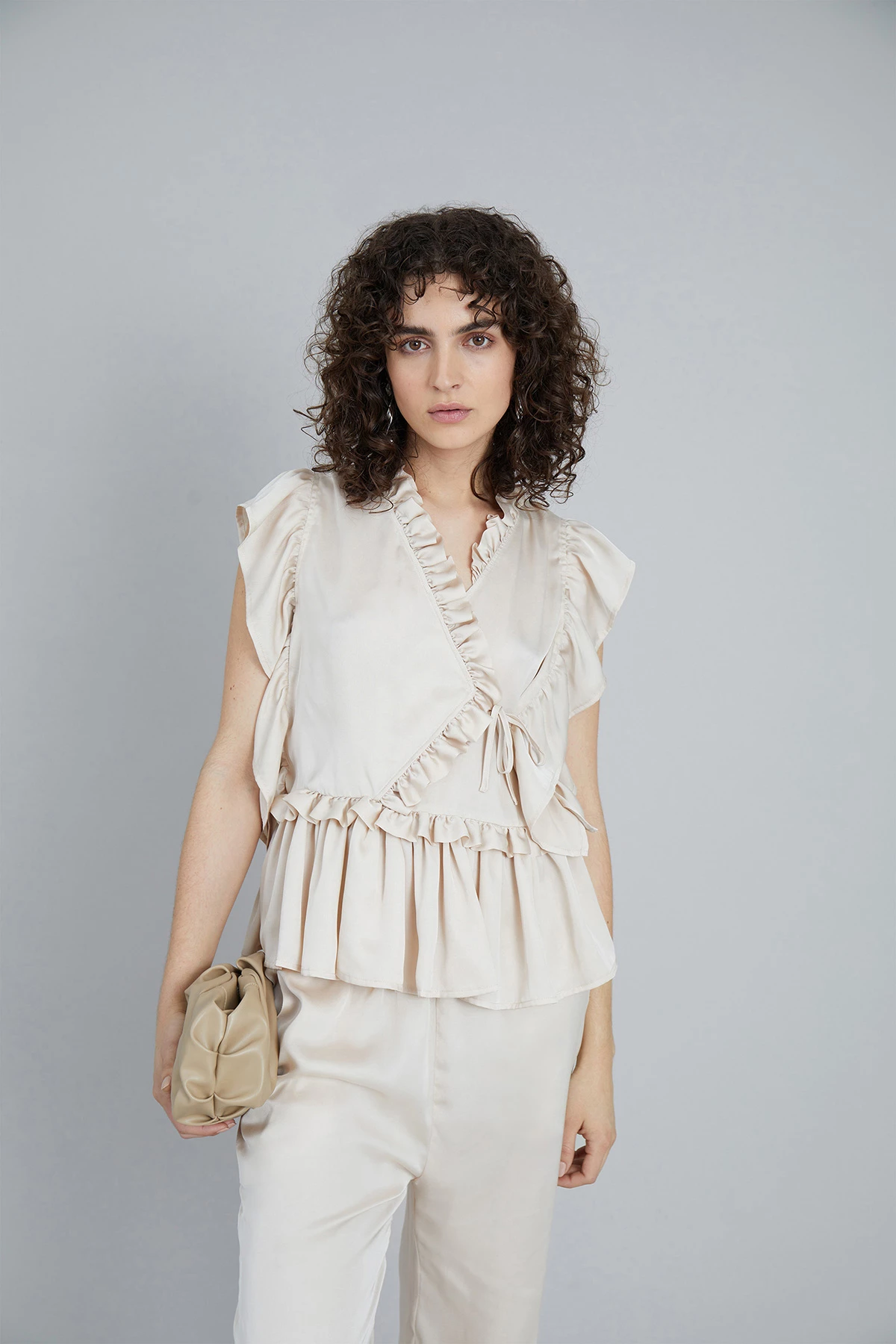 Feminine, sleeveless top made from 100% recycled polyester. The Vox top has a wrap-effect with tie closure and beautiful frill details along the neckline, armholes, front and back. Regular fit.