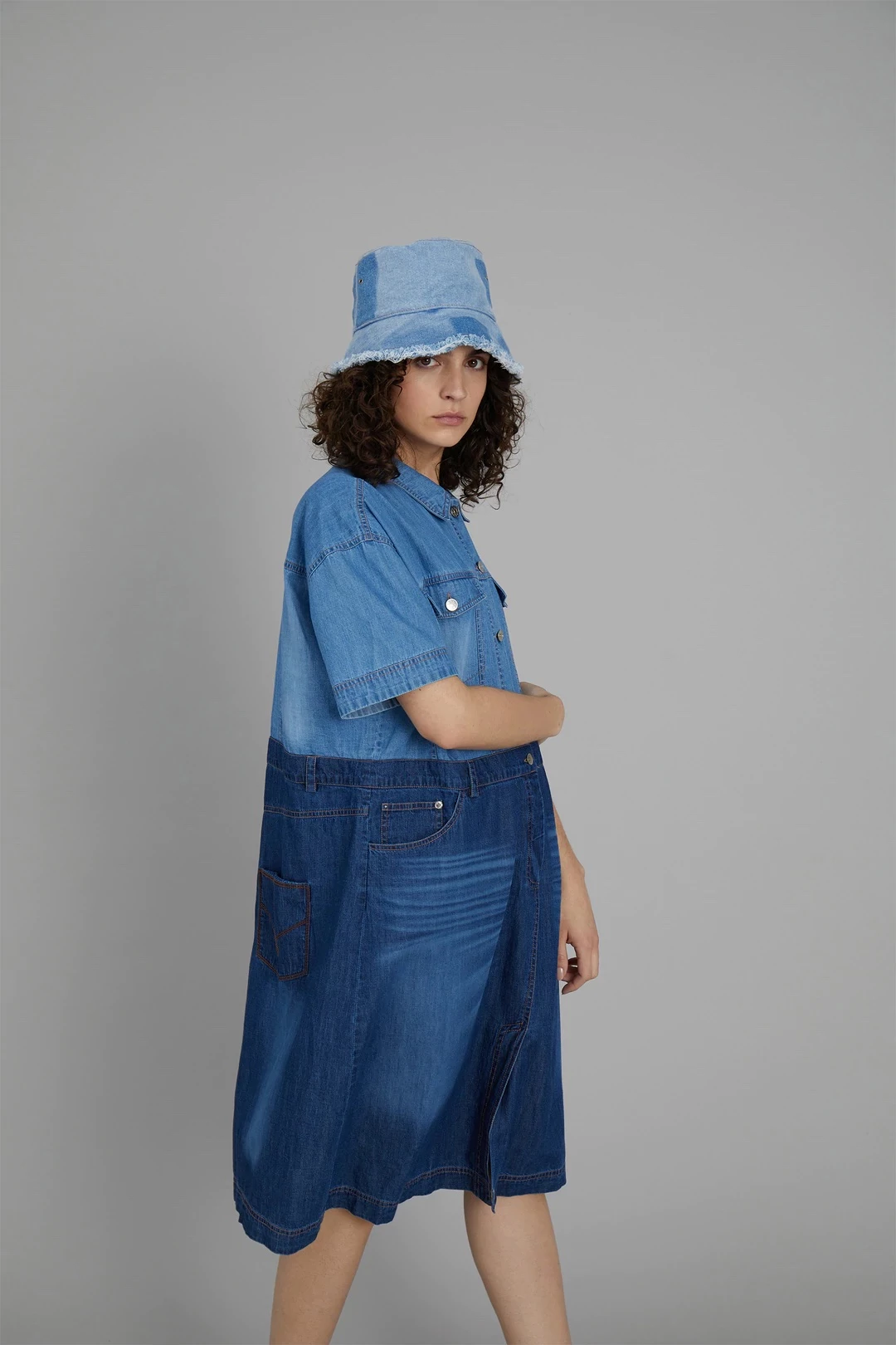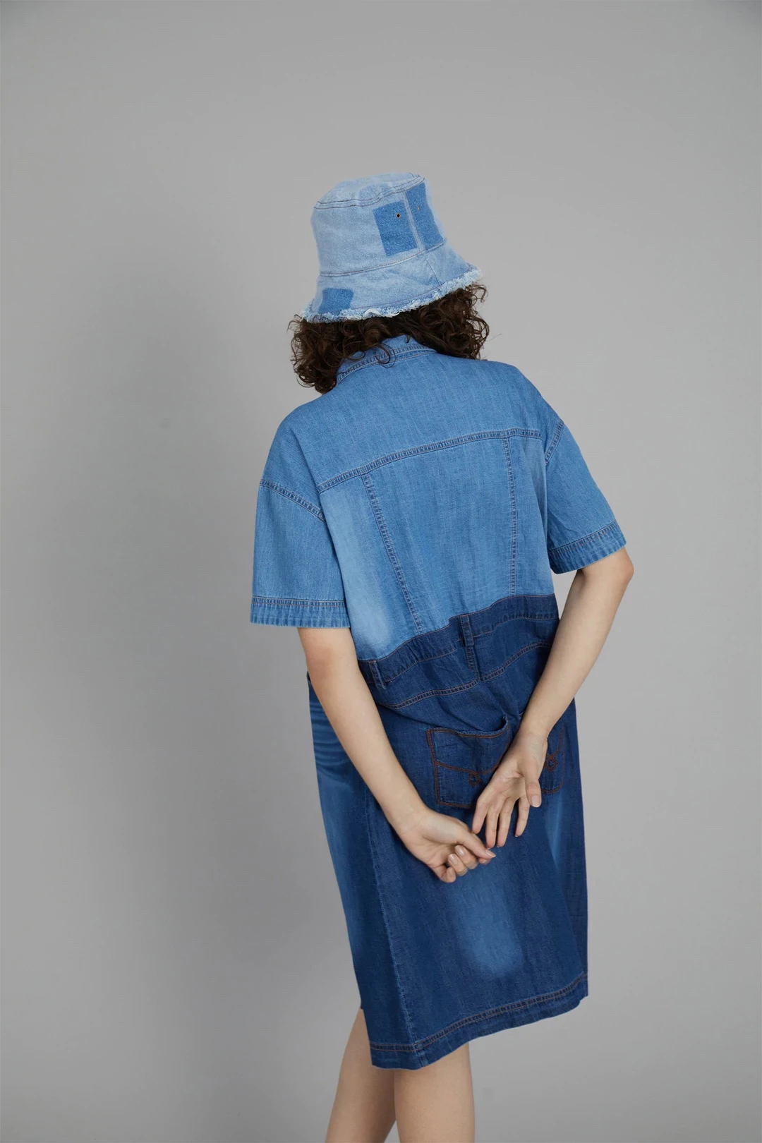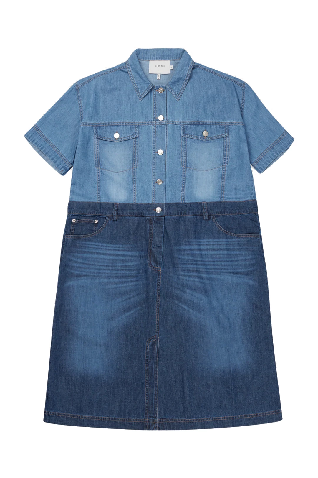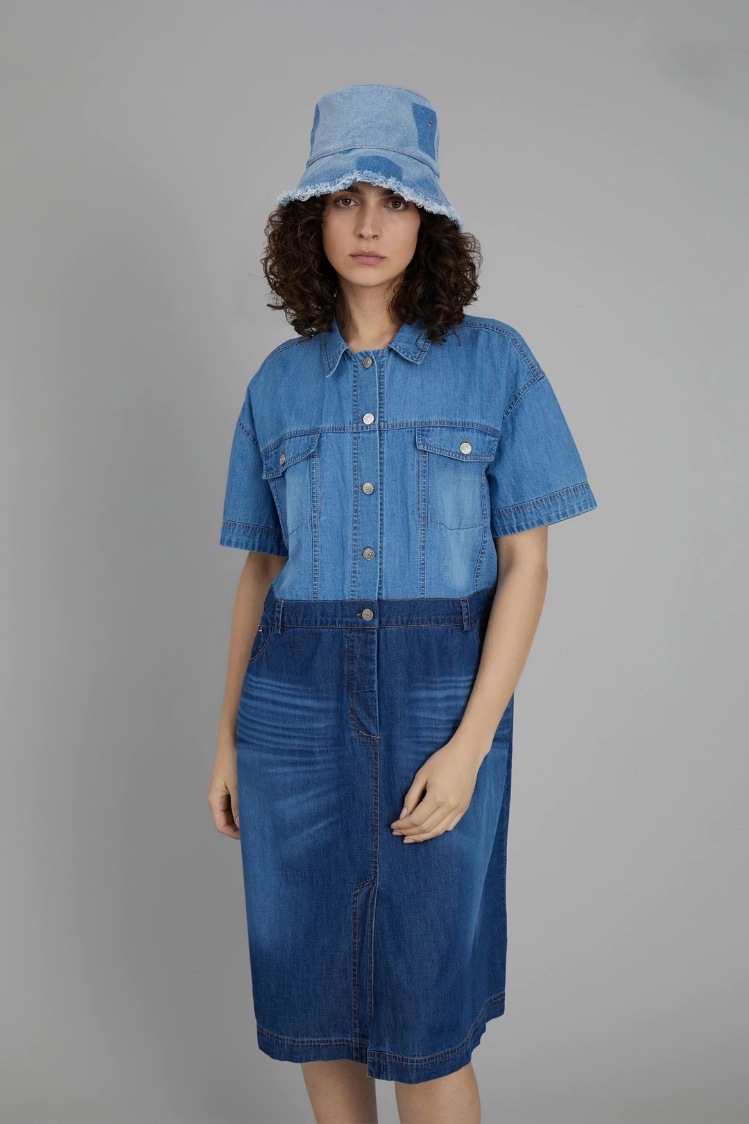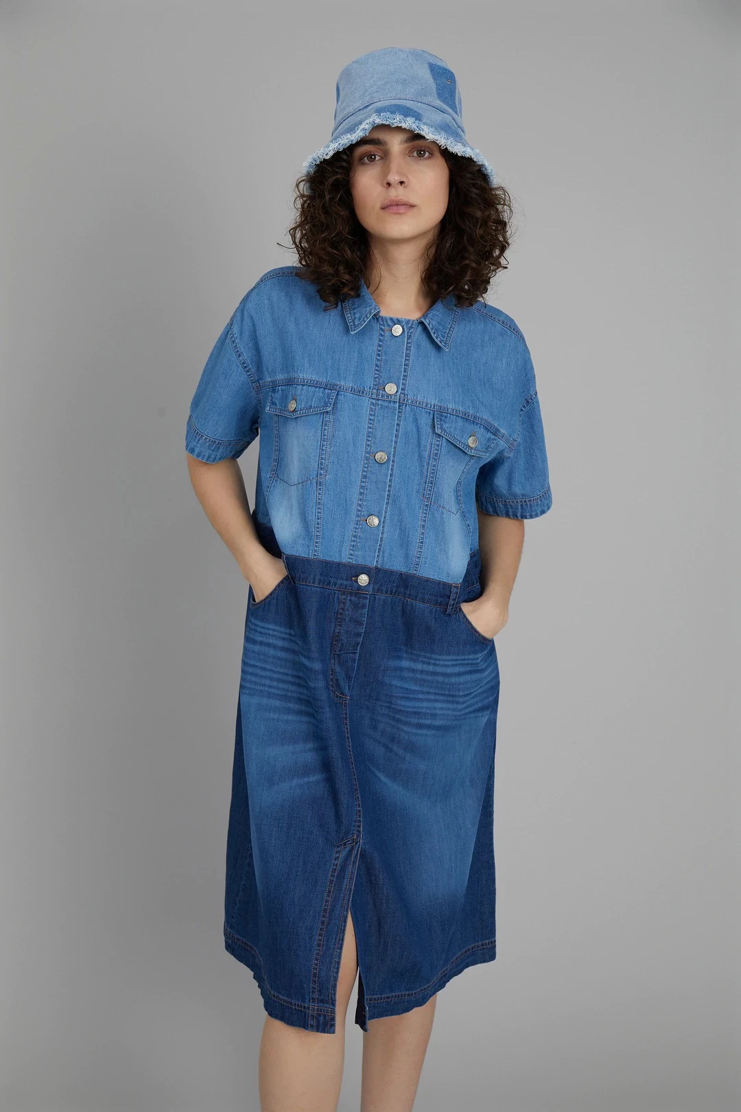 Knee-long, denim dress in two different shades. The dress has short sleeves, a regular shirt collar, button closure at the front, a slit at the bottom and pockets at the chest, front and back. Regular fit. Available in blue.