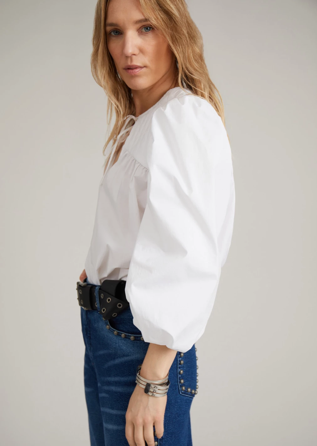 A gorgeous voluminous sleeve top crafted in a soft organic cotton, designed with a flattering deep V-neck with a string tie, three-quarter length puff sleeves and front and back yoke with padding effect. Pair with our DL1961 Mara straight leg jeans for a stylish everyday look.