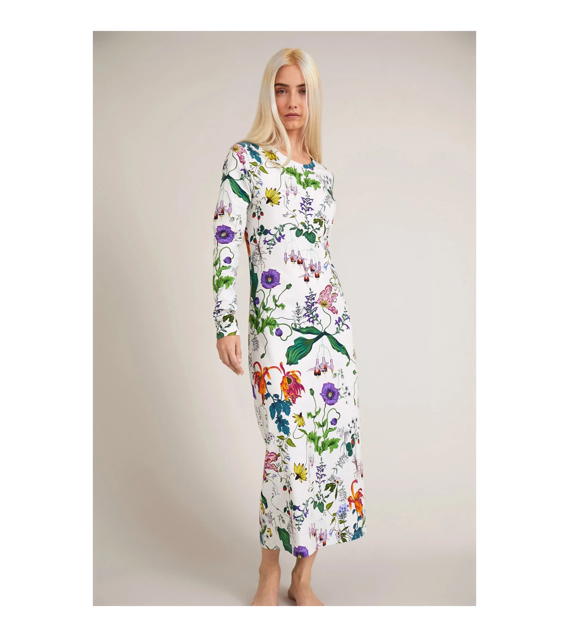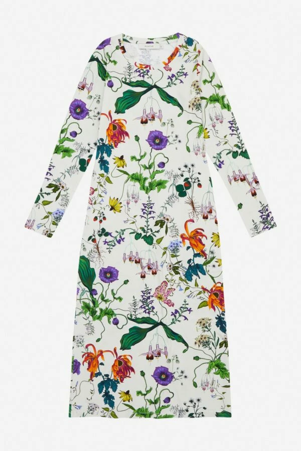 Cork long sleeve dress in white by Munthe. Maxi dress in organic cotton. Featuring a round neck and long sleeves. Designed in a flattering and feminine tight silhouette. Available in white with a pretty floral print all over. Pair with RAILS military jacket for a casual boho chic look or with heels for an updated elegant outfit. Features: Composition: 95% organic cotton, 5% elastane. Fit: regular. Long sleeves. Length: maxi. Bohemian inspired style. Flattering, tight silhouette.